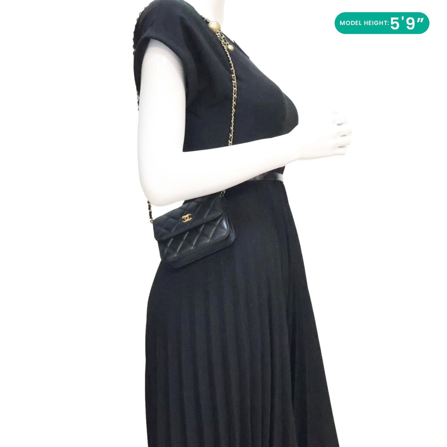 The CHANEL Pearl Crush Clutch With Chain in black quilted leather features a signature CC turn-lock and an adjustable chain with pearl detail. This elegant mini bag offers a chic, hands-free option for carrying essentials.