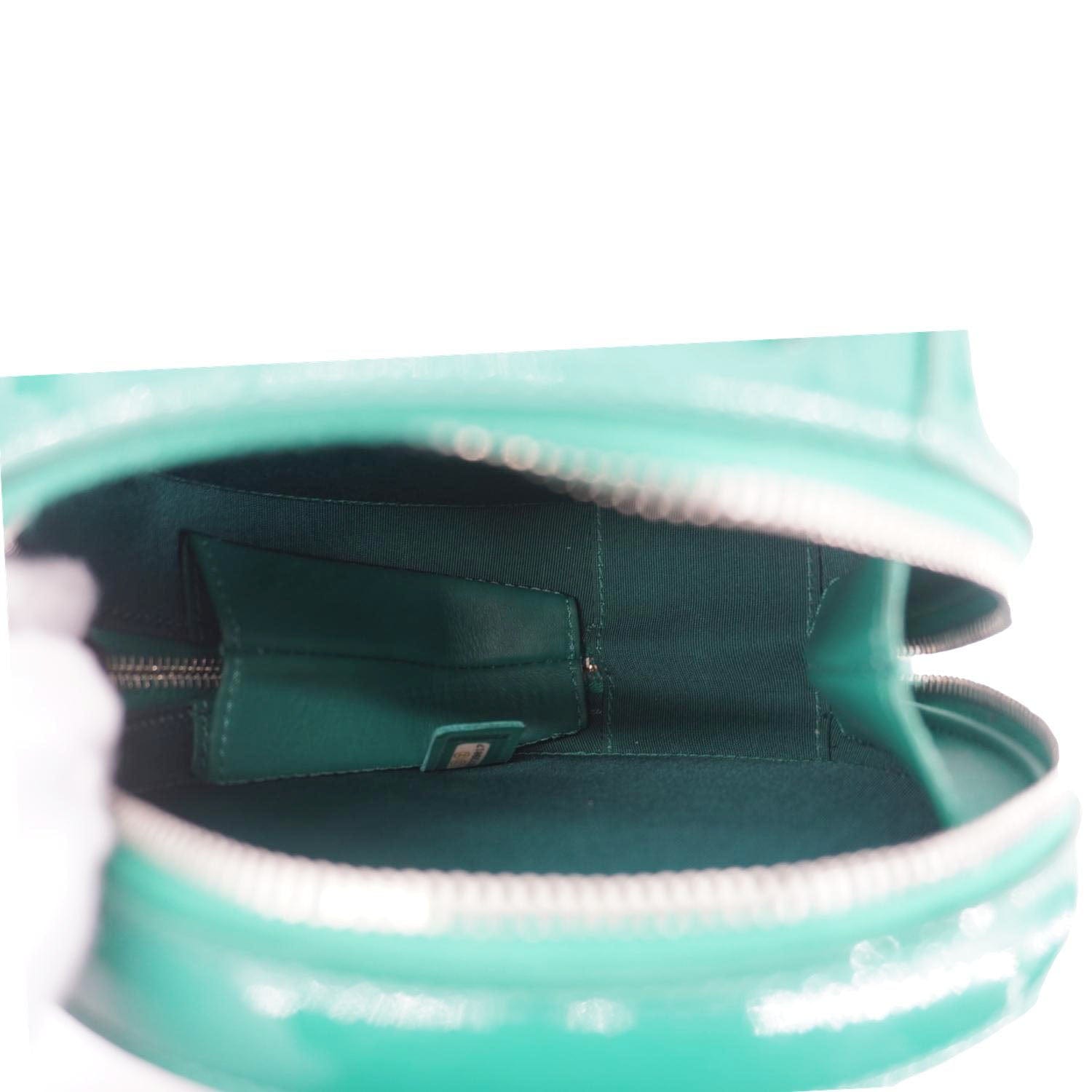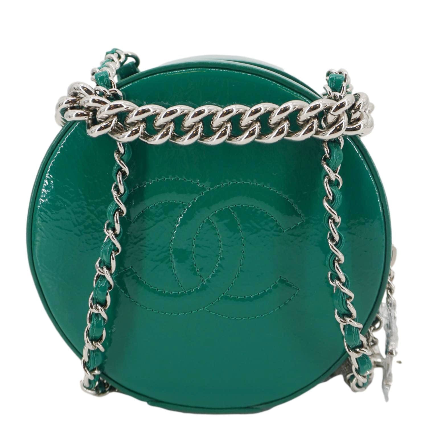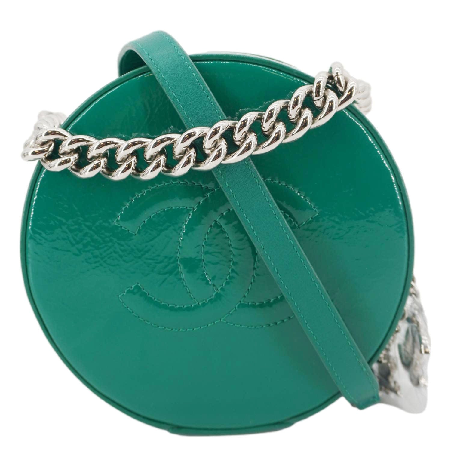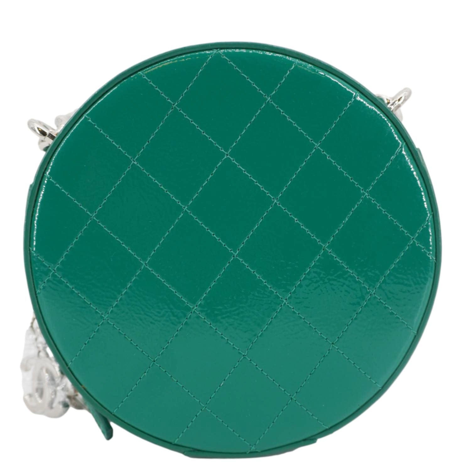 The Chanel Round as Earth Crossbody Bag in Green Patent Leather features a unique circular design with a glossy finish. Its compact shape and elegant details make it a chic accessory for standout style.