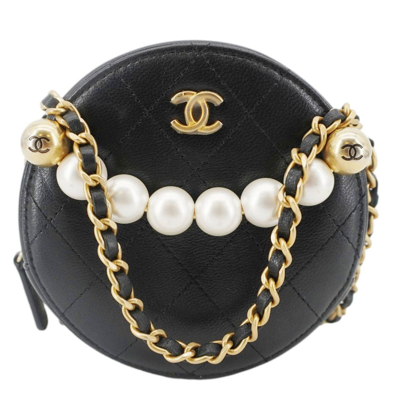The Chanel Round Chic Pearls Crossbody Bag in Black Quilted Leather is a luxurious statement piece with a unique circular shape. Adorned with elegant pearl accents and signature quilted leather, it features a CC turn-lock closure and a chain strap for timeless sophistication.