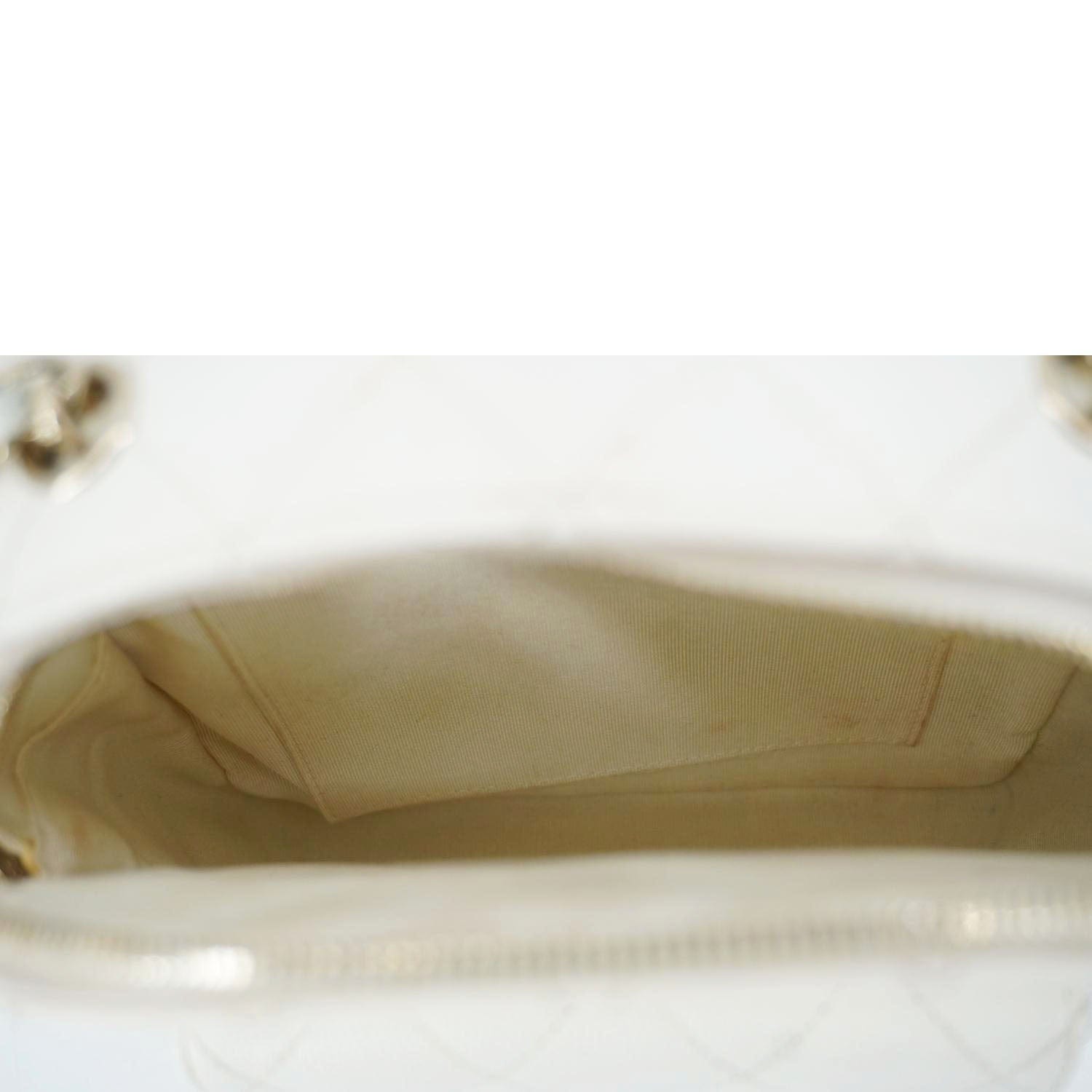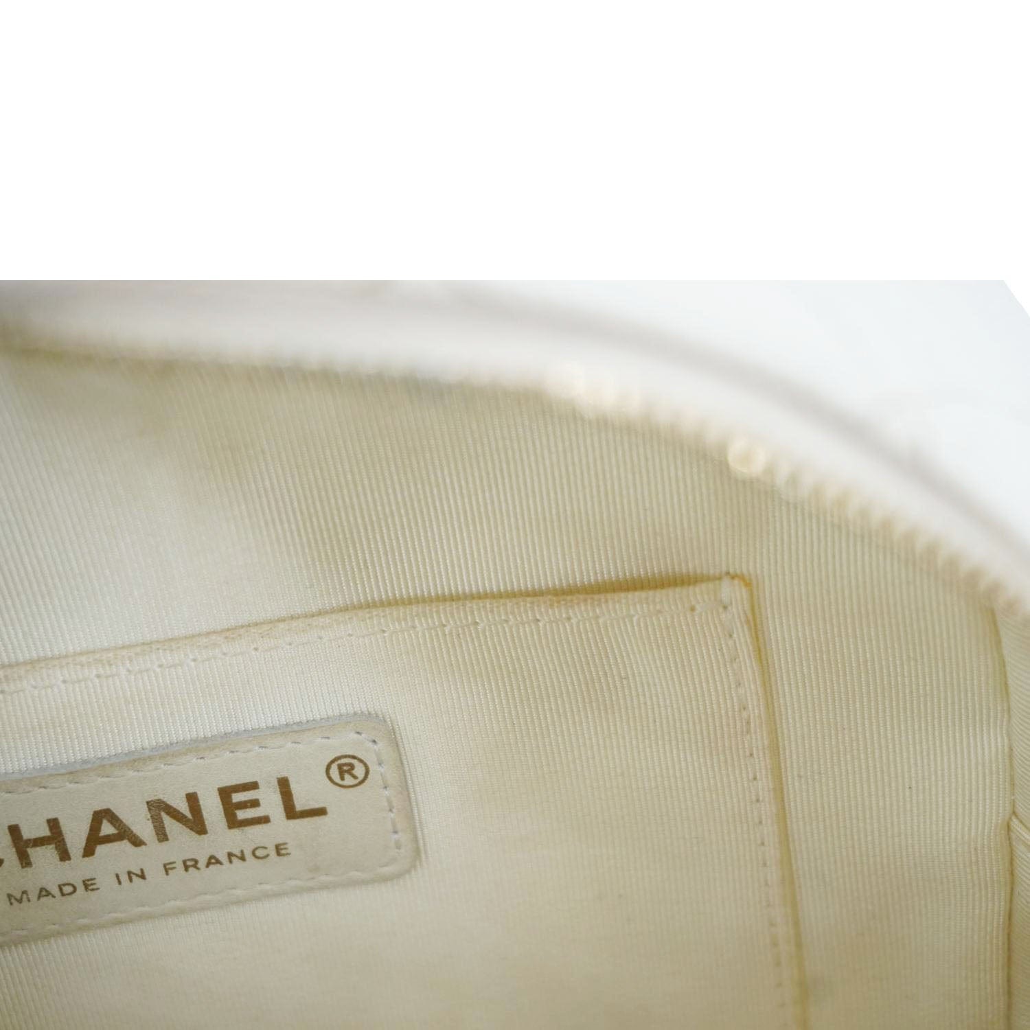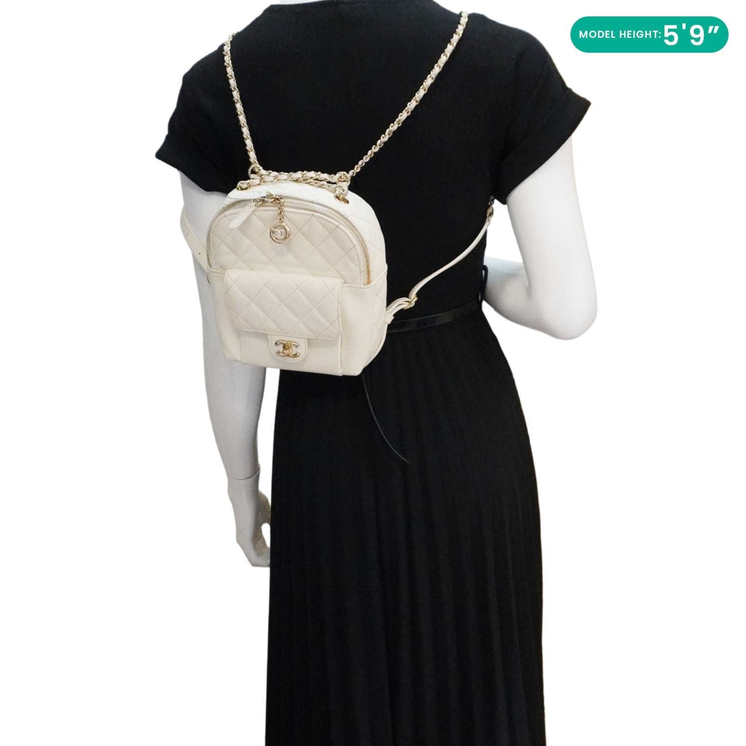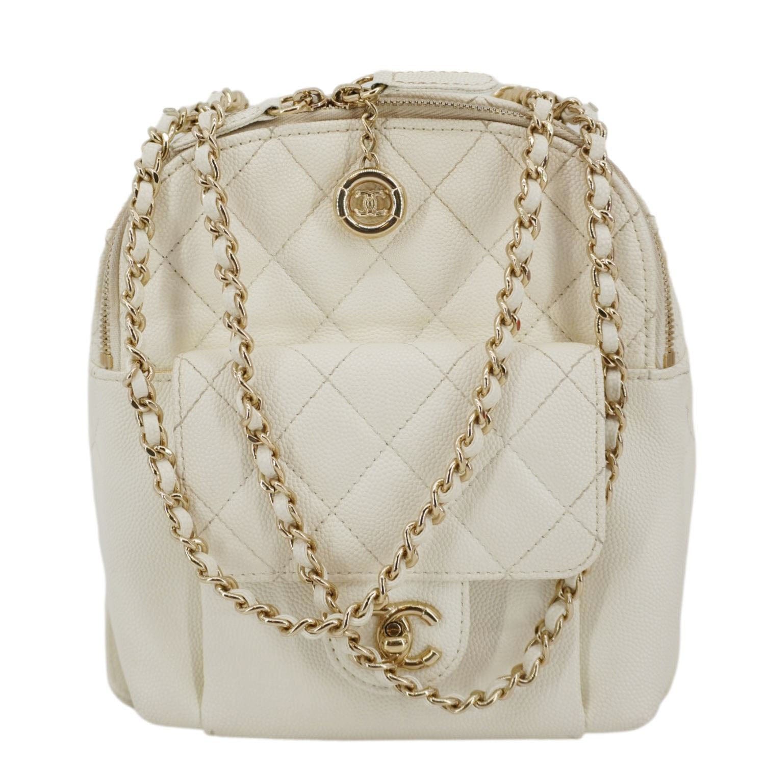 The CHANEL CC Day Small Caviar Quilted Leather Backpack in white exudes timeless sophistication. It is made from durable caviar leather and features the iconic CC logo and a versatile design. Ideal for everyday use, this backpack effortlessly blends style with practicality.
