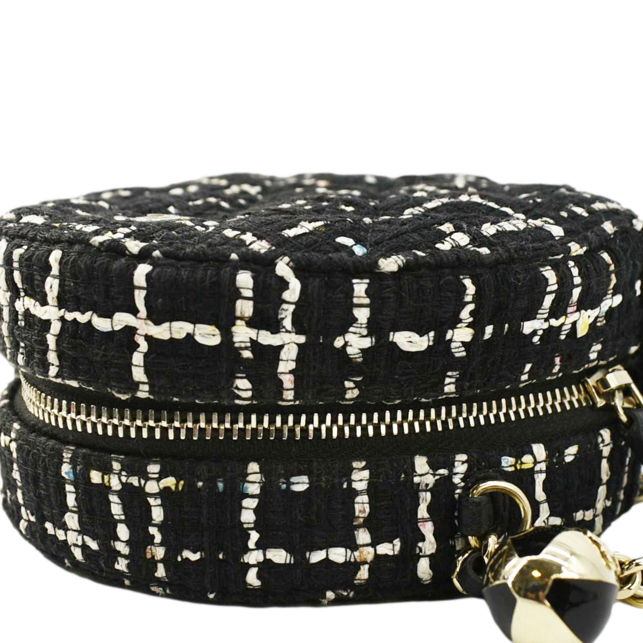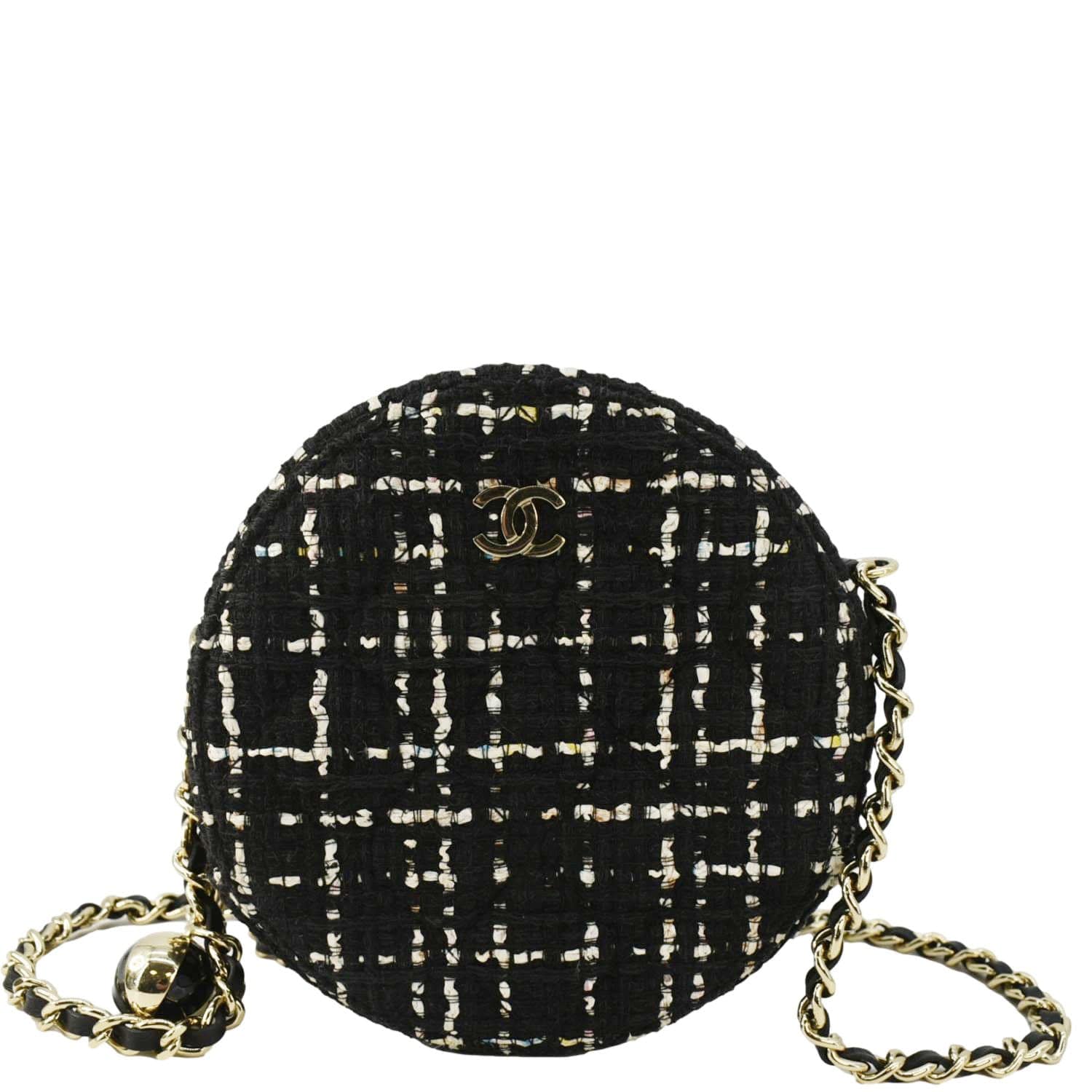 The CHANEL Round Quilted Tweed Clutch Crossbody Bag in black combines classic tweed with quilted detailing and gold-tone hardware. Its unique circular shape and chain strap add a chic, modern touch to any outfit.