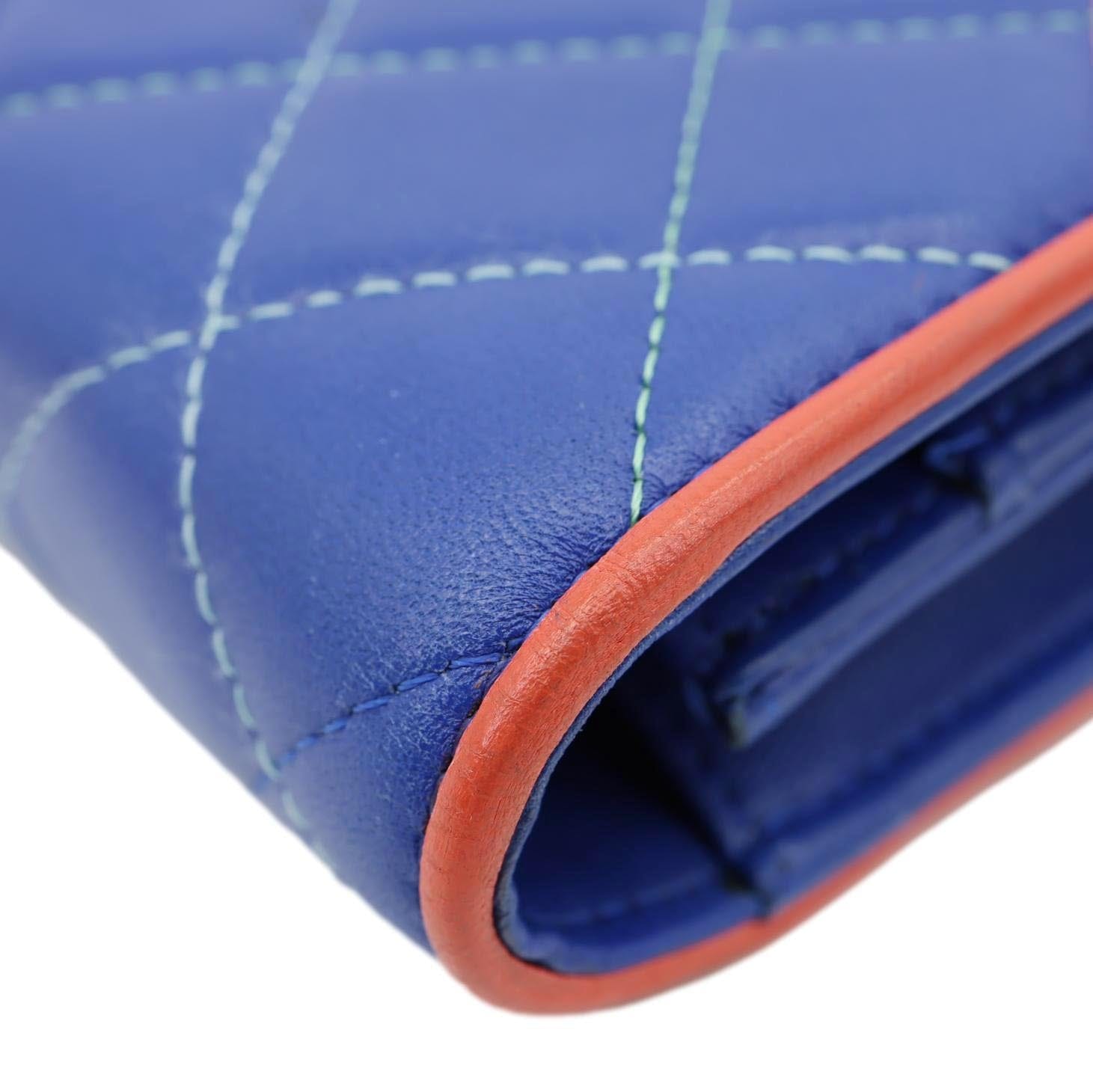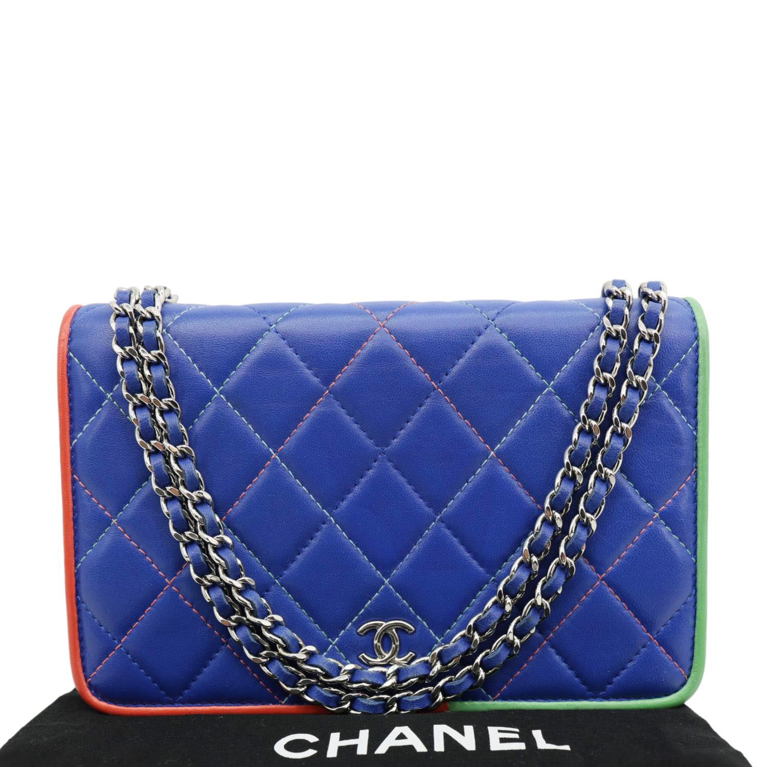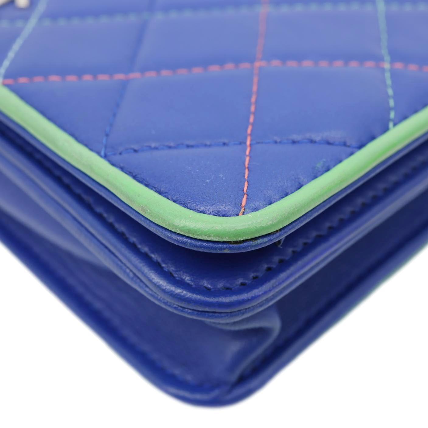 Elegant quilted leather wallet on chain in a rich blue shade with timeless Chanel detailing. Compact yet functional design, perfect for transitioning from day to night luxury wear.