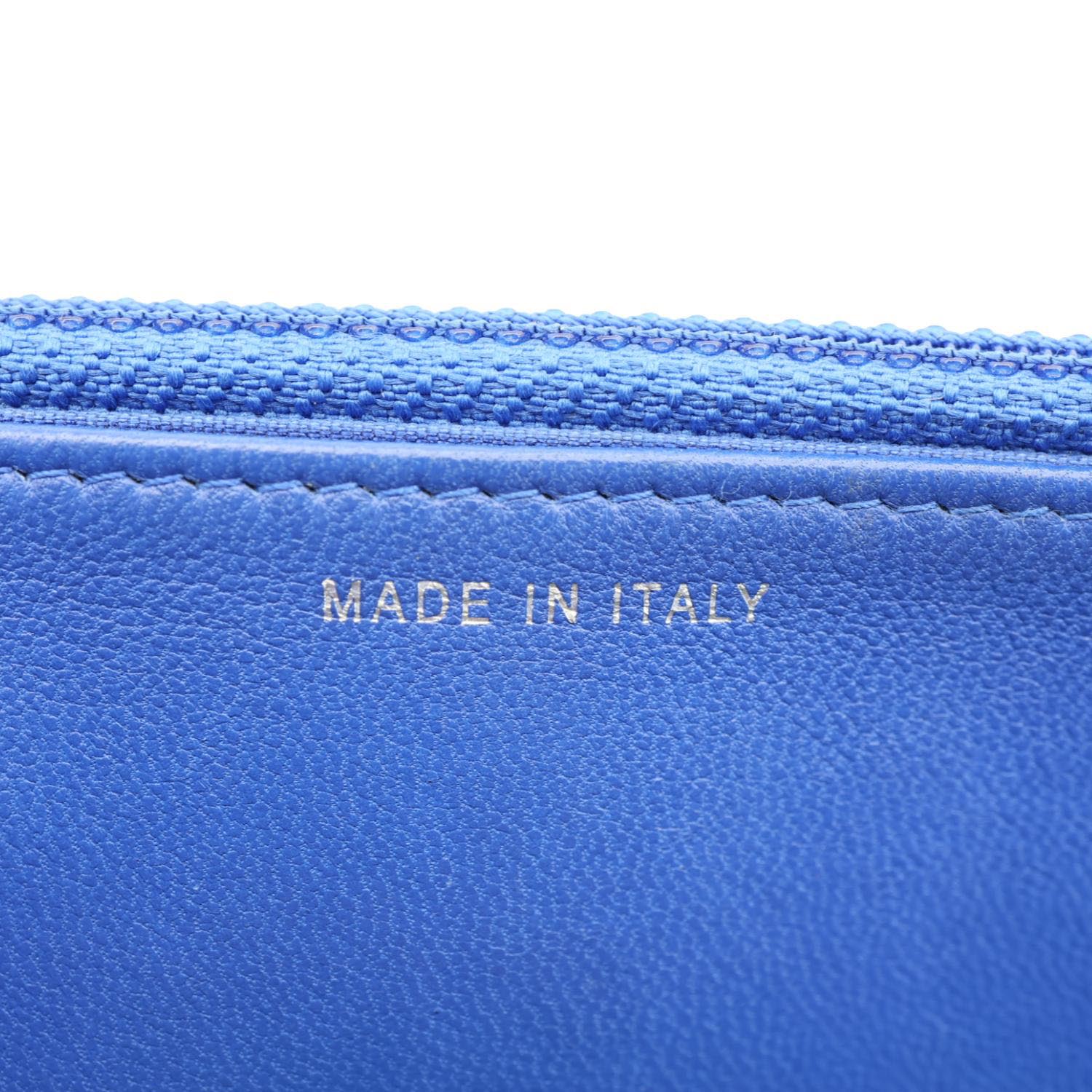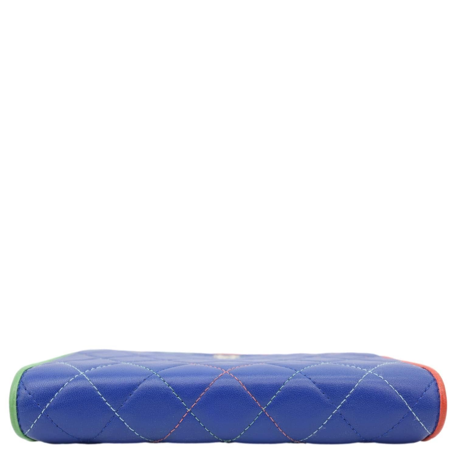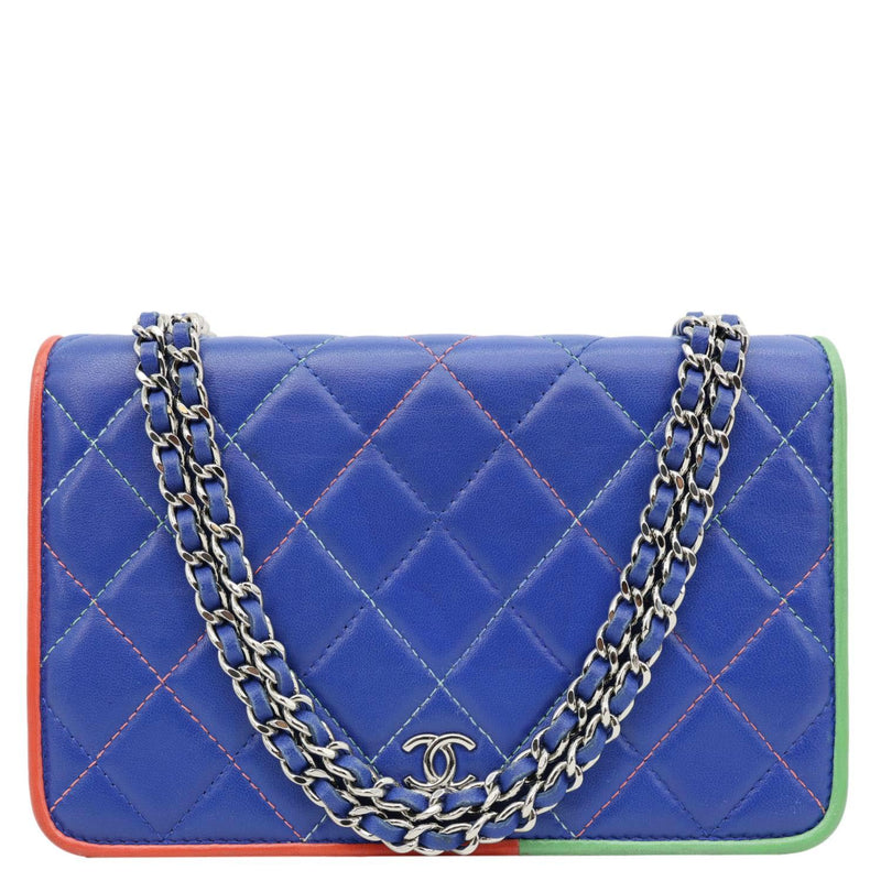 Elegant quilted leather wallet on chain in a rich blue shade with timeless Chanel detailing. Compact yet functional design, perfect for transitioning from day to night luxury wear.
