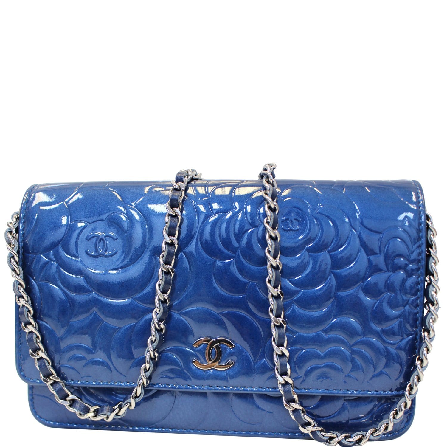CHANEL Camellia Patent Leather Wallet on Chain WOC Royal Blue