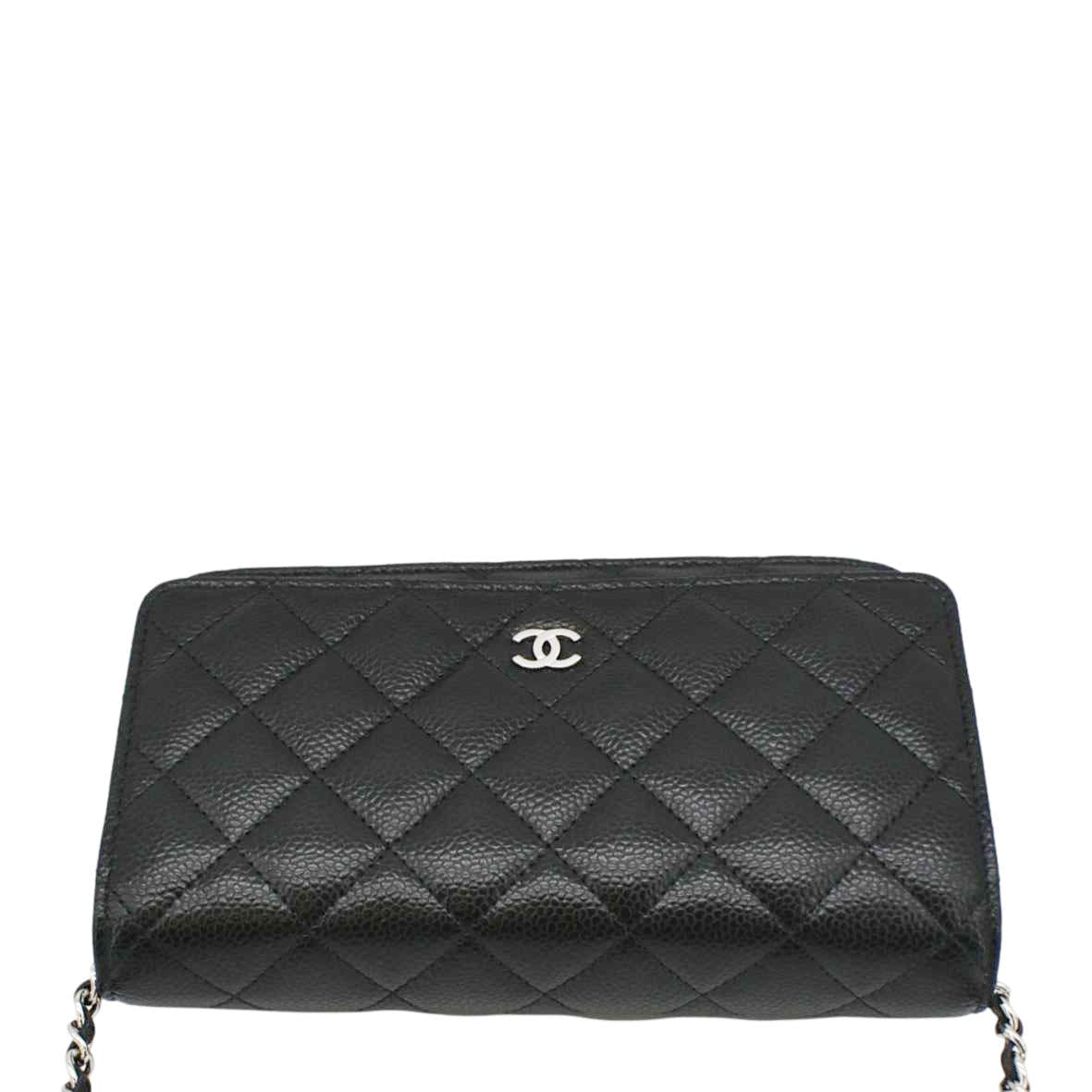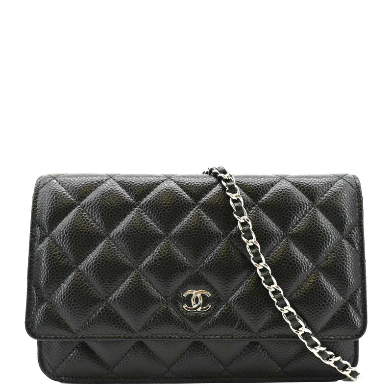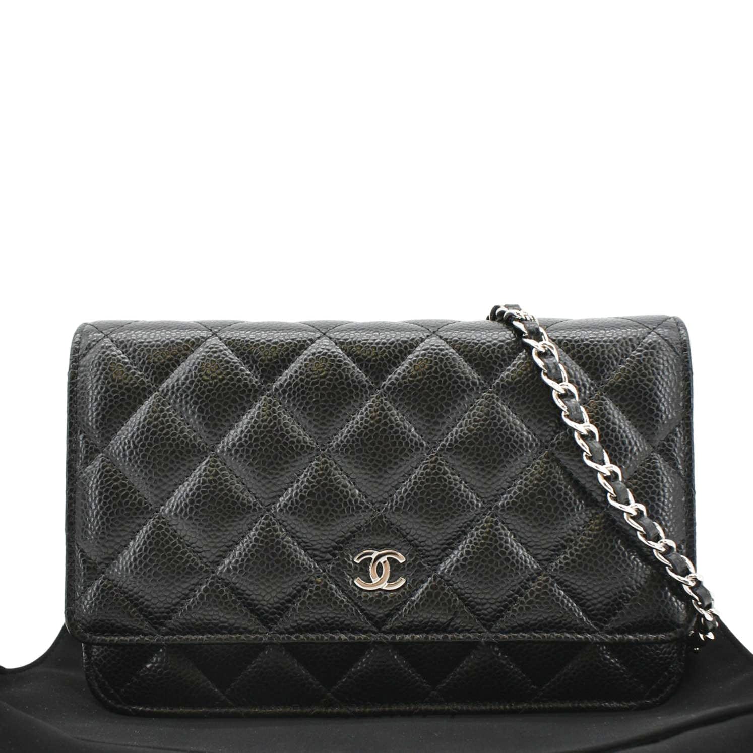 The Chanel Woc Quilted Caviar Leather Wallet on Chain Crossbody Bag in Black features luxurious quilted leather, a signature chain strap, and the iconic Chanel logo, offering a chic and versatile accessory for any occasion.