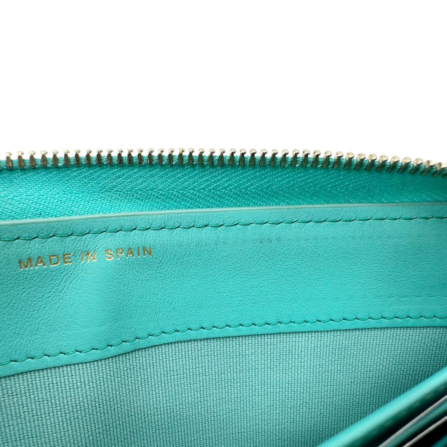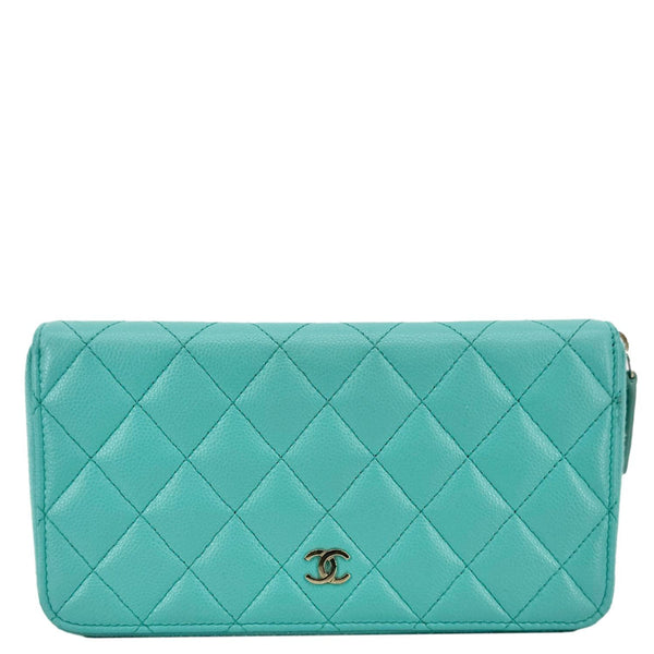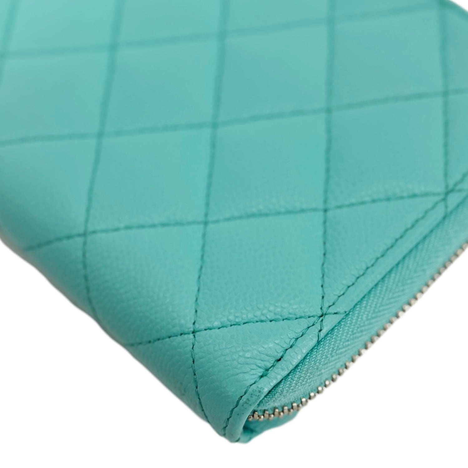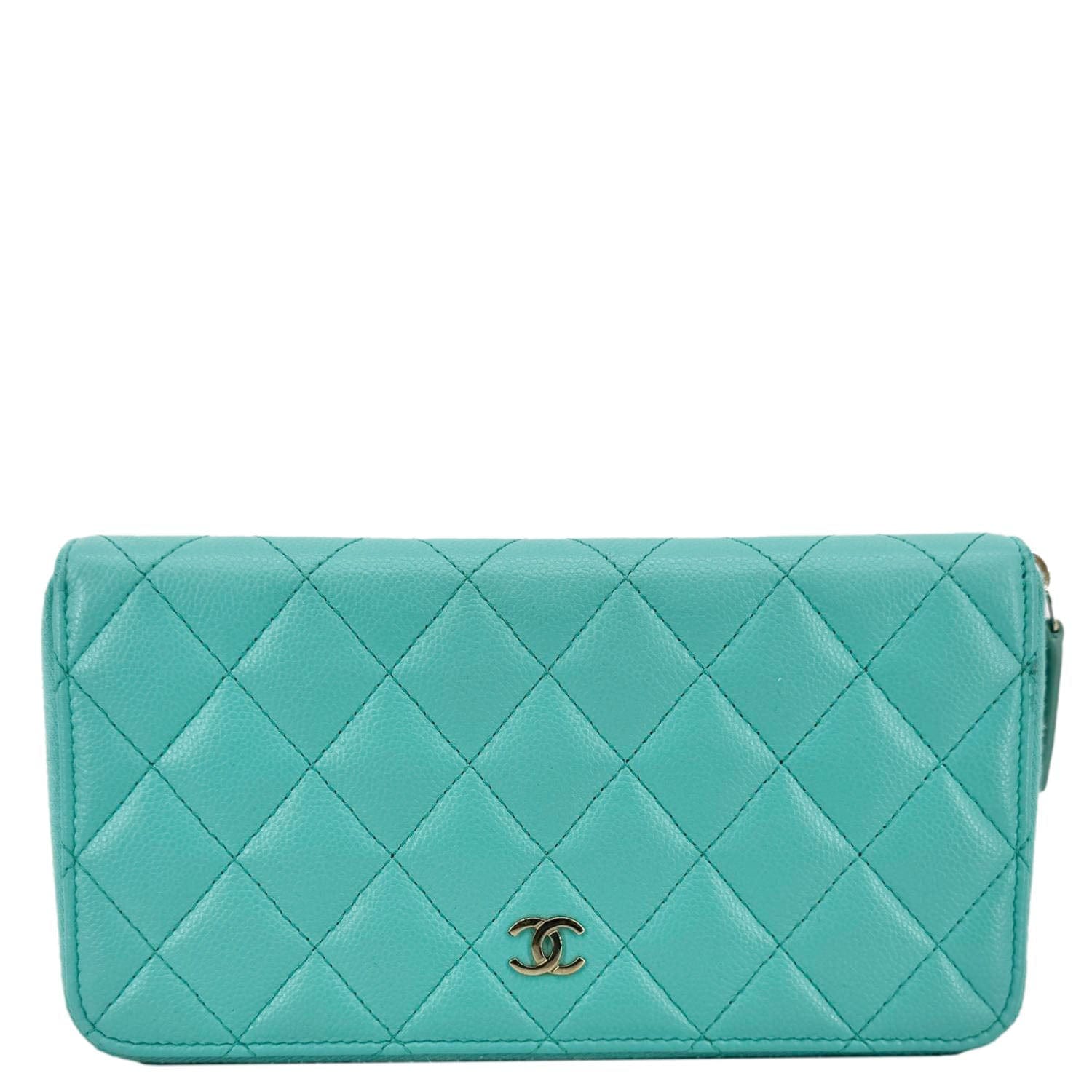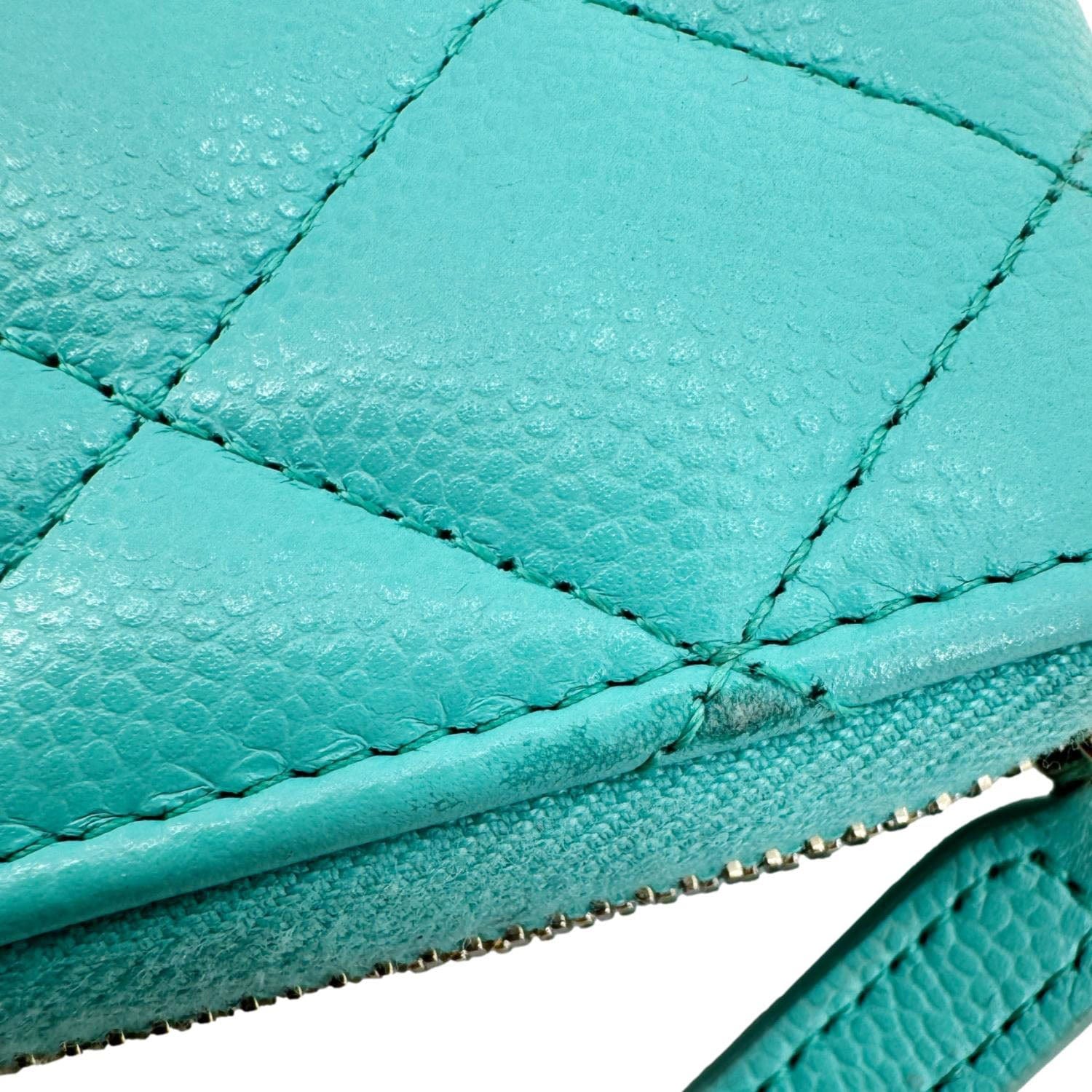 The CHANEL Zip Around Quilted Caviar Leather Wallet in Turquoise features a luxurious quilted design, crafted from durable caviar leather. Its zip-around closure ensures your essentials are securely stored with timeless elegance.
