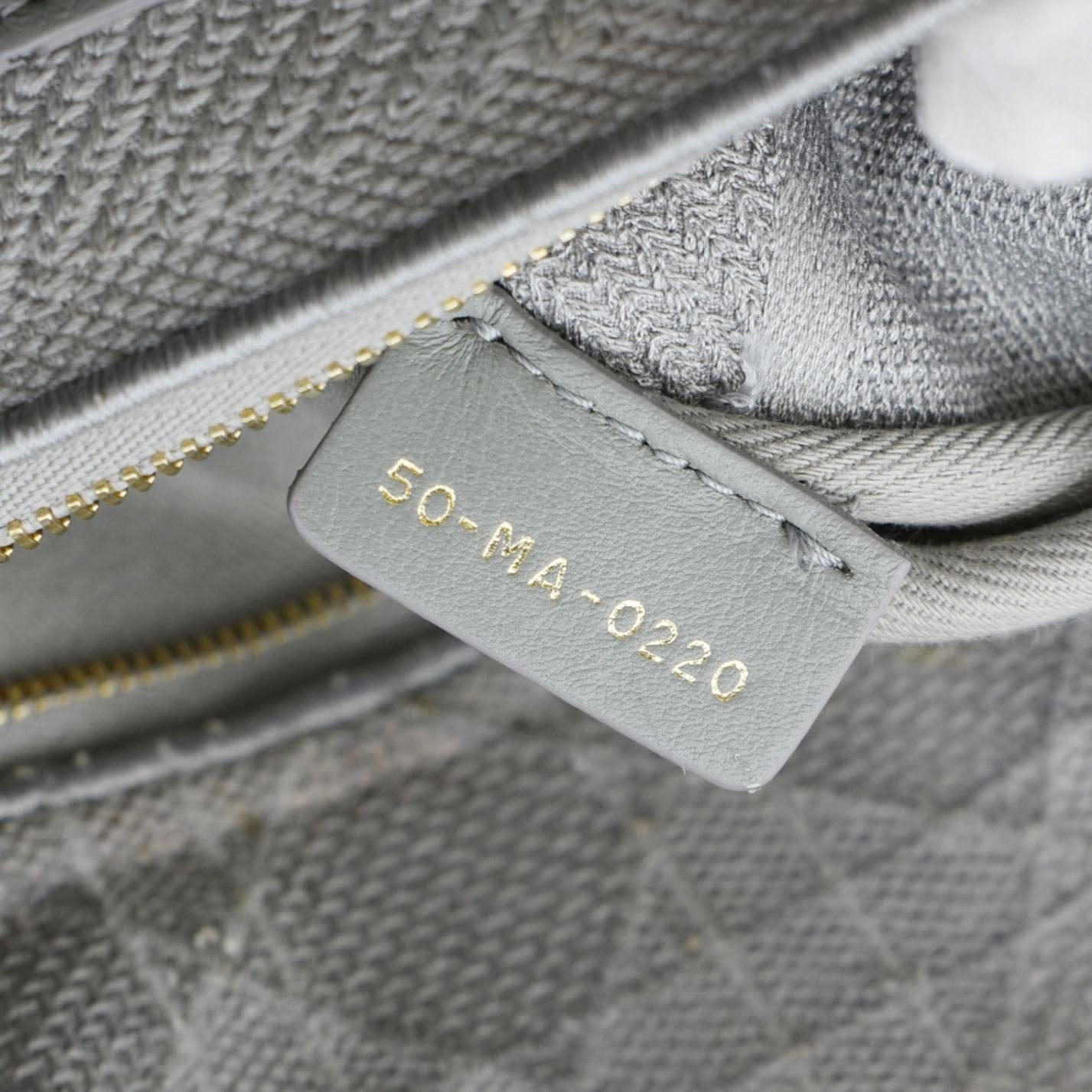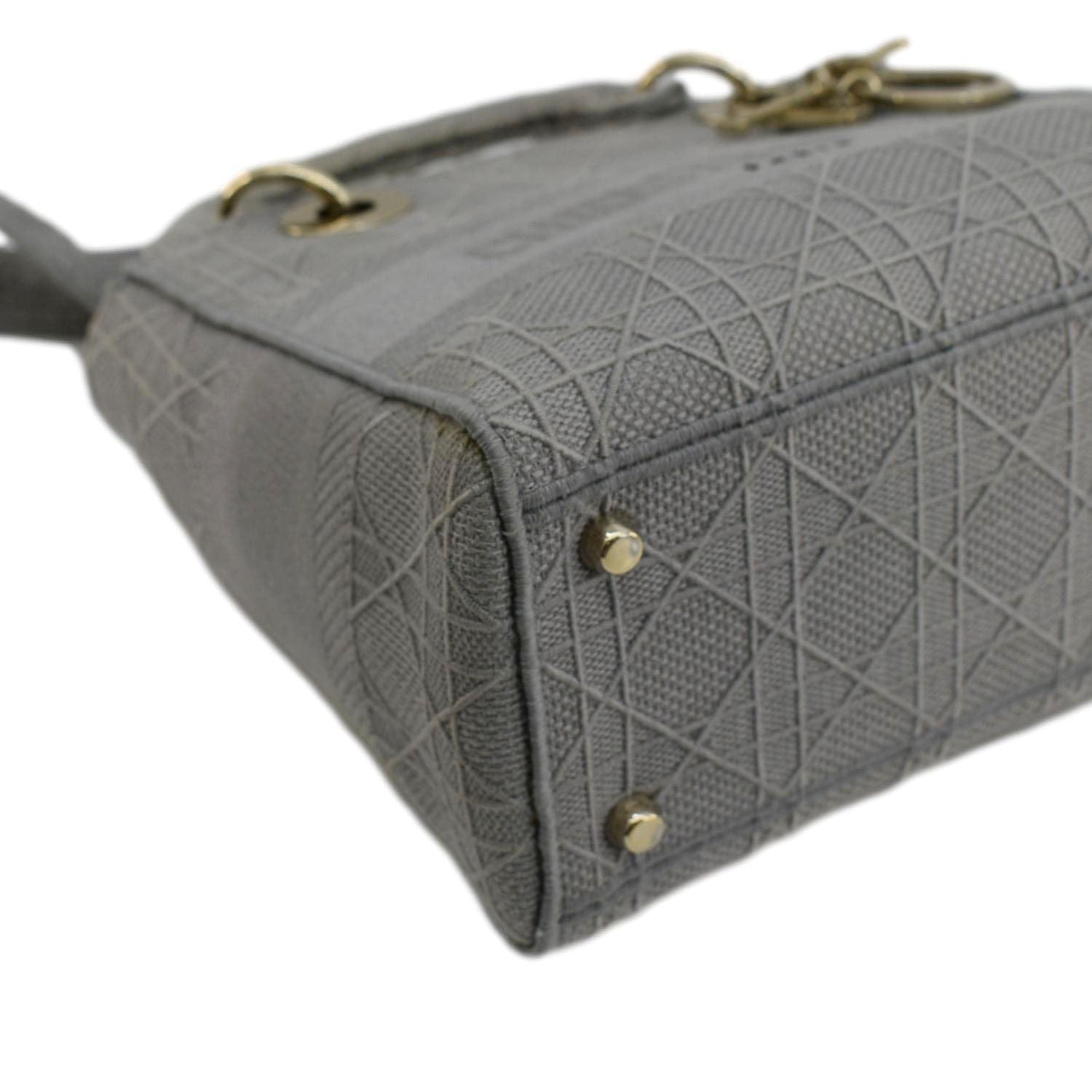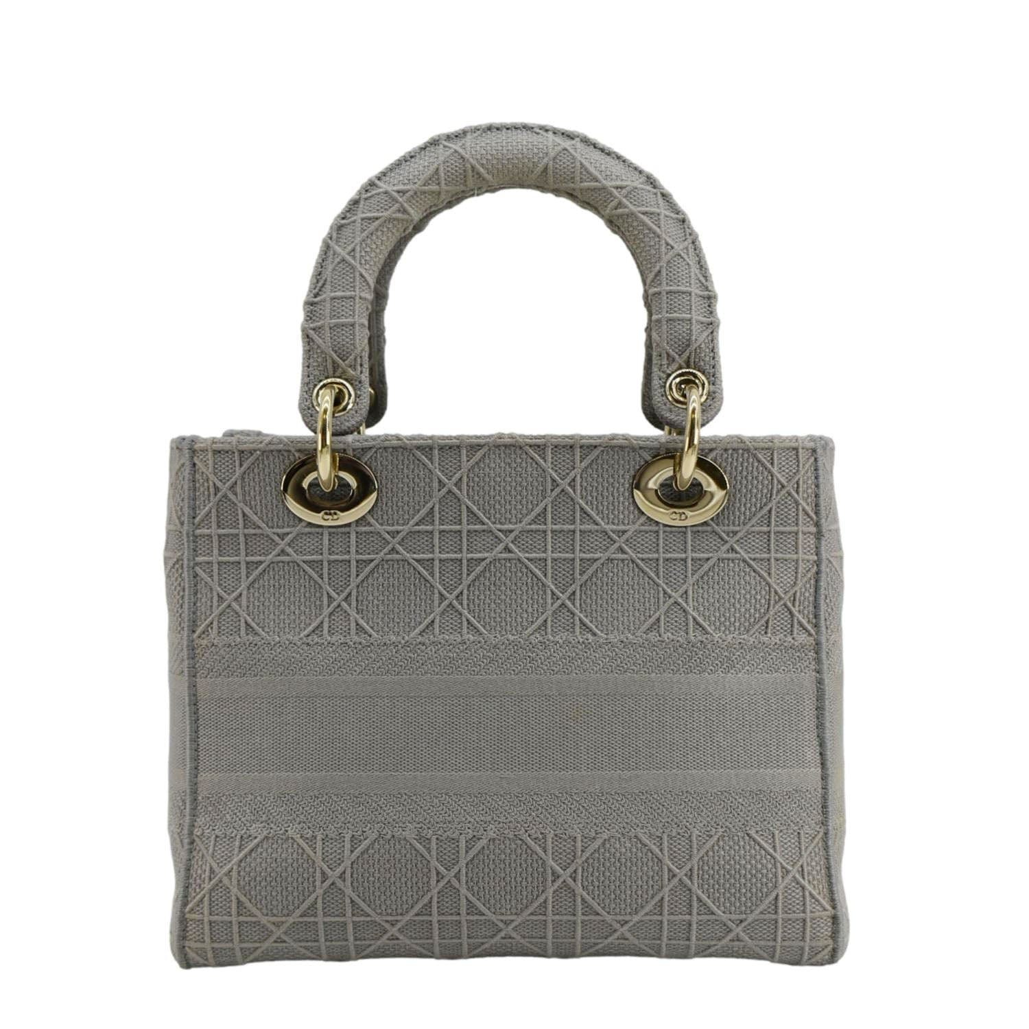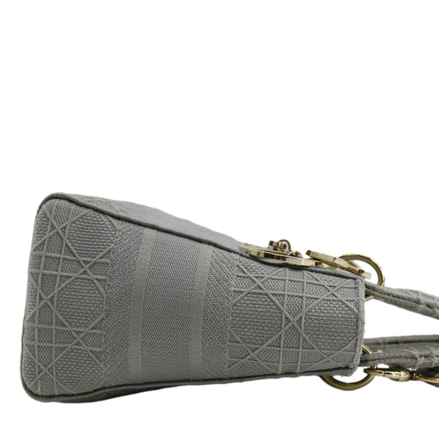 The Christian Dior Lady Dior D-Lite Shoulder Bag in gray embroidered Cannage canvas features the iconic quilted pattern, offering a modern twist on a classic design. With its elegant silhouette, top handles, and removable strap, this bag combines luxury and versatility, perfect for day or evening wear.