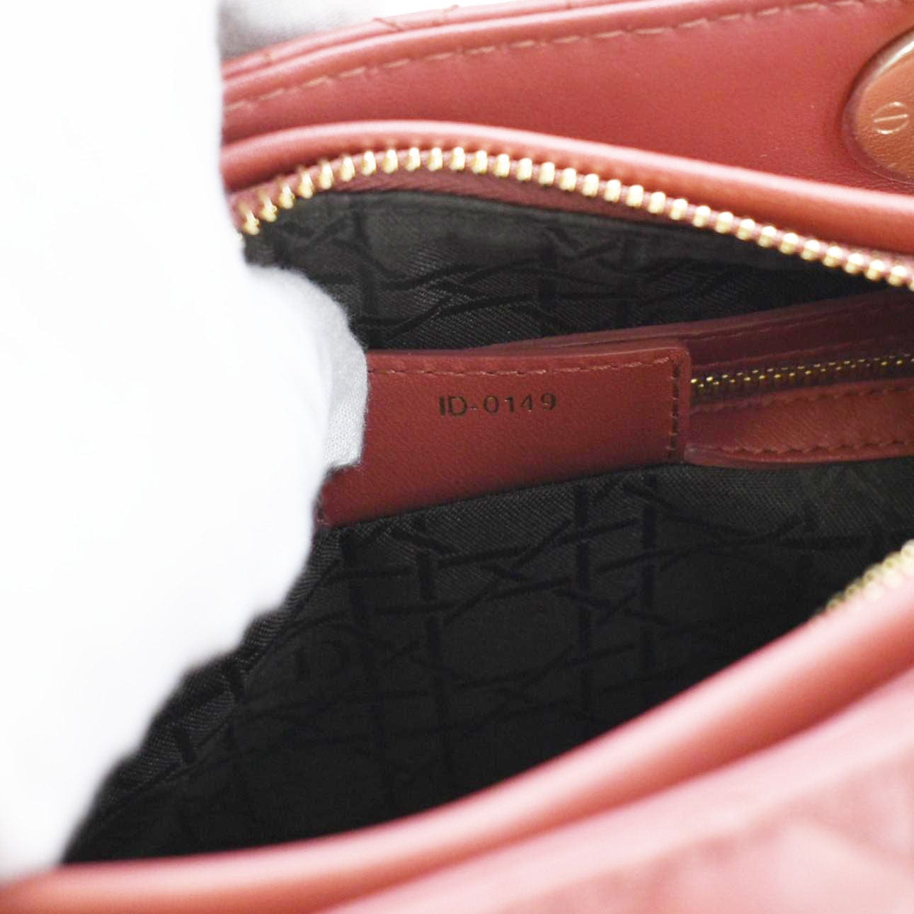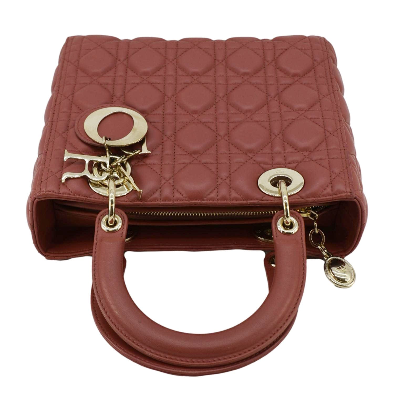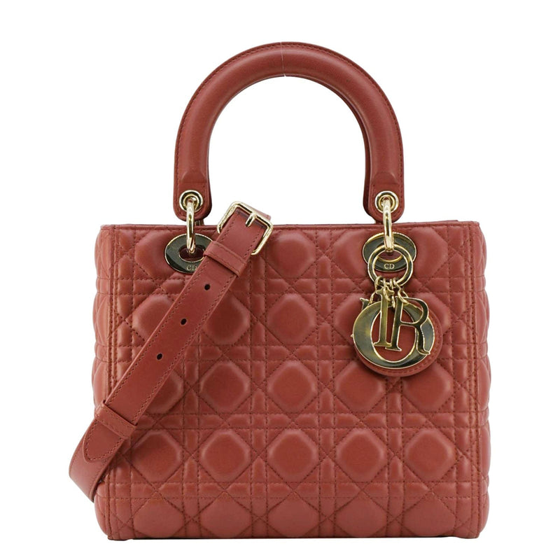 The CHRISTIAN DIOR Lady Dior Medium Cannage Leather Shoulder Bag in red features the iconic quilted design, crafted from luxurious lambskin. It includes gold-tone hardware and a detachable shoulder strap for versatile styling.