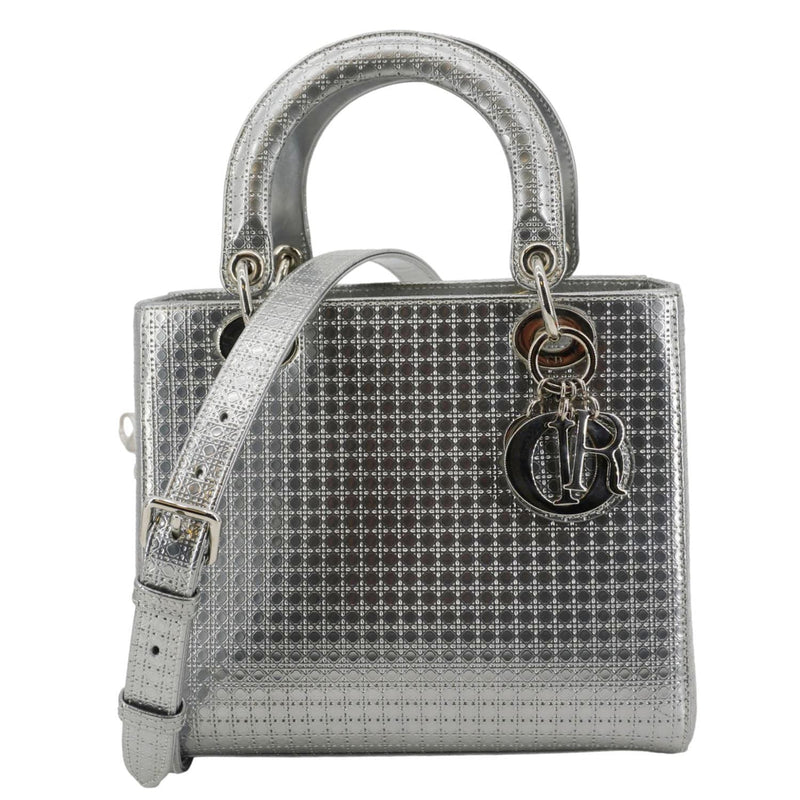 The Christian Dior Lady Dior Medium Shoulder Bag in metallic silver leather is a luxurious icon of elegance. It's a sophisticated statement piece for any occasion, featuring the signature cannage quilting, polished silver-tone hardware, and the iconic "D.I.O.R." charms.