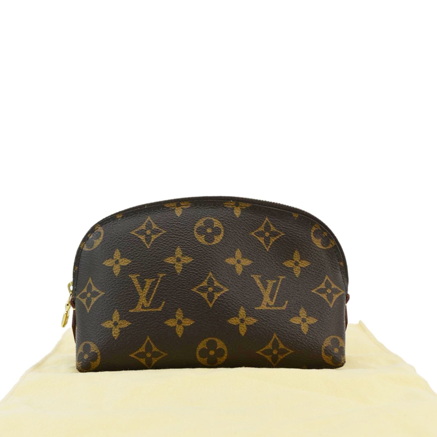 The Louis Vuitton PM Cosmetic Pouch in Monogram Canvas is a compact brown pouch featuring the iconic LV monogram. It's perfect for storing essentials, with a zip closure and a washable interior lining.