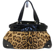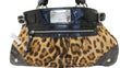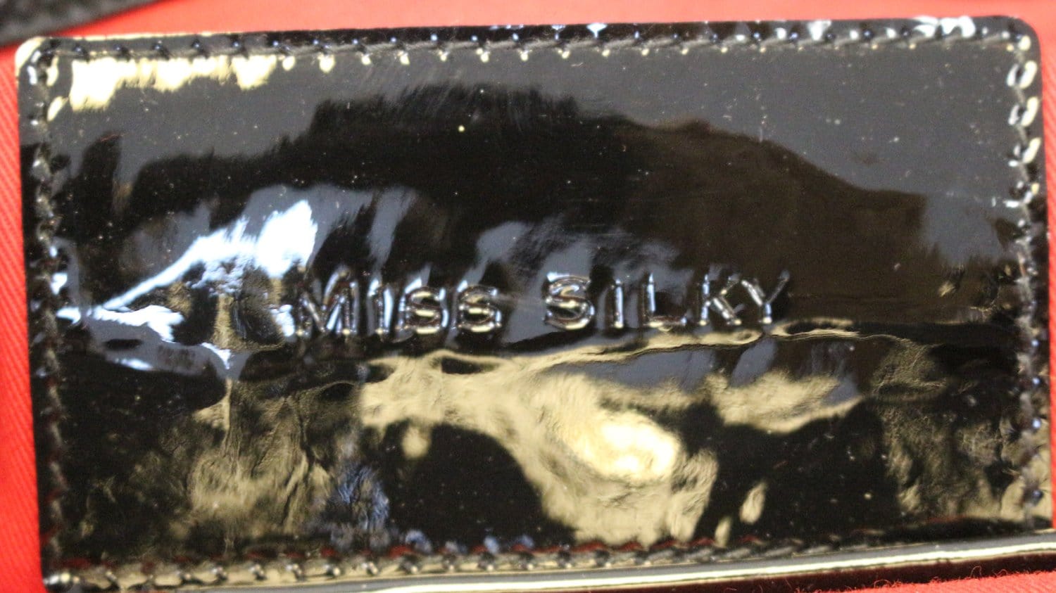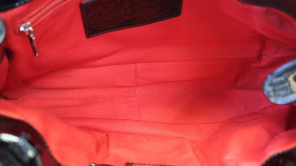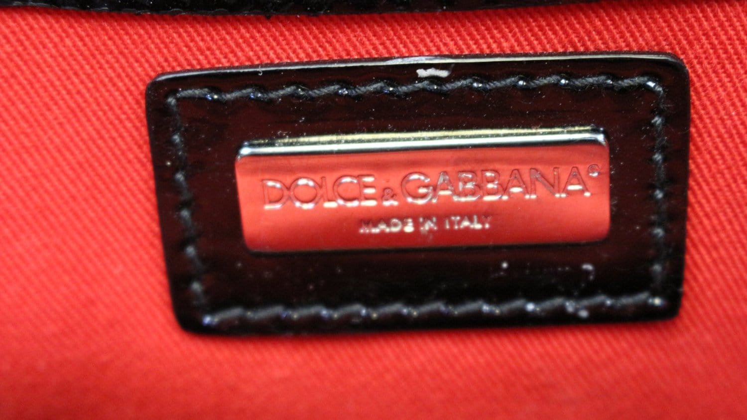 Dolce & Gabbana Miss Silky bag with silver-tone hardware, black patent leather accents, single zip exterior pocket, dual flat shoulder straps, red woven lining, dual pockets at interior walls; one with zip closure and magnetic snap closure at top.