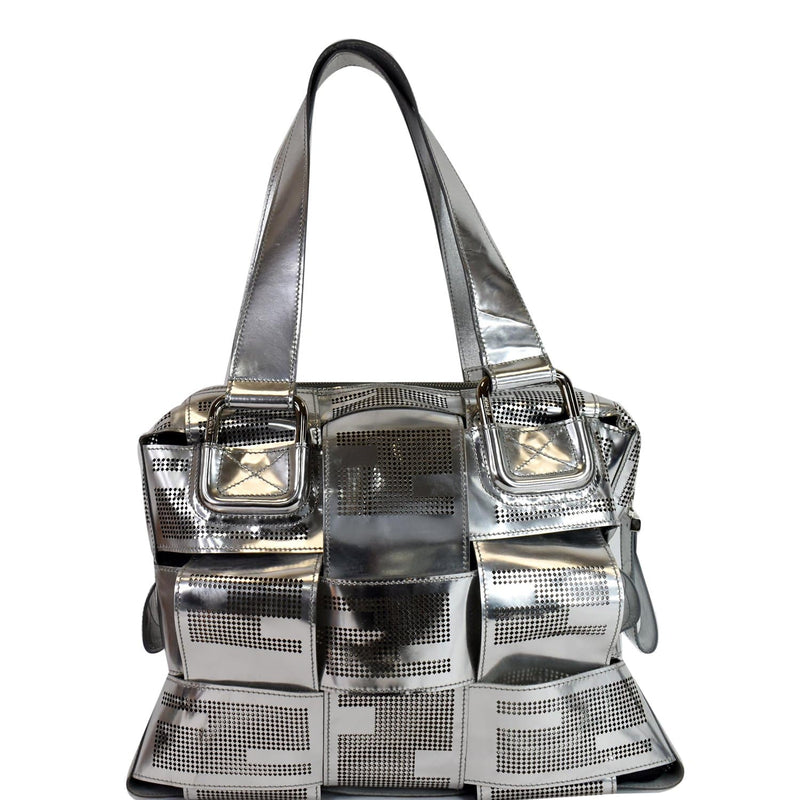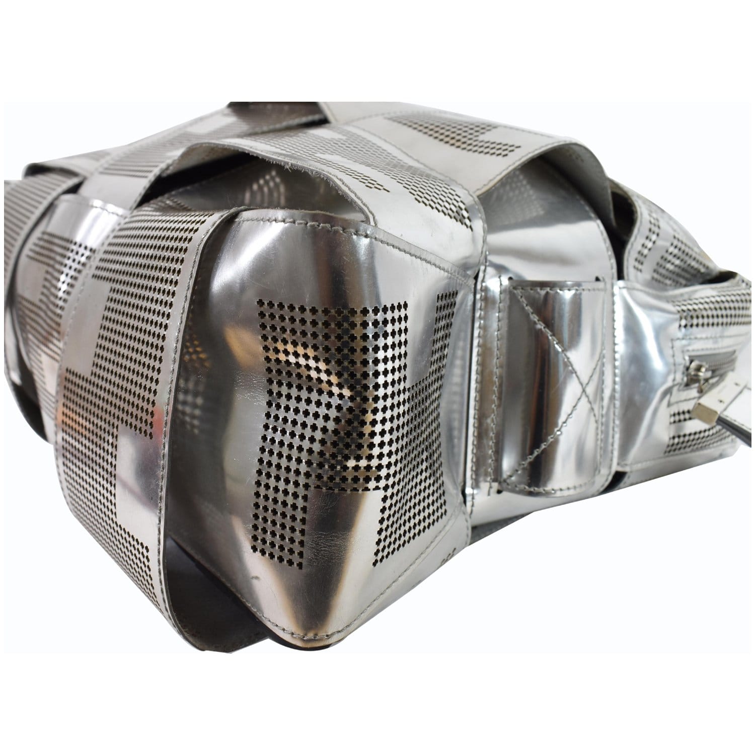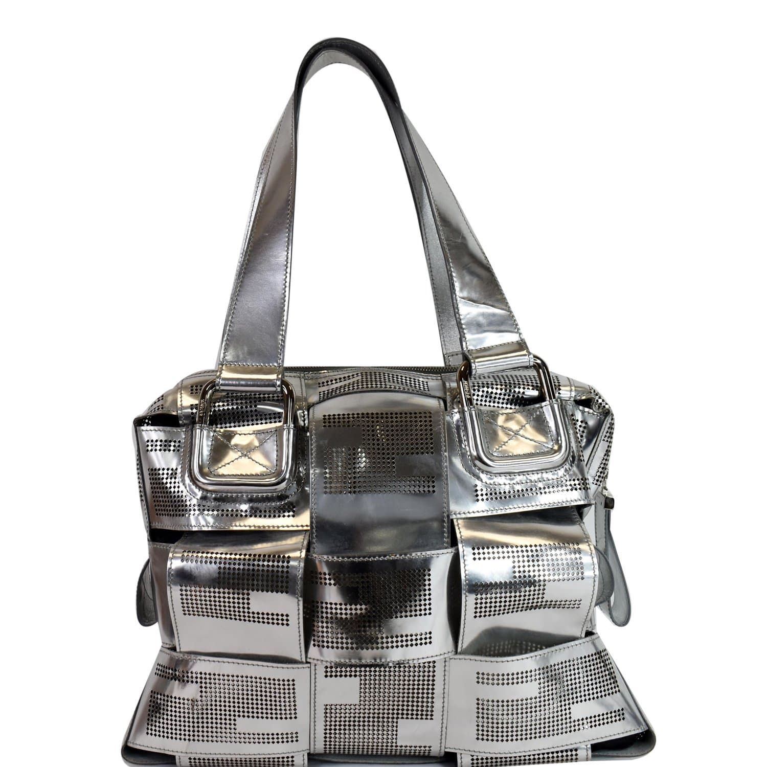 FENDI Crossword Metallic Perforated Leather Shoulder Bag Silver