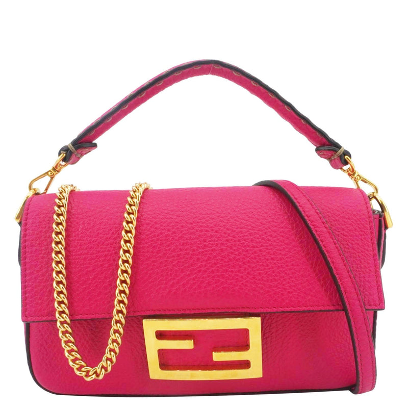 The Fendi Selleria Baguette Crossbody in pink Cuoio Romano leather showcases handcrafted stitching and luxurious texture. With a detachable strap and flap closure, it offers timeless elegance in a compact, wearable design.