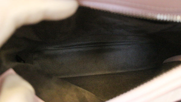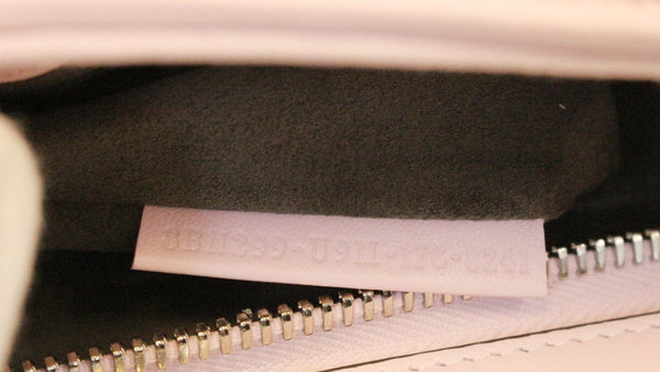 Fendi DOTCOM is crafted of quilted lambskin leather in light pink. The bag features a polished silver chain shoulder strap with a leather shoulder pad, silver hardware including cone shaped studs and a removable pink pouch which can be seen through a small cut out on the front side. There are two over extending zippers on either side of the top frame that open to a grey suede interior with patch pockets.
