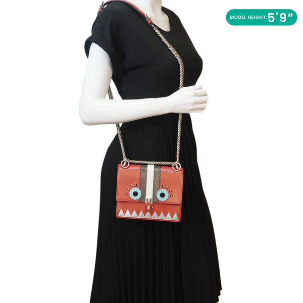 The Fendi Studded Kan I Vitello Liberty Lucido Catalan Leather Shoulder Bag in multicolor is a bold and stylish piece featuring glossy calfskin leather, signature pyramid studs, and a structured flap design with a statement-making aesthetic.