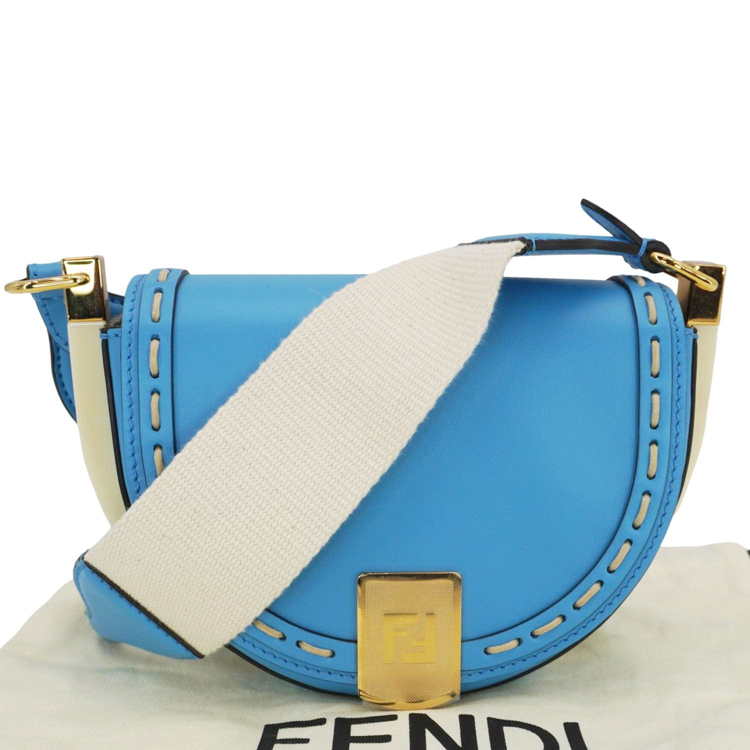 The Fendi Moonlight Leather Crossbody Saddle Bag in blue is a chic and contemporary accessory. Featuring a structured saddle silhouette, gold-tone hardware, and an adjustable strap, it’s perfect for effortless, stylish wear.