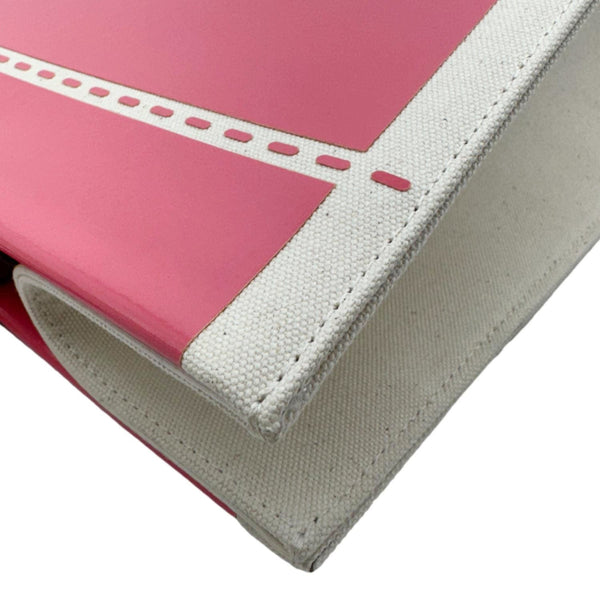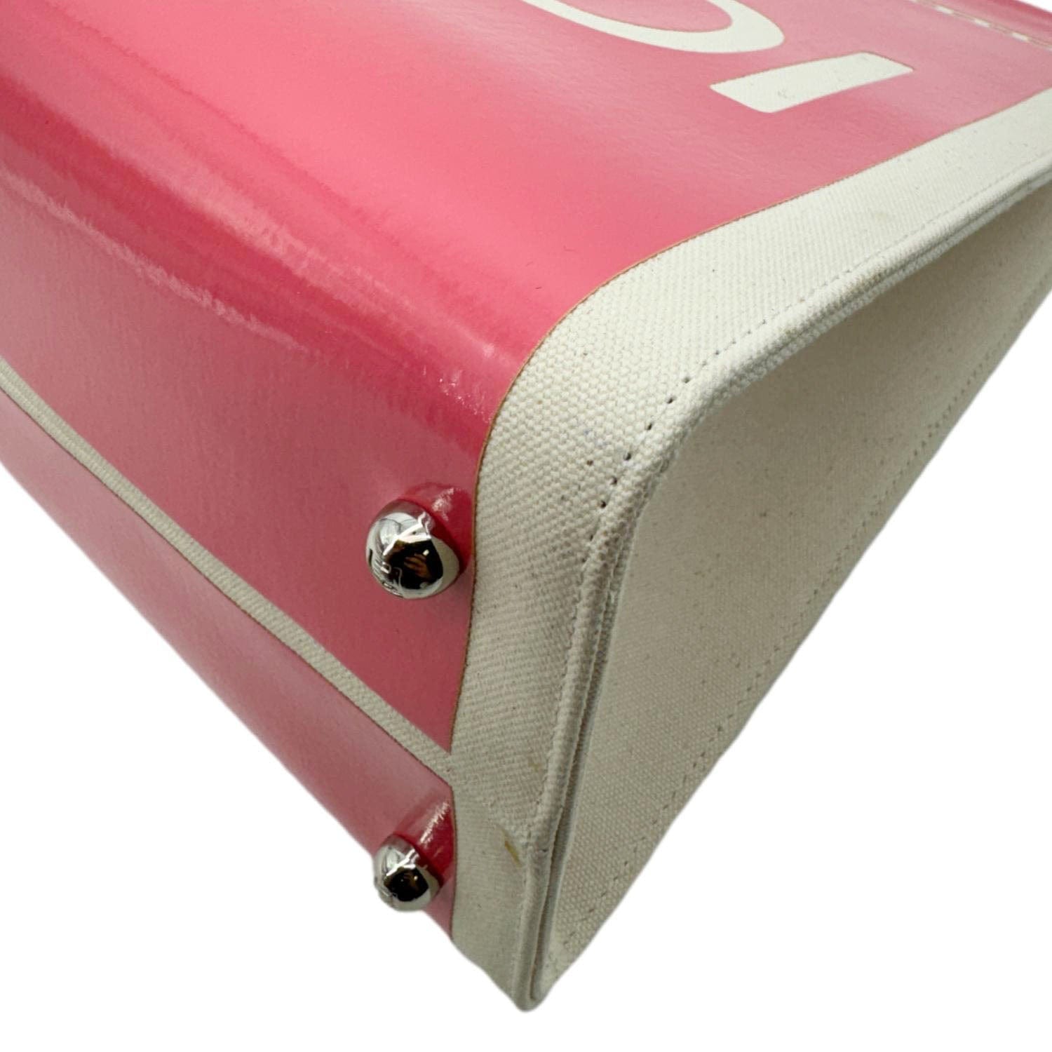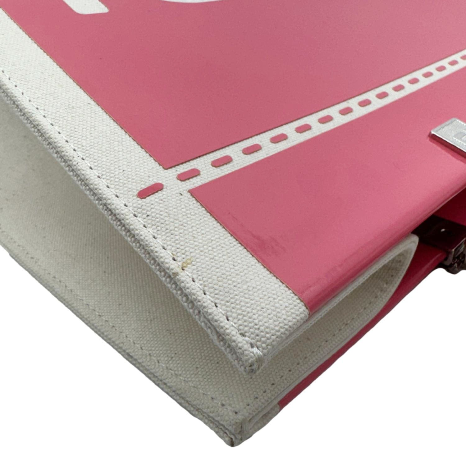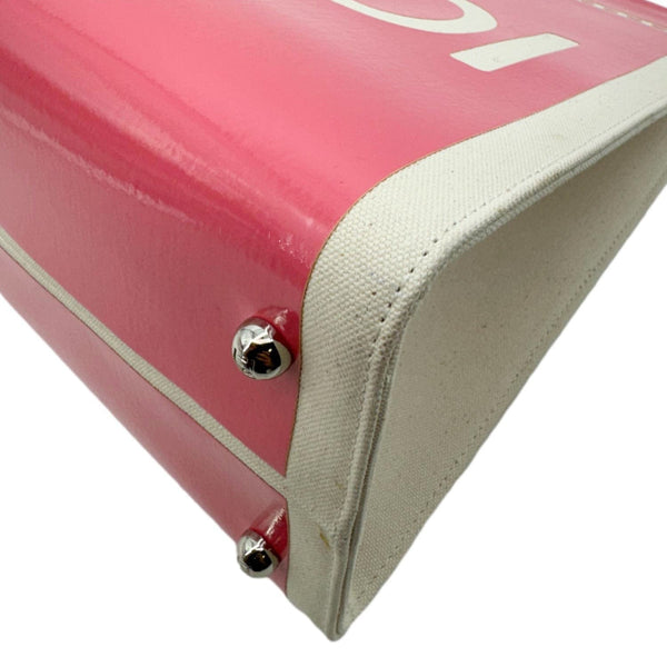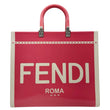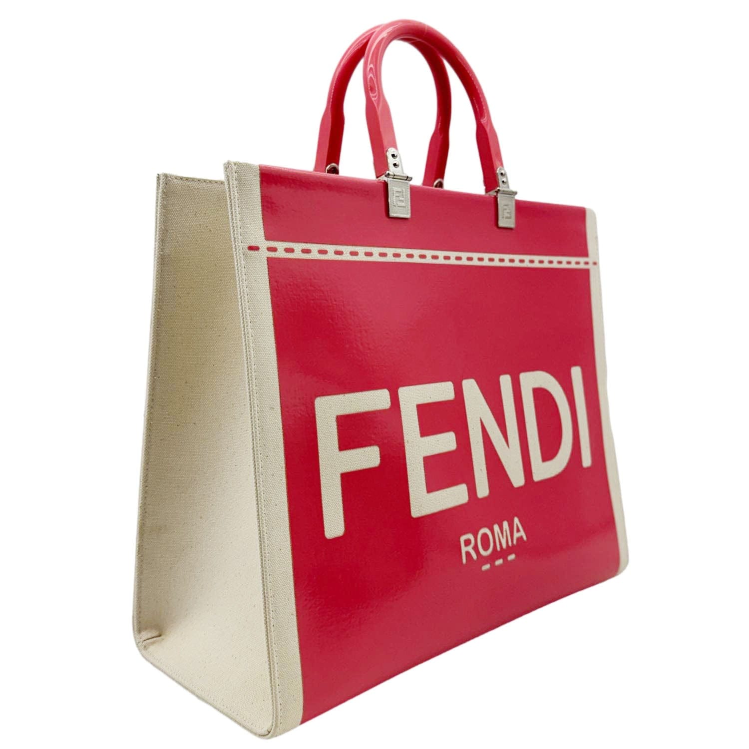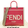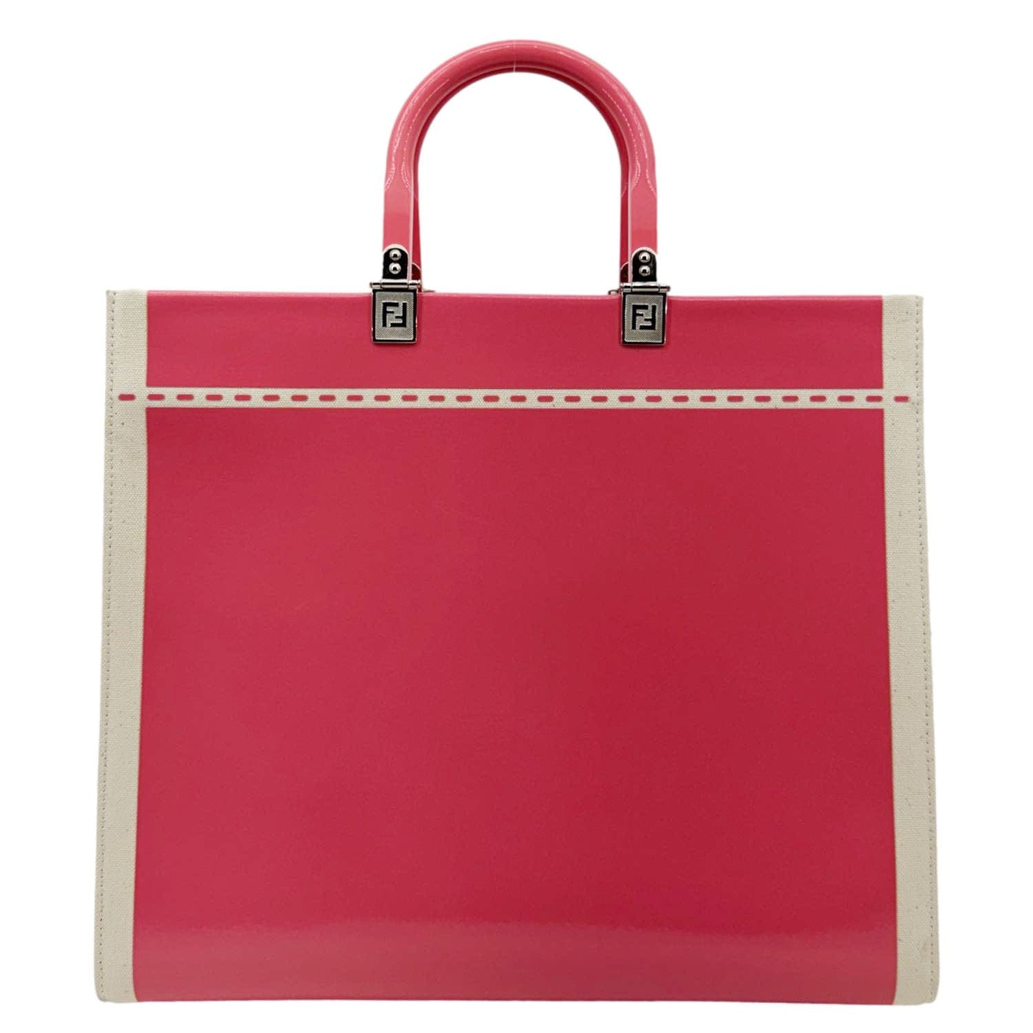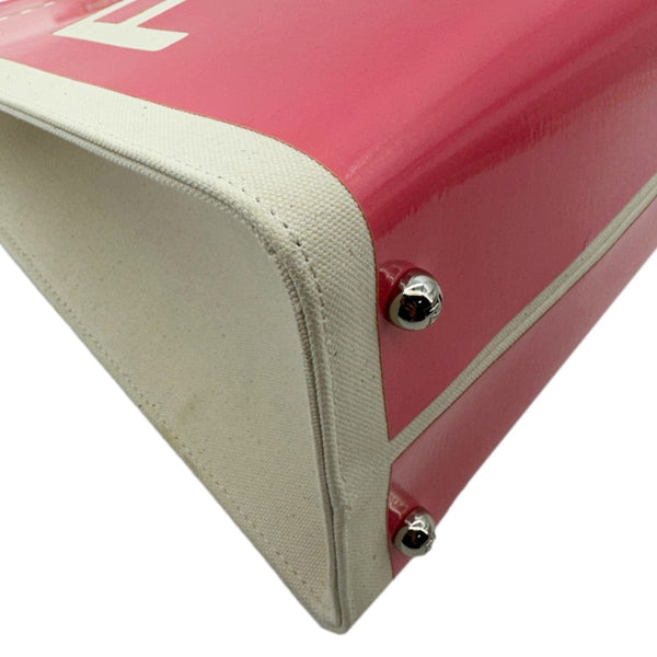 The FENDI Sunshine Medium Patent Leather Crossbody Tote Bag in Light Pink is crafted from glossy leather with bold “FENDI ROMA” lettering. Featuring plexiglass top handles and a detachable canvas strap, it blends luxury with everyday practicality.