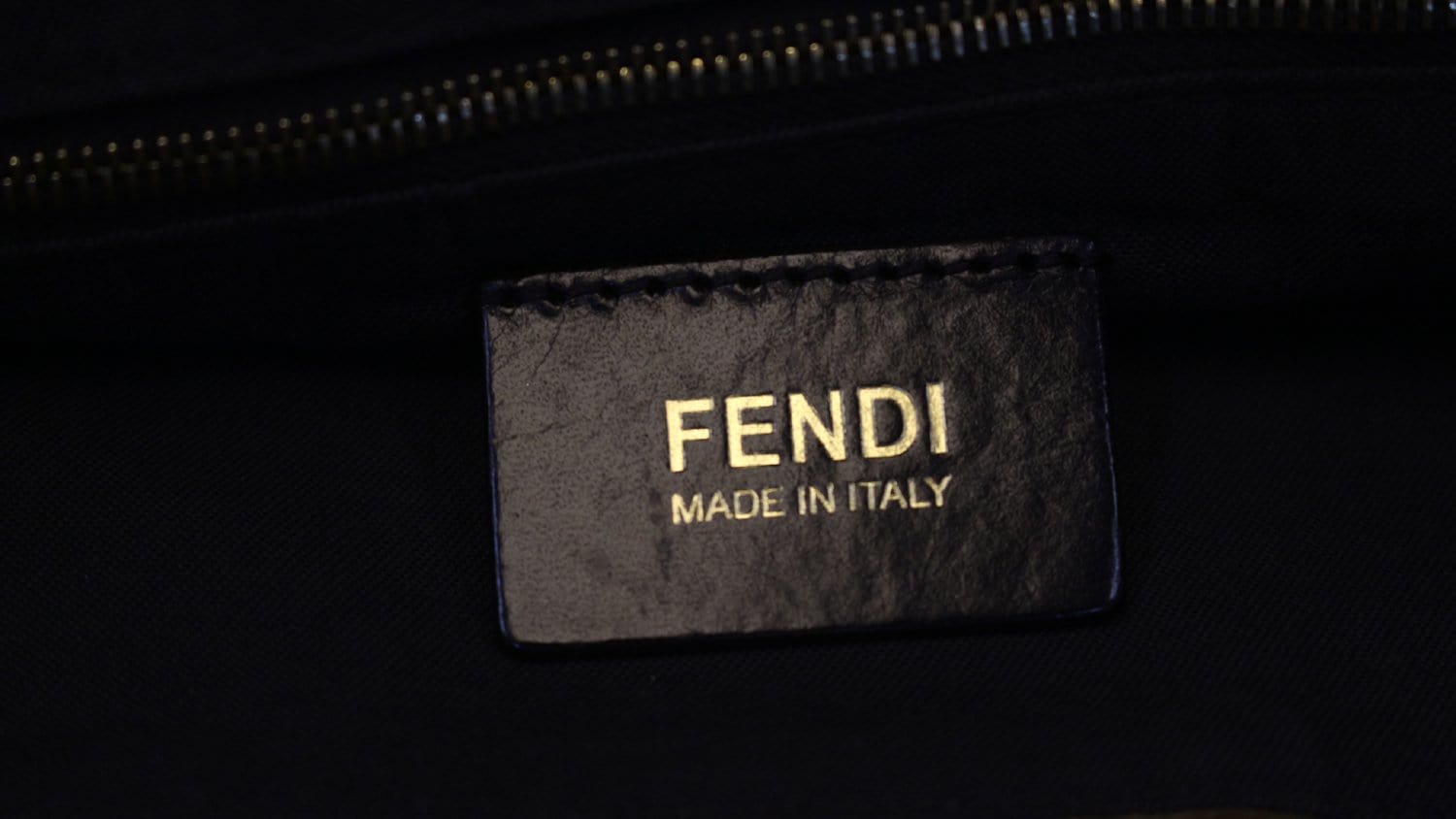 Fendi Tobacco Pequin stripe print canvas, this bag has contrasting leather accents and a bright Red color-pop shoulder strap that buckles with a modern accent of a monogrammed buckle.