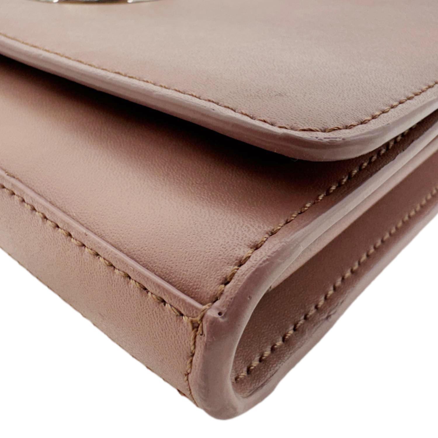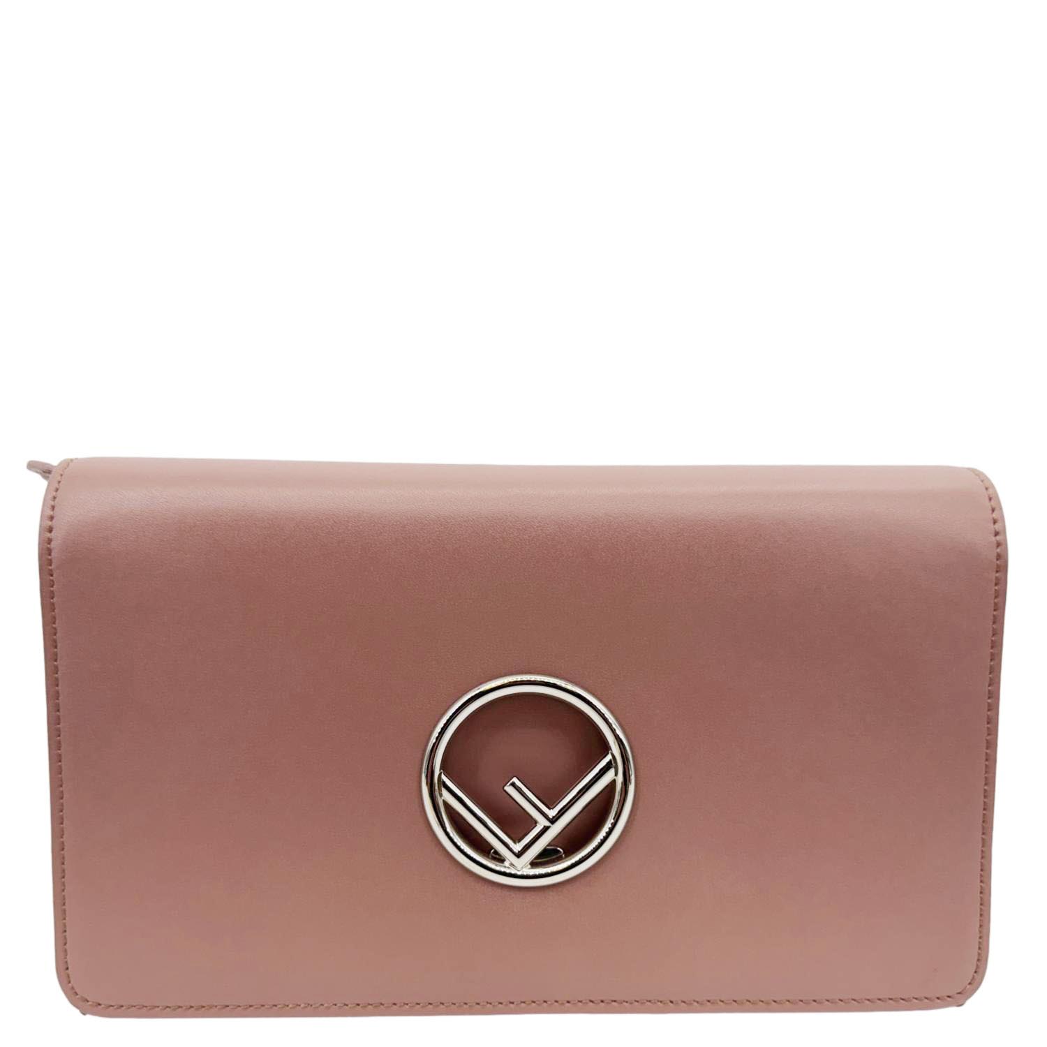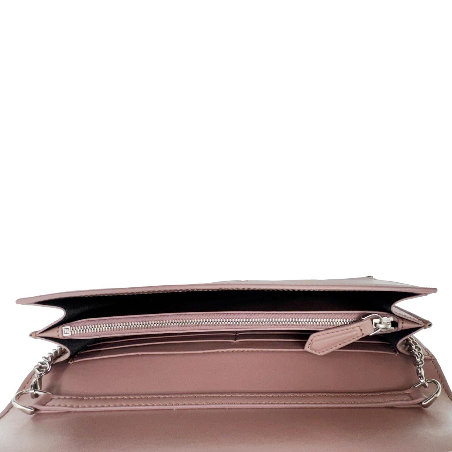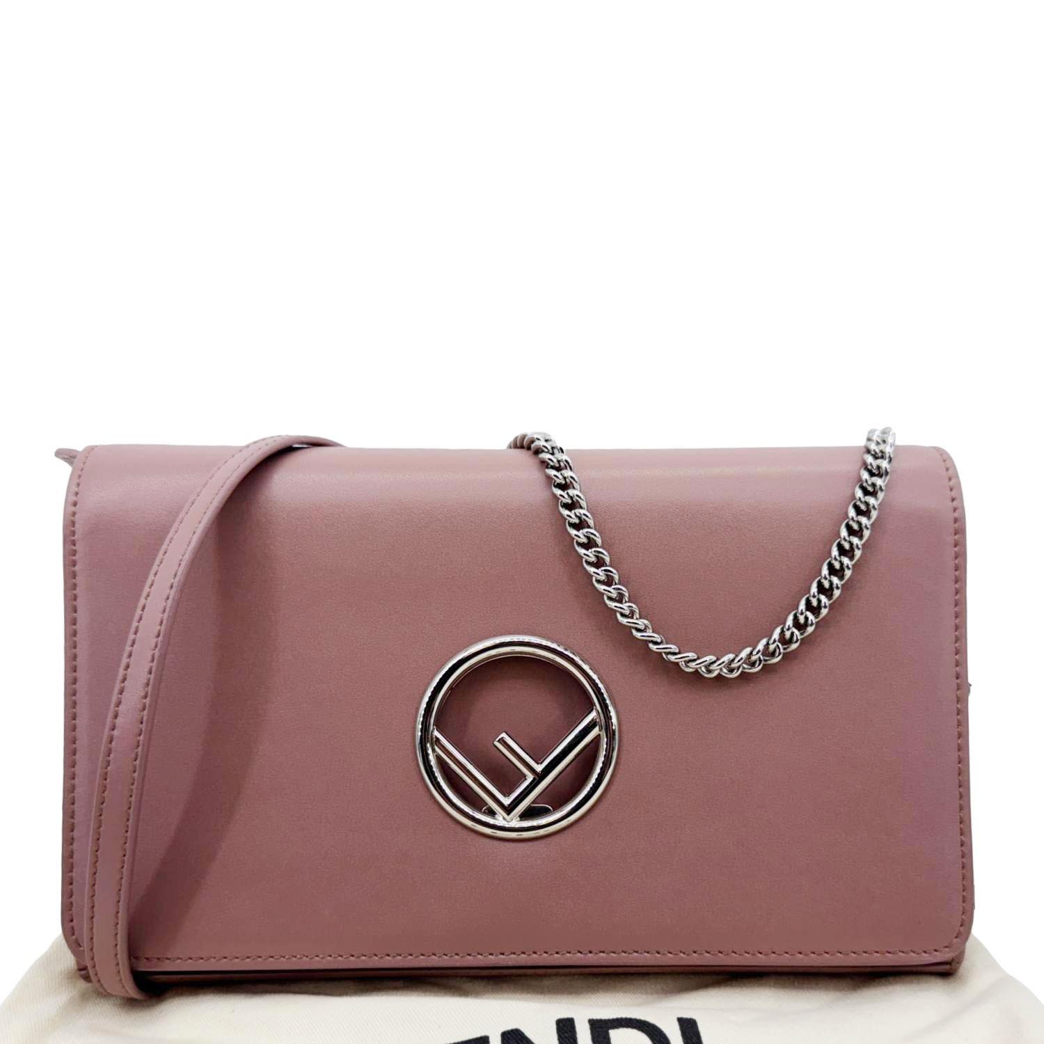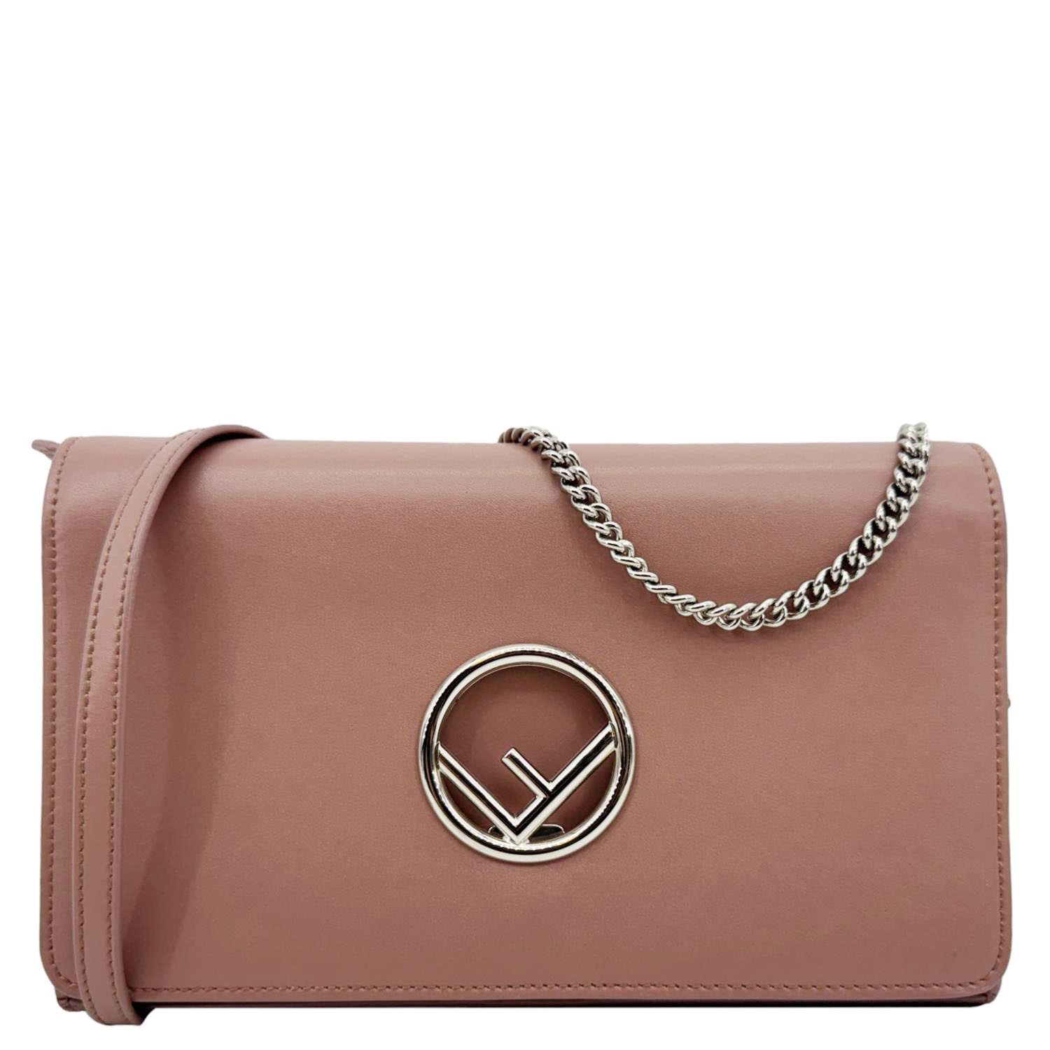 The FENDI Vitello Cruise "F is Fendi" Wallet on Chain in English Rose features smooth leather with the signature F logo clasp. Compact yet functional, it includes a detachable chain strap for versatile day-to-night wear.