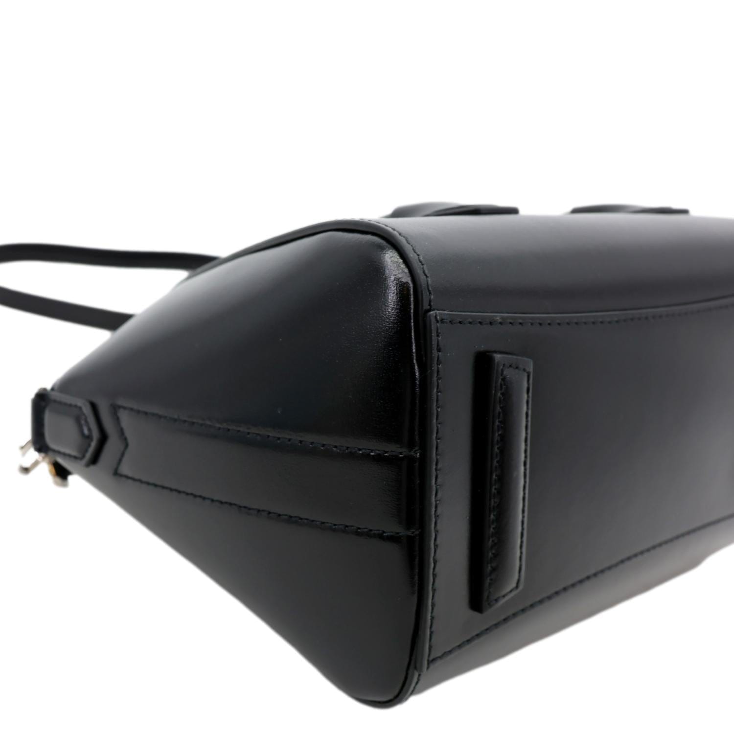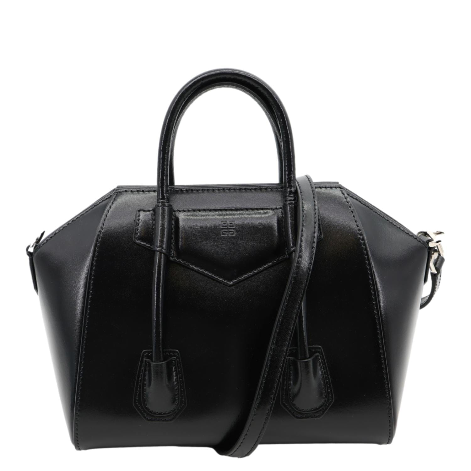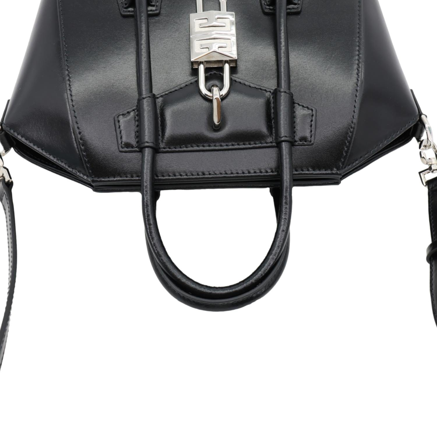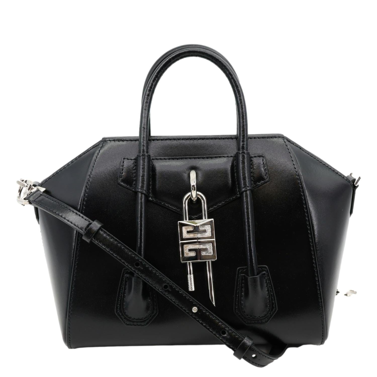 The GIVENCHY Antigona Lock Shoulder Bag in black leather features a structured silhouette with a signature lock detail, perfect for chic everyday wear. Sleek and versatile, it elevates any outfit with modern elegance.