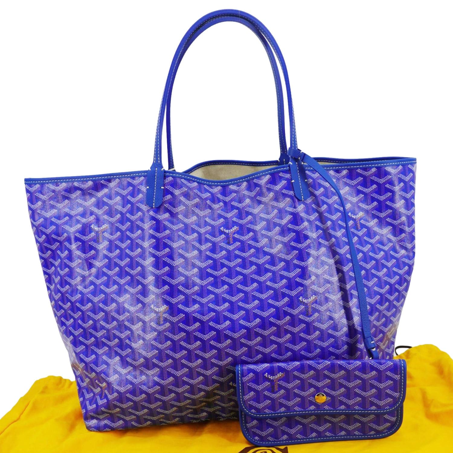 The Goyard Saint Louis PM Chevron Print Canvas Tote Bag in blue is a lightweight, versatile tote crafted from the brand's iconic chevron-printed canvas. Its spacious interior and removable pouch make it a perfect choice for everyday use or travel.