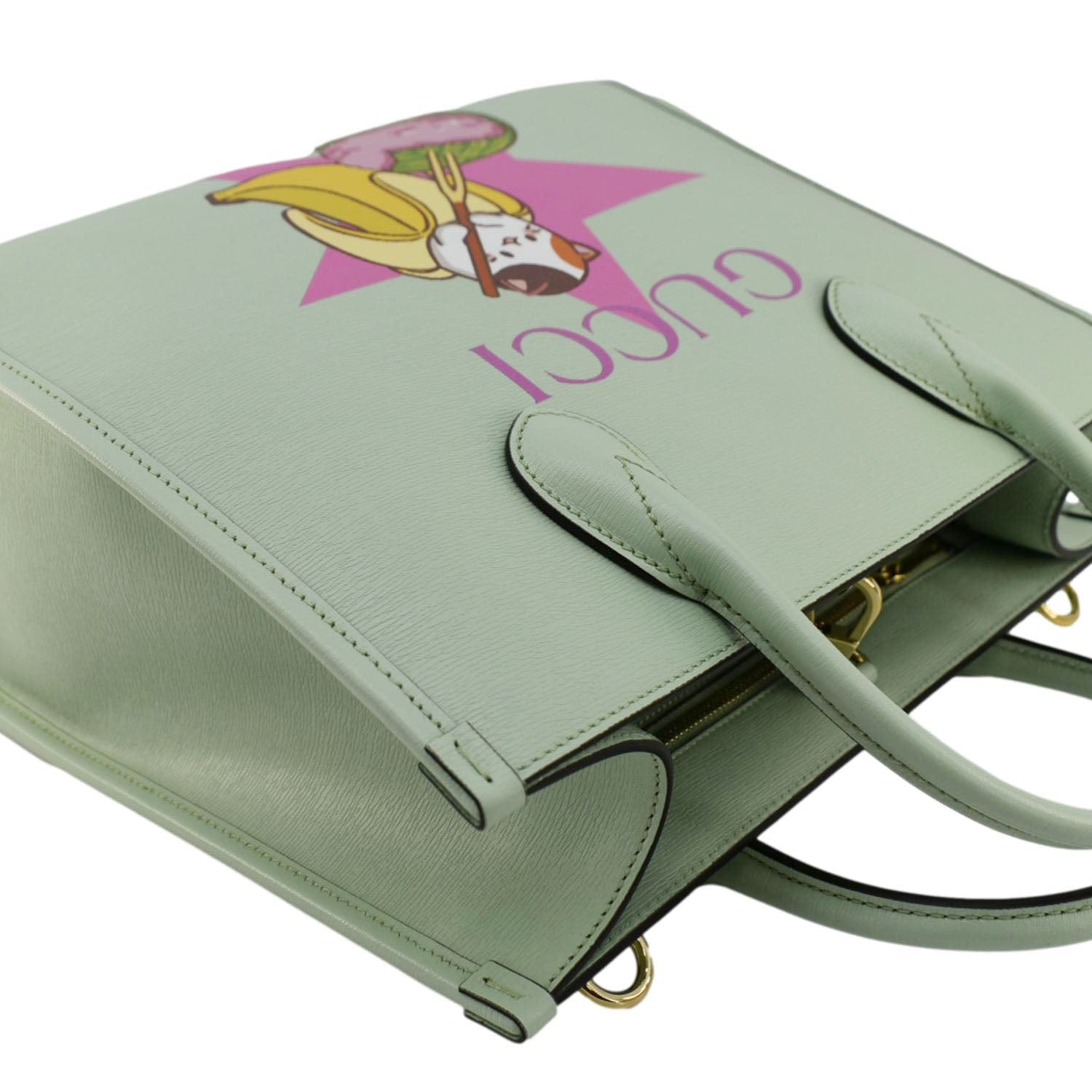 The Gucci Bananya Print Small Leather Tote Bag in green (659983) features a playful banana print on luxurious green leather. Its compact size, sturdy handles, and fun design make it a unique and stylish accessory for casual outings.