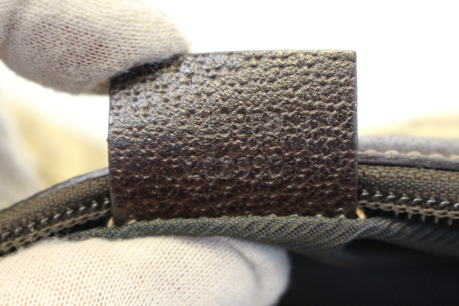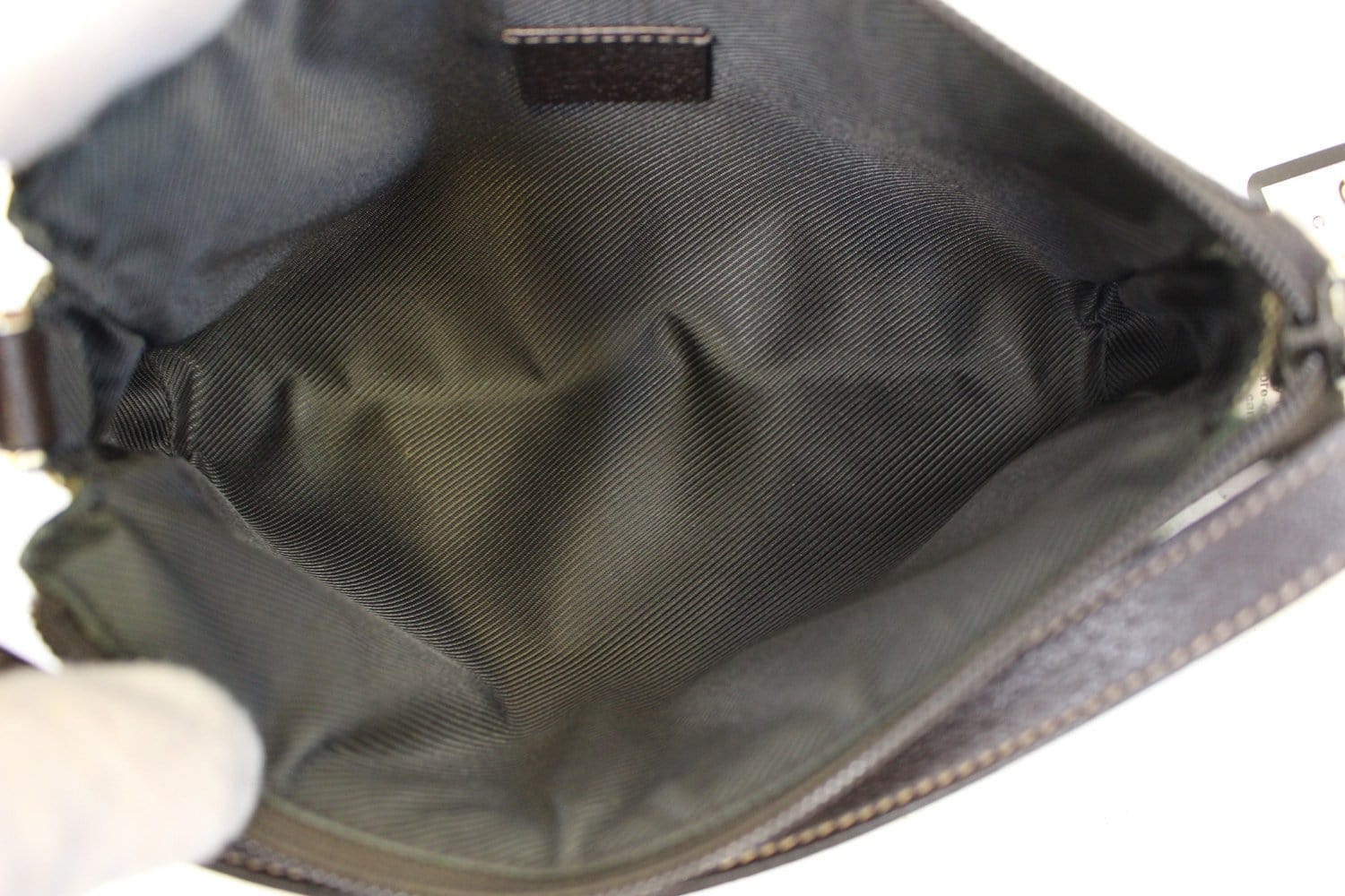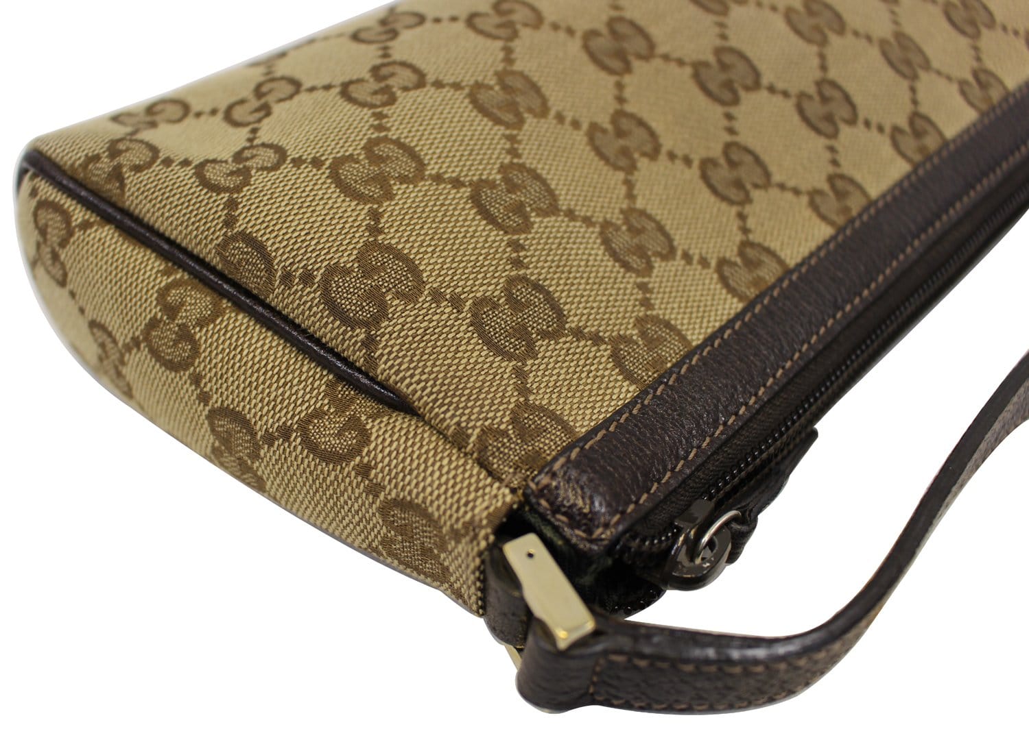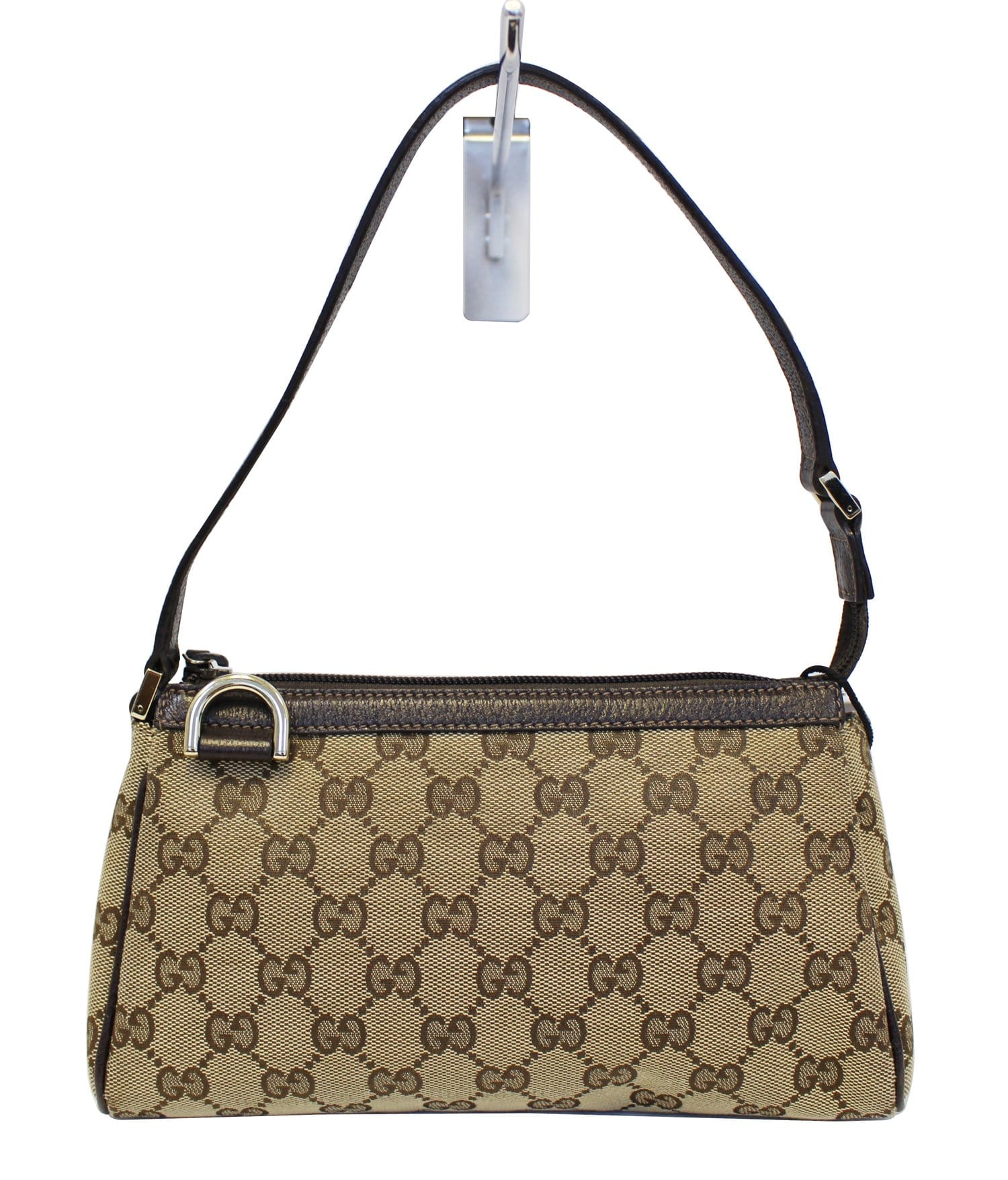 This Gucci Beige/Ebony GG Canvas Abbey D Ring Pochette Bag is perfect for carrying at night or day when you feel like traveling light. It features durable GG canvas with brown leather trim and a small goldtone D-ring.