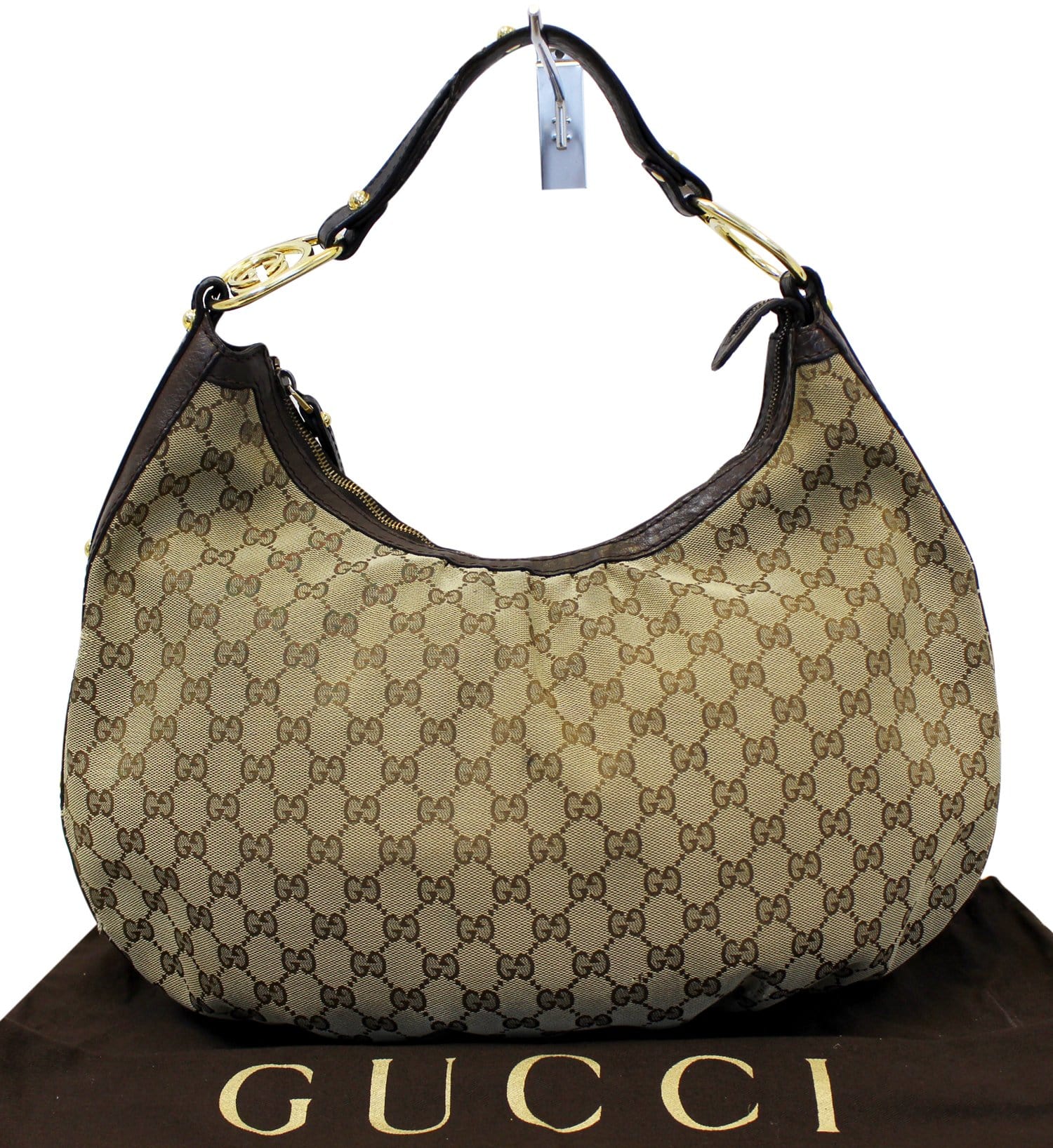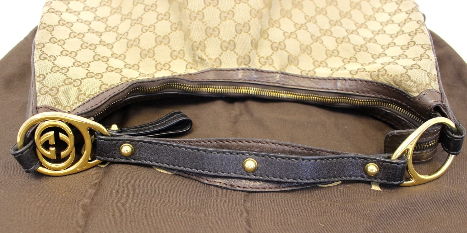 This classic Gucci Beige/Ebony GG Canvas Interlocking G Hobo Bag makes a perfect everyday bag. It features a chic design with a single leather strap with the iconic GG interlocked logo.