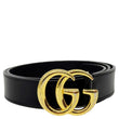 The GUCCI Marmont Thin Leather Belt in Black features a sleek design with the iconic GG buckle in antique gold-tone hardware. Crafted in smooth leather, this Size 85/34 belt adds a refined touch to both casual and formal looks.