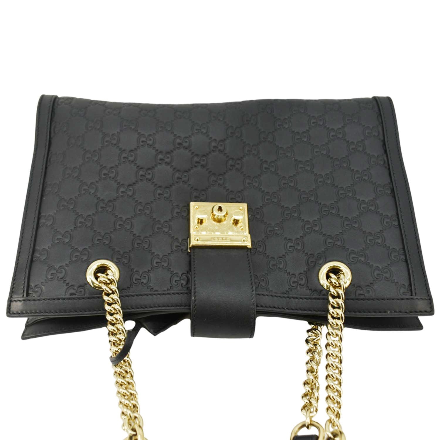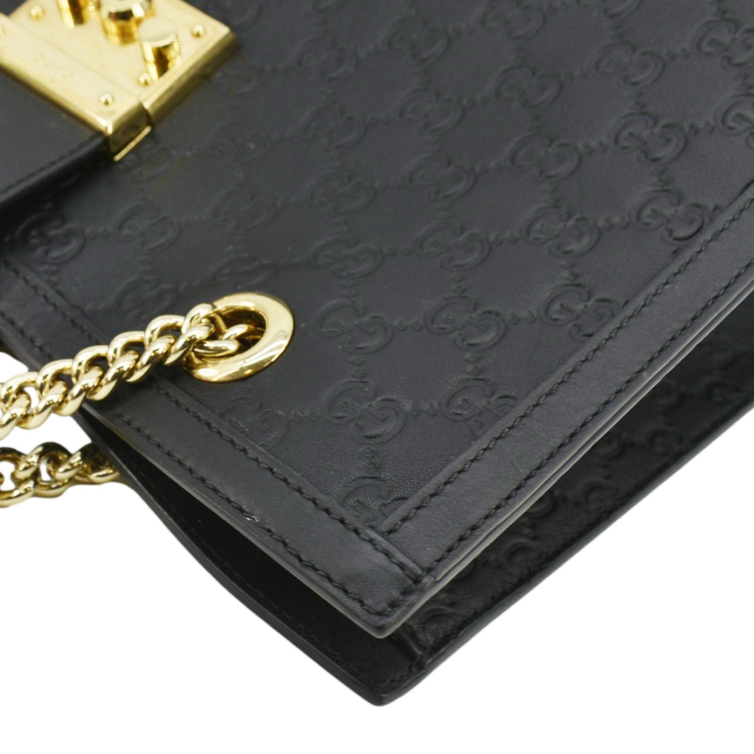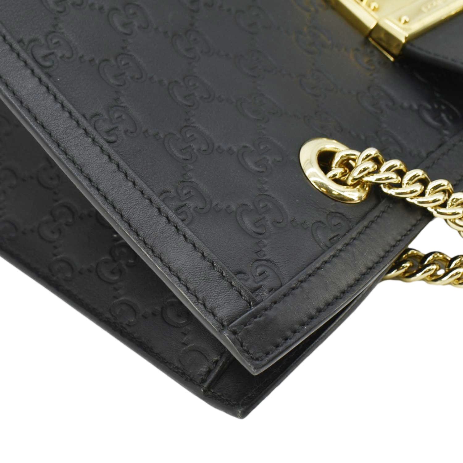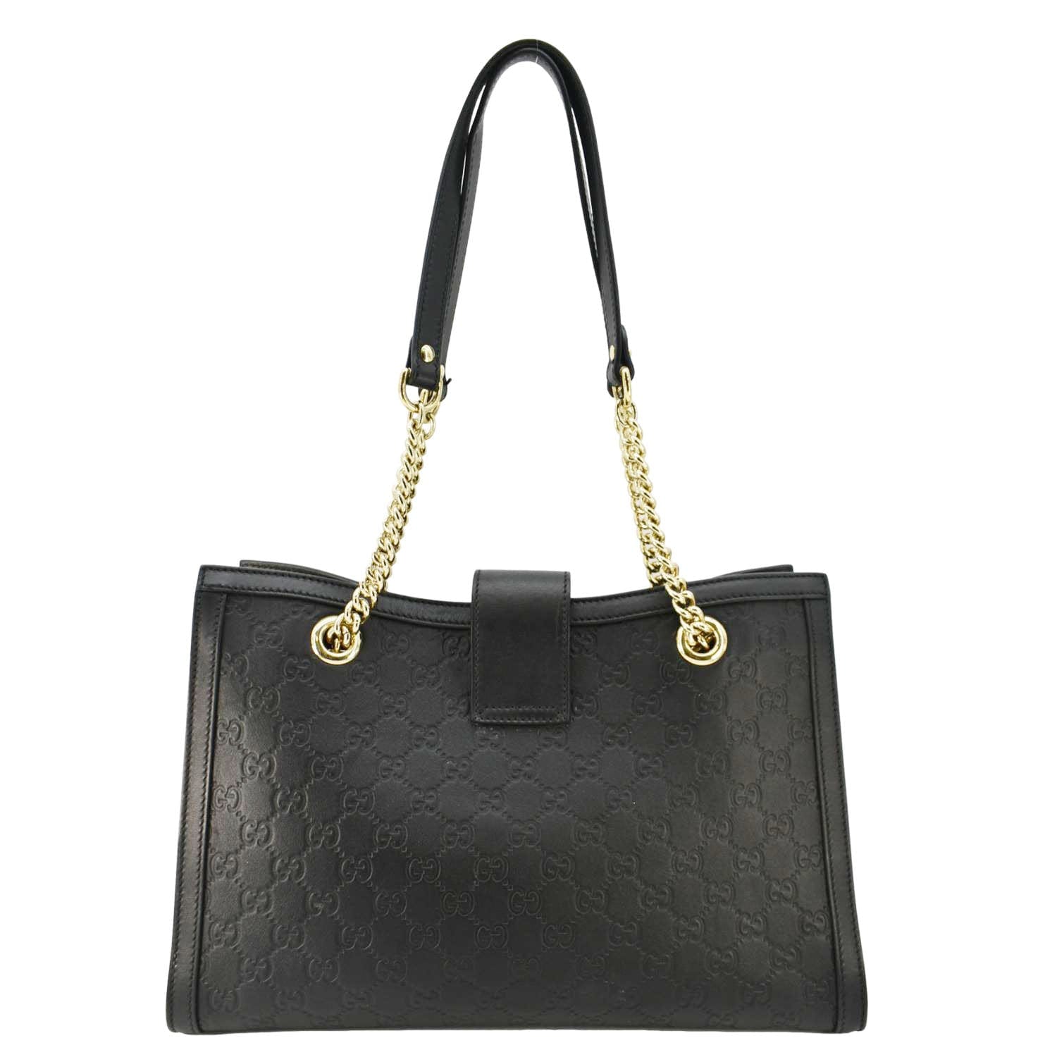 The Gucci Padlock Medium Shoulder Bag in black Guccissima leather features an elegant structured design with the iconic GG pattern, complemented by gold-tone hardware and a secure padlock closure. Its versatile chain strap offers both shoulder and crossbody styling.