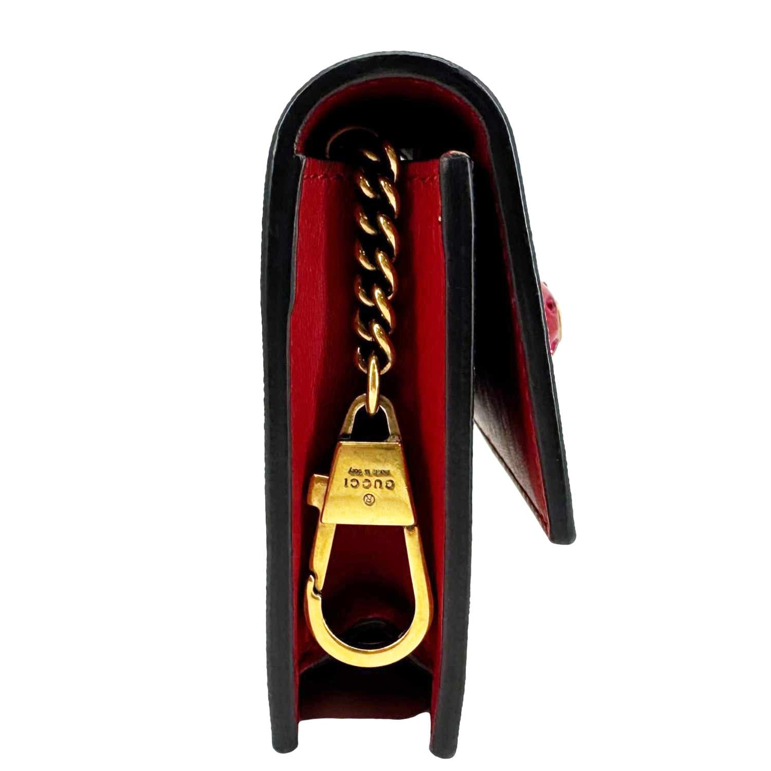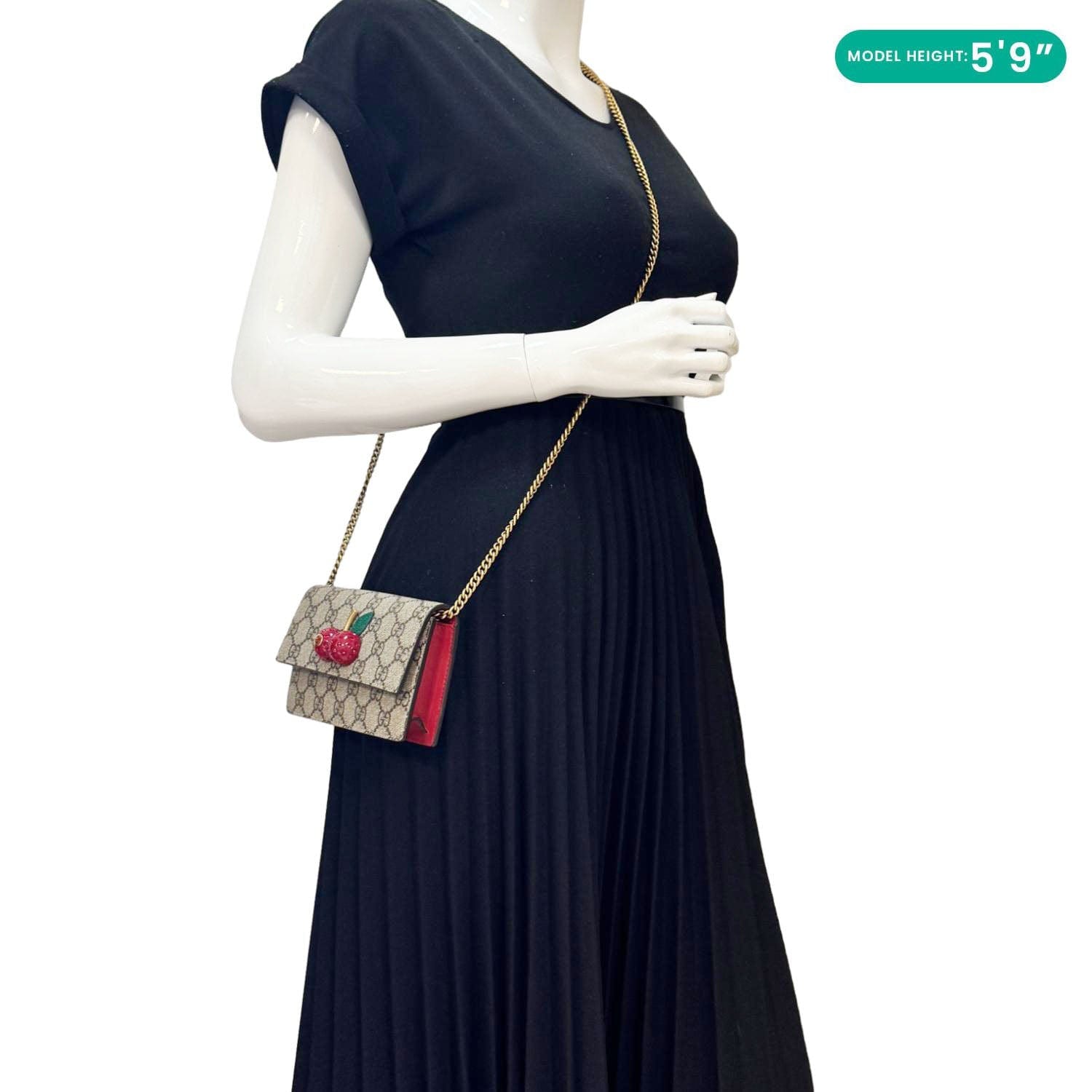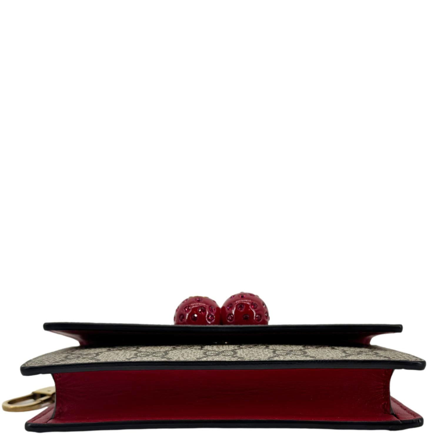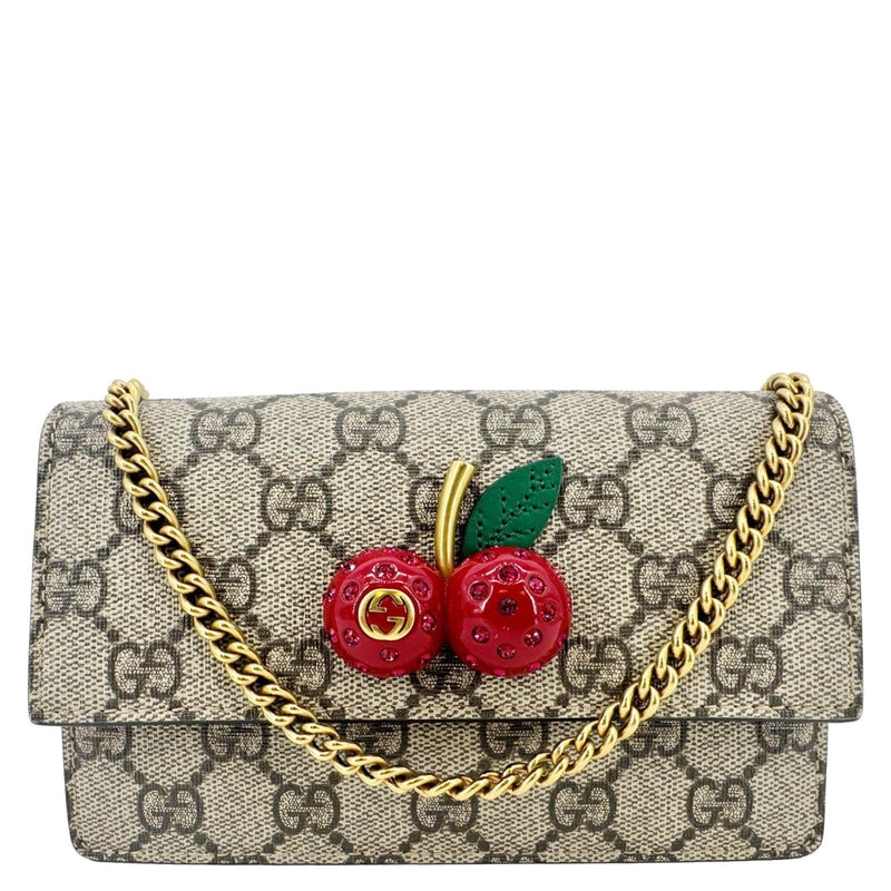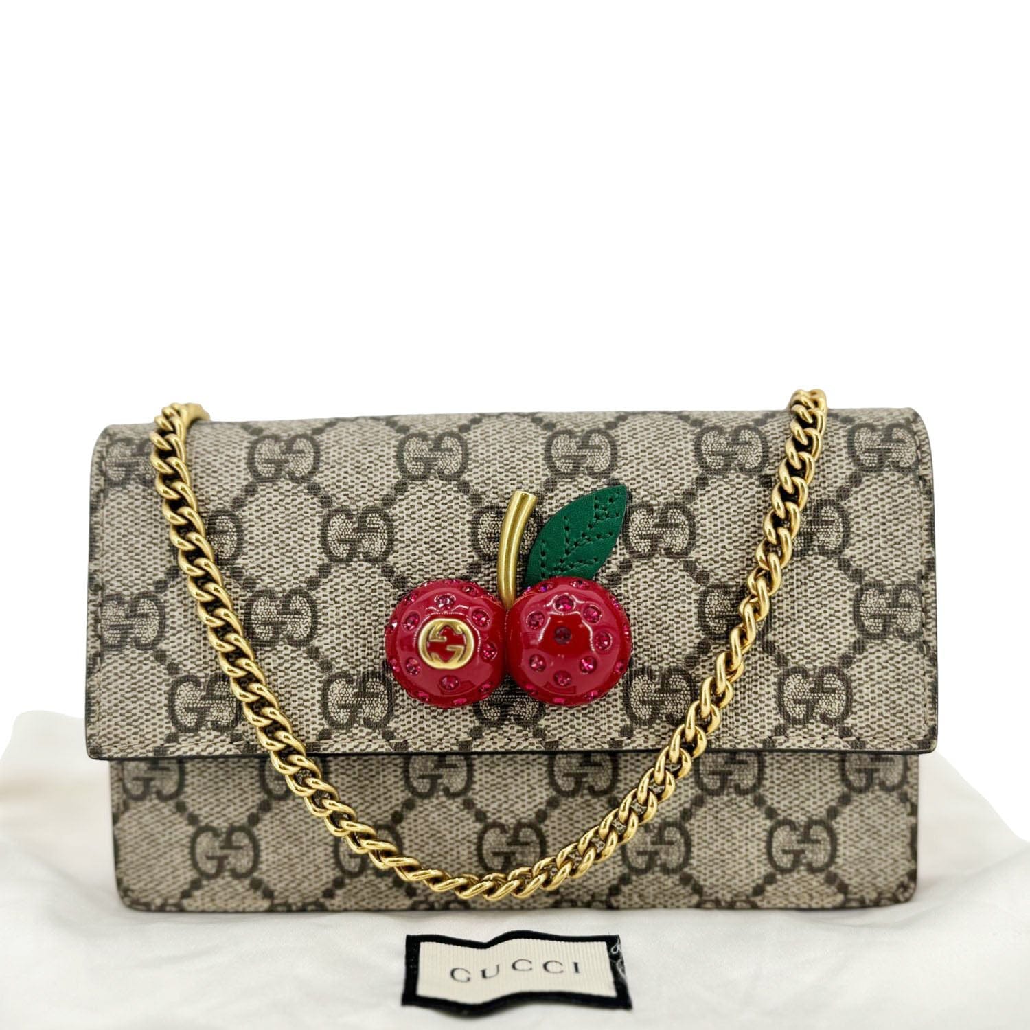 The Gucci Cherry Mini Chain Wallet is crafted from beige GG Supreme canvas with red leather and a crystal-studded cherry ornament. Compact yet eye-catching, it features a flap closure and detachable chain strap for versatile wear.
