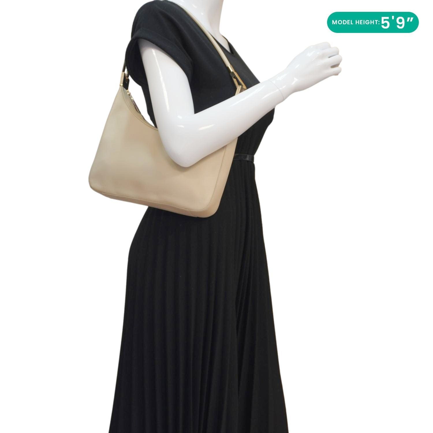 The Gucci Leather Shoulder Bag in cream is a refined everyday piece featuring smooth leather construction and gold-tone hardware. Its structured shape and classic design make it both elegant and versatile.