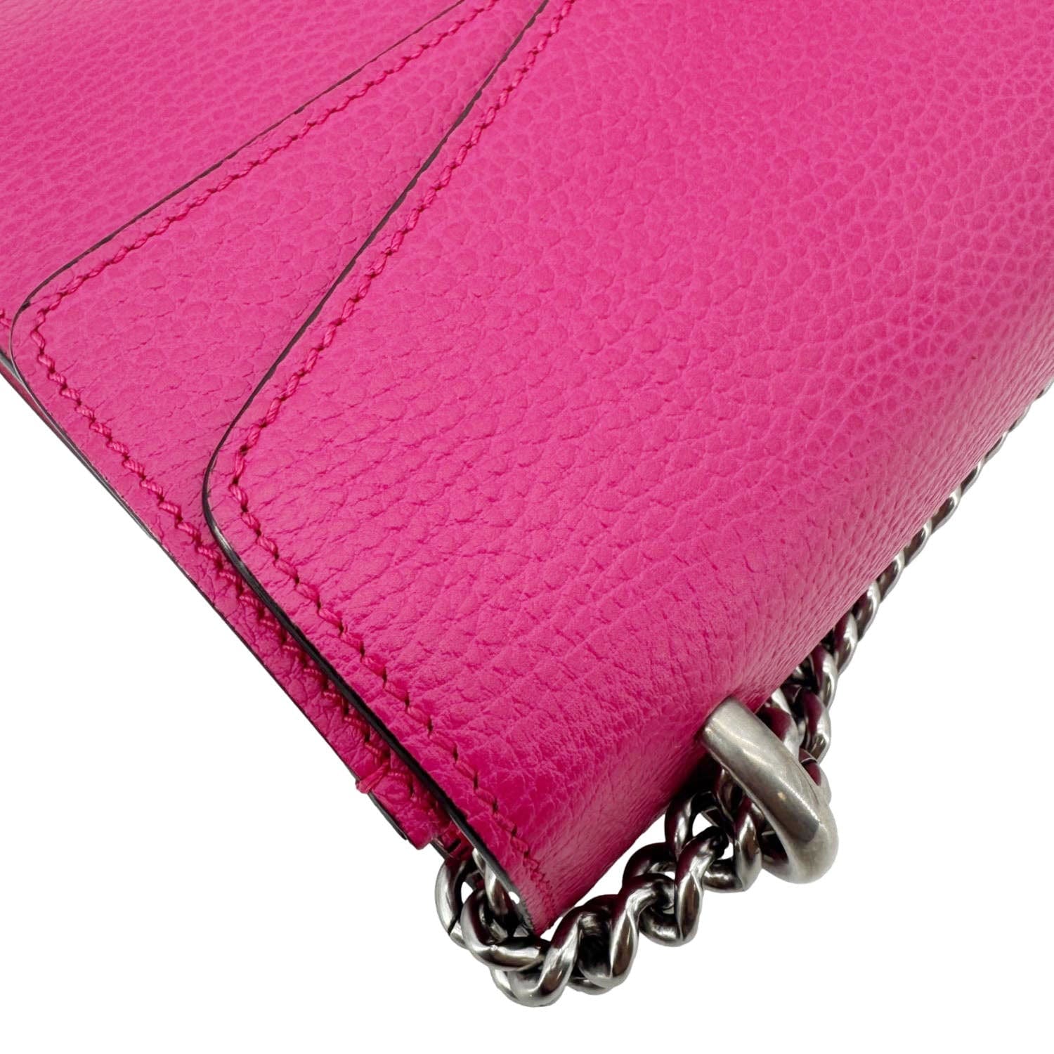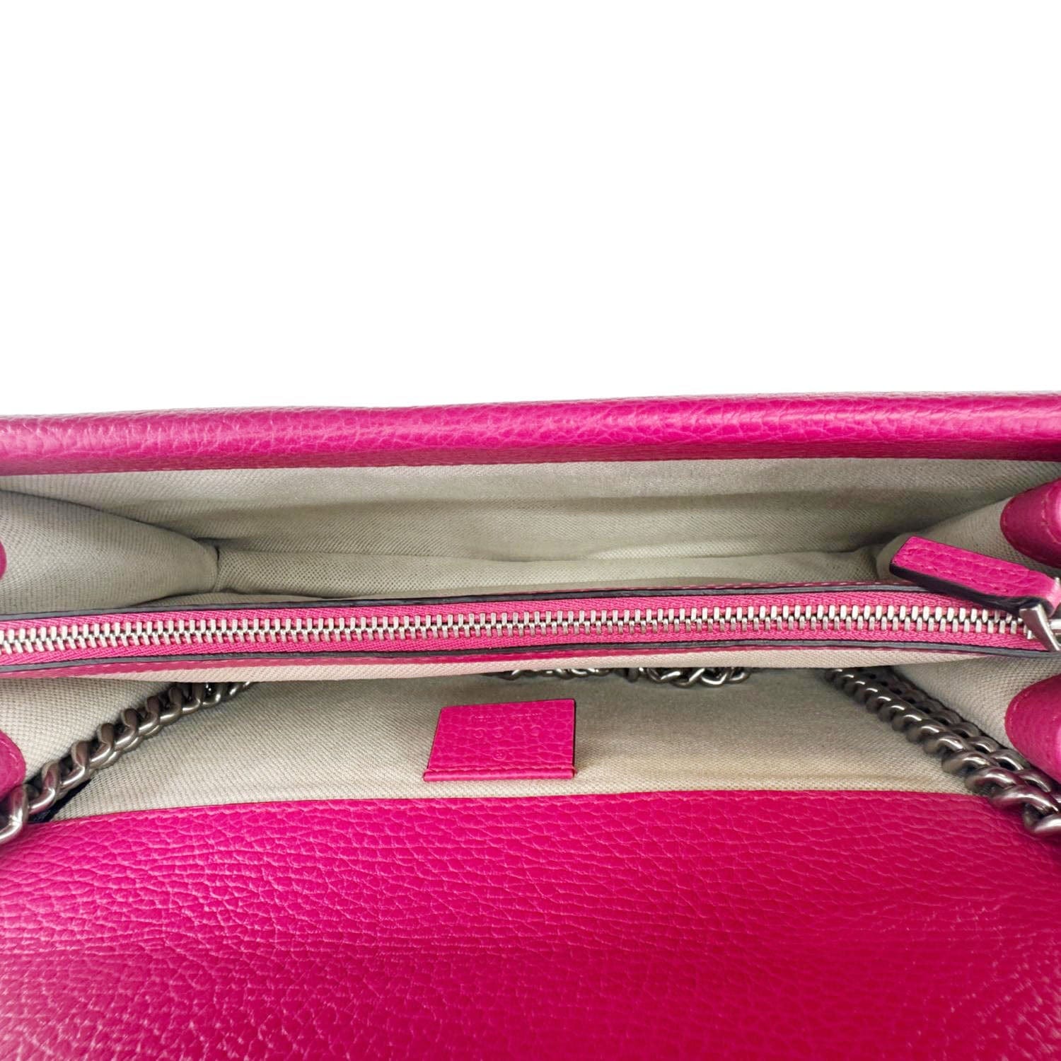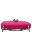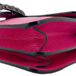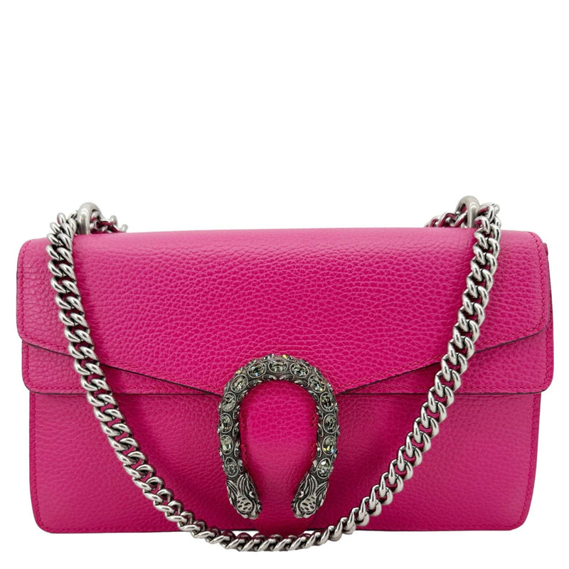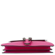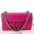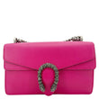 Gucci Dionysus Small Calfskin Leather Crossbody Bag in pink features smooth leather construction and the signature tiger head spur closure. Its compact design and structured silhouette make it an elegant choice for both day and evening wear.