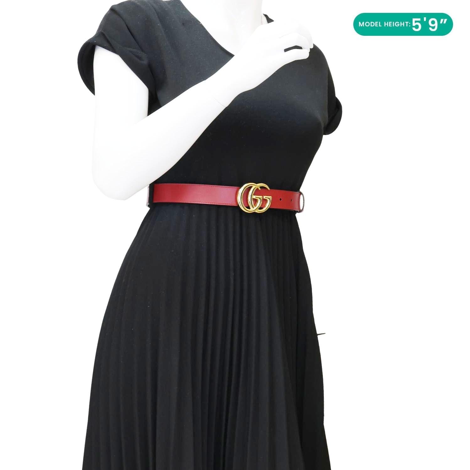 Gucci Marmont belt in red leather with a smooth, polished finish. Features the iconic Double G buckle in antique gold-tone hardware. A bold accessory that adds a statement touch to any outfit.
