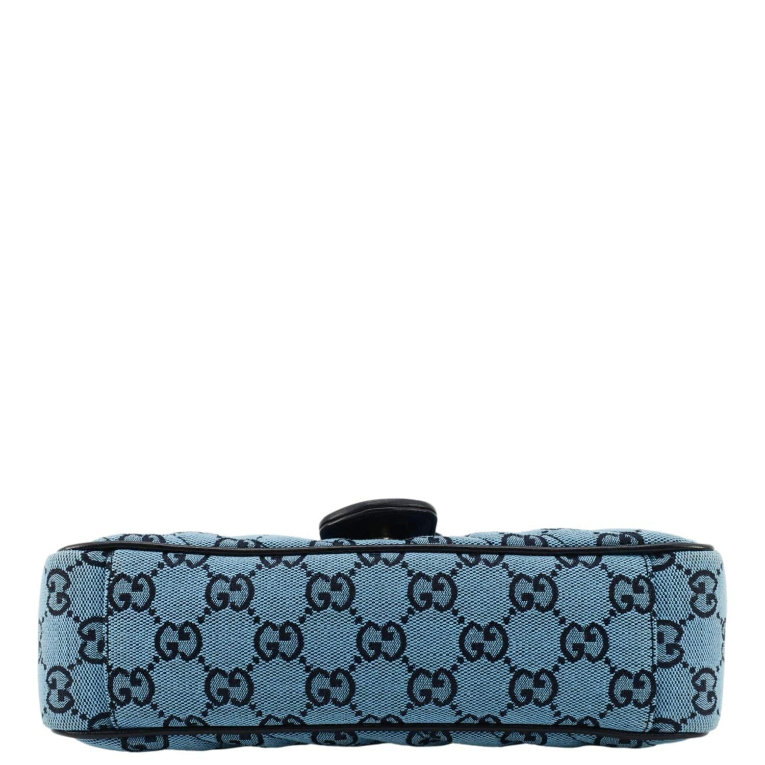 The Gucci GG Marmont Crossbody Bag in blue canvas and leather features a chic, minimalist design with the signature GG logo and a compact, versatile silhouette. Ideal for stylish everyday use, it combines elegance with functionality.