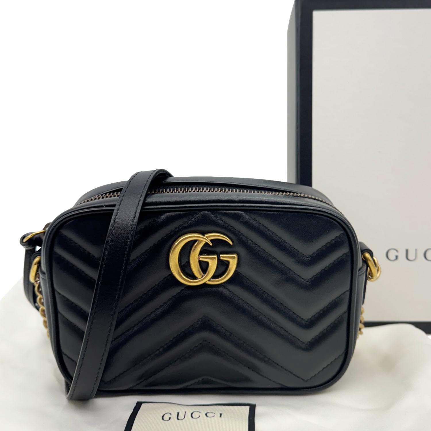 The GUCCI GG Marmont Small Shoulder Bag in black calfskin leather showcases the iconic chevron quilting and antique gold-toned GG logo. With its sliding chain strap and flap closure, it blends timeless style with everyday functionality.