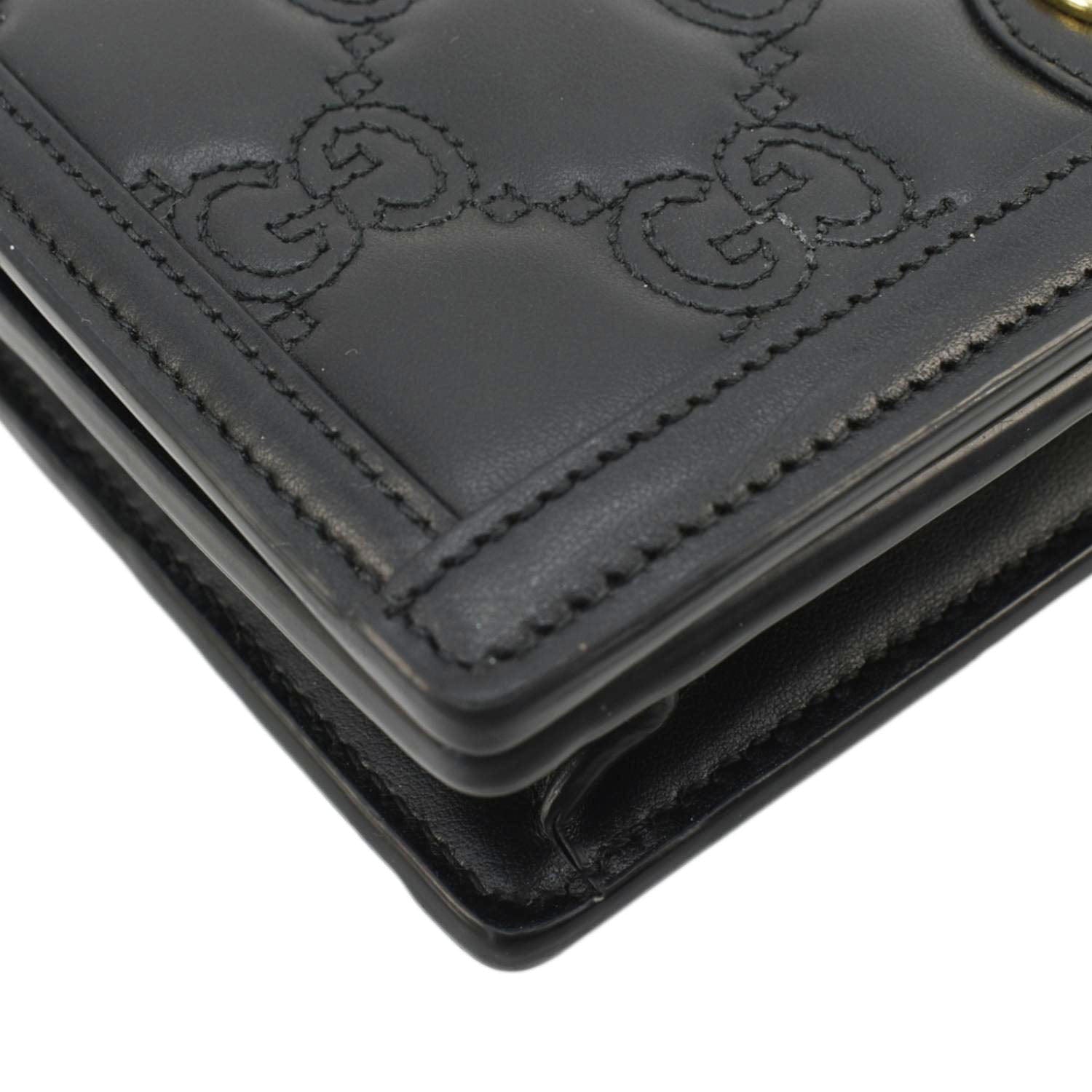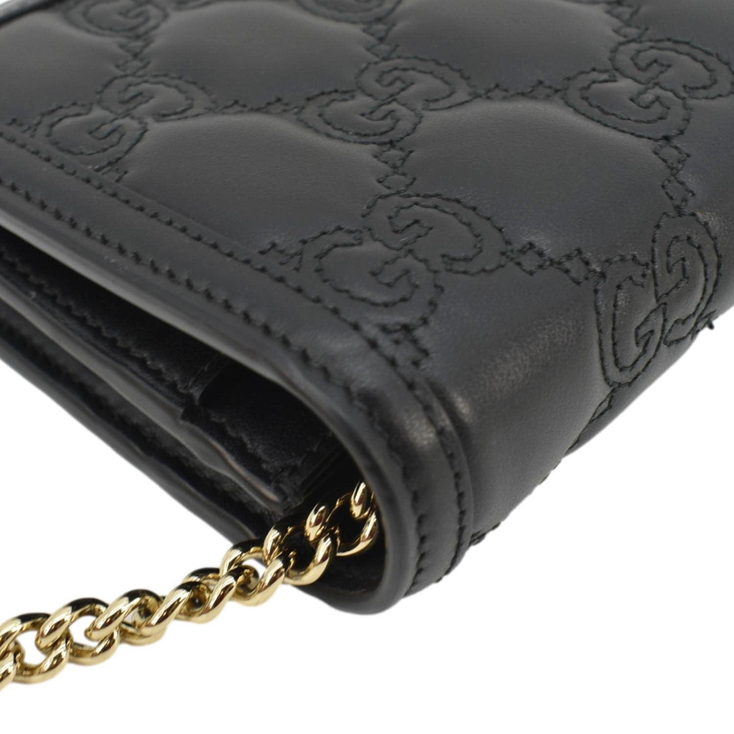 The GUCCI GG Matelassé Leather Chain Wallet Shoulder Bag in black features a quilted leather design with the iconic GG logo, combining elegance and versatility. It includes a chain strap, making it perfect for both shoulder wear and as a chic evening accessory.