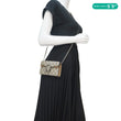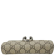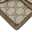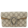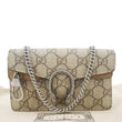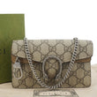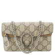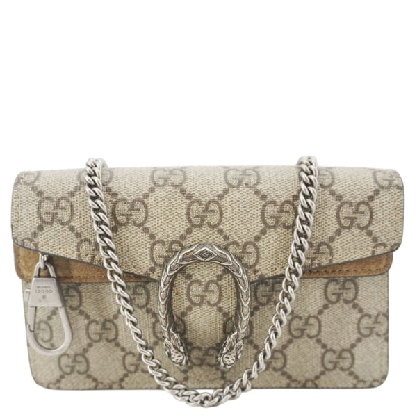 The Gucci Dionysus Super Mini Crossbody Bag in GG Supreme Canvas features a compact design, signature tiger head closure, and a detachable chain strap, making it a chic and versatile statement piece.