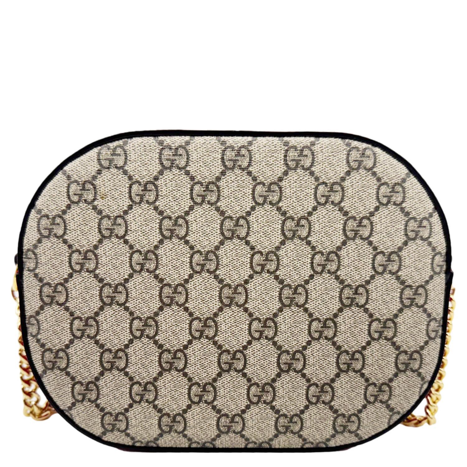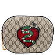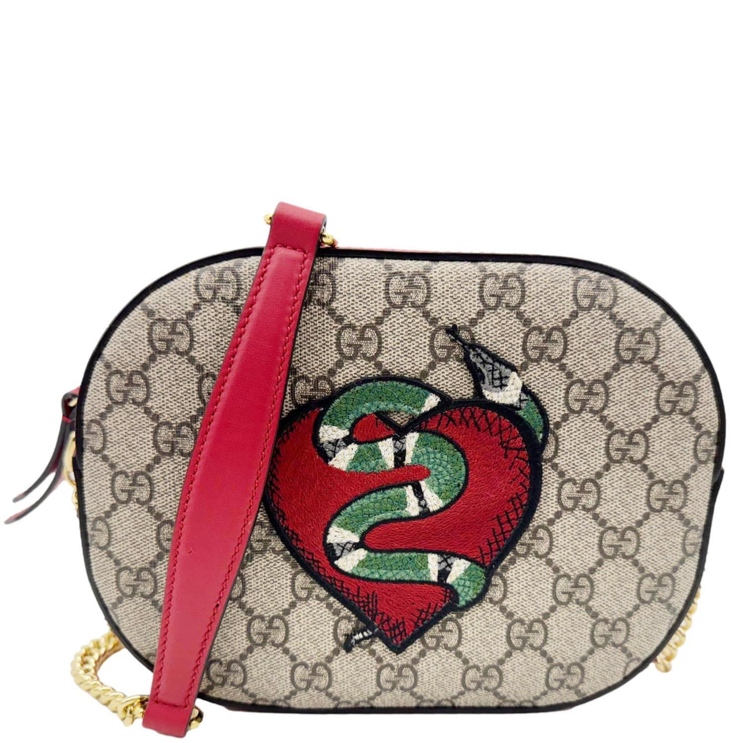 The GUCCI Kingsnake Heart Mini Crossbody features GG Supreme canvas with bold red leather trim and a striking snake-heart motif. Its compact size and chain strap add edgy charm to any outfit.