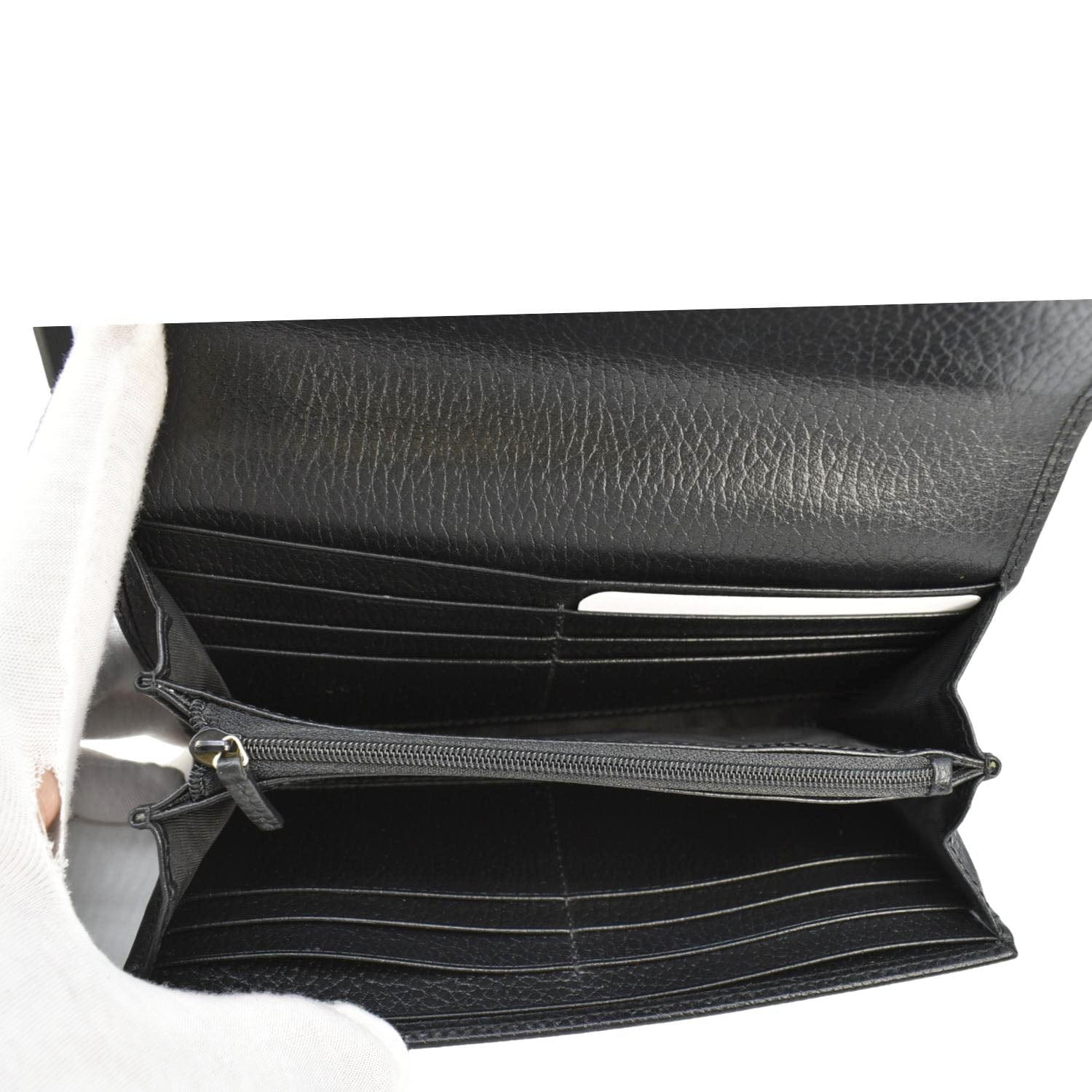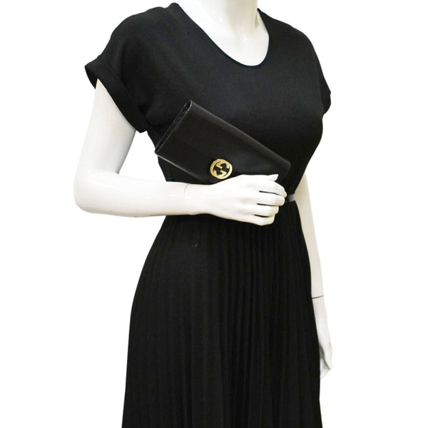 The GUCCI GG Interlocking Calfskin Leather Wallet in Black (615524) features luxurious calfskin leather and the iconic GG interlocking logo. This sleek wallet offers a sophisticated design and ample space for essentials