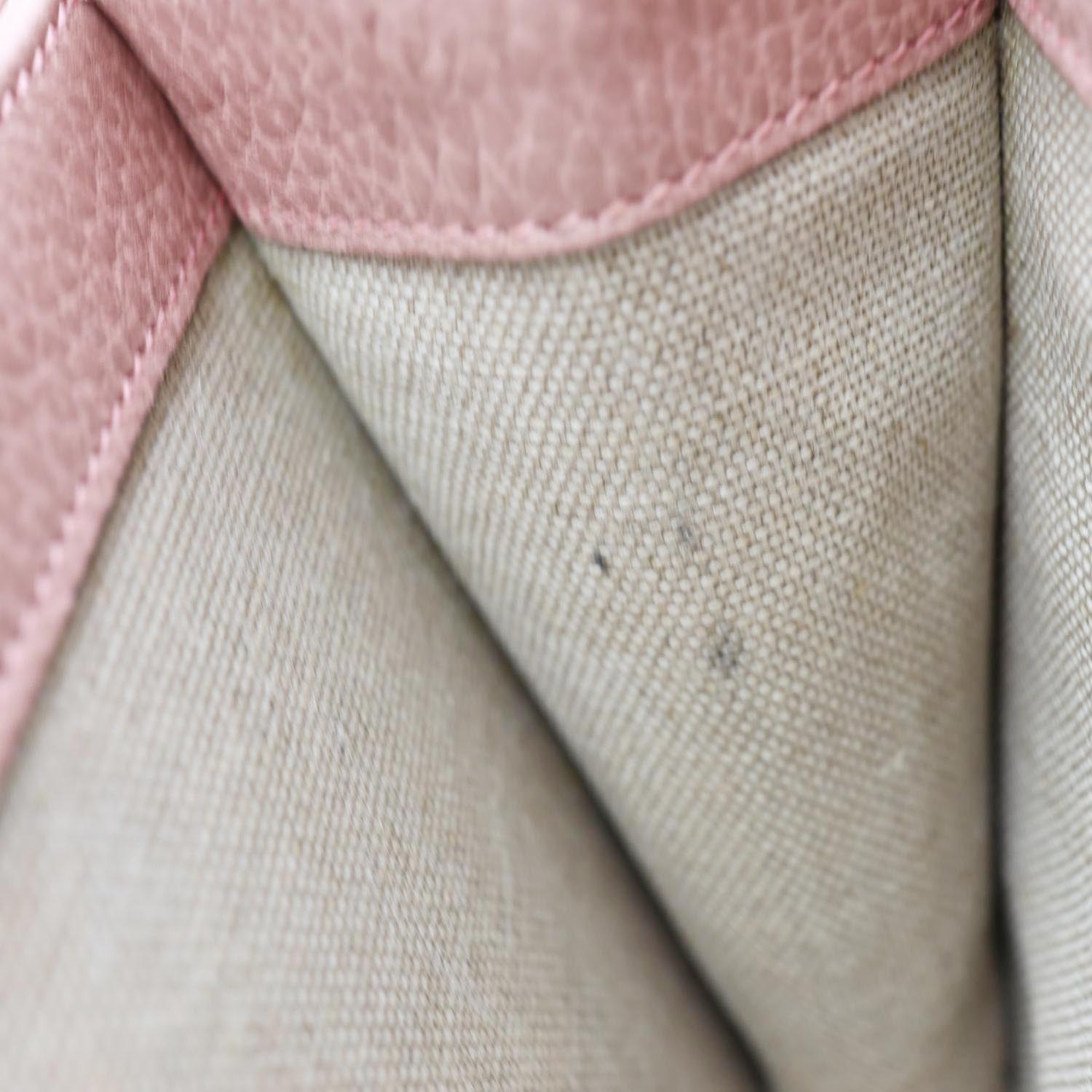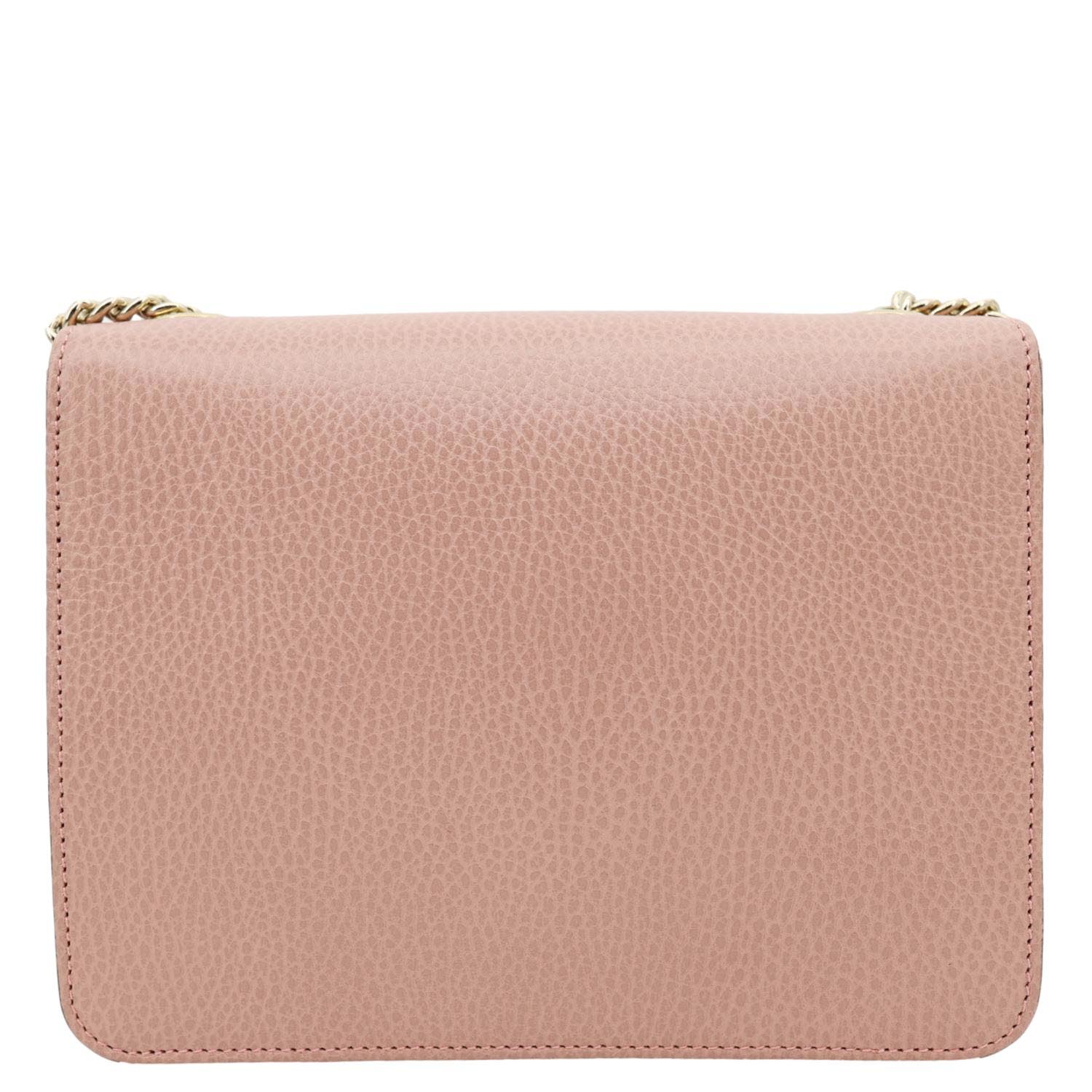 GUCCI Interlocking GG Dollar Calfskin Leather Crossbody Pink features soft textured leather in a pastel hue with a flap closure. Accented by the signature interlocking GG logo and a lightweight chain strap for chic everyday wear.