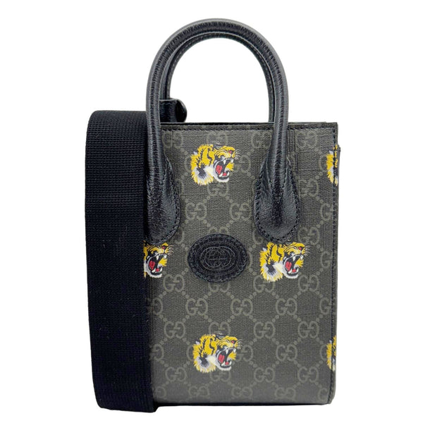 The Gucci Interlocking GG Mini Tote Bag features a bold tiger print over iconic GG Supreme canvas in gray tones. Compact yet stylish, it’s finished with top handles and signature interlocking GG hardware.