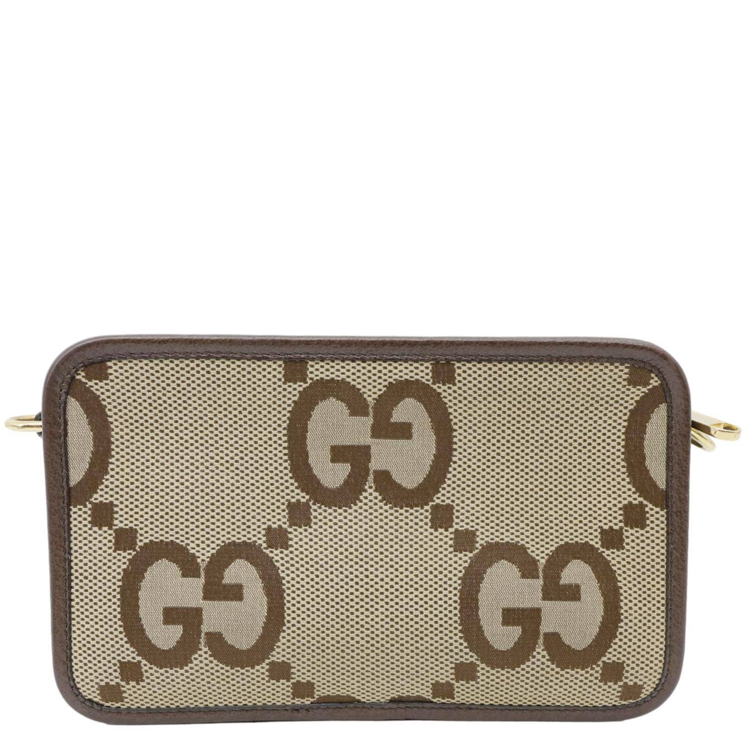 The GUCCI Mini Jumbo GG Canvas Crossbody Bag in beige features the iconic GG canvas pattern with leather trim and a compact design. This stylish crossbody offers a zippered closure and a detachable strap for versatile carrying.