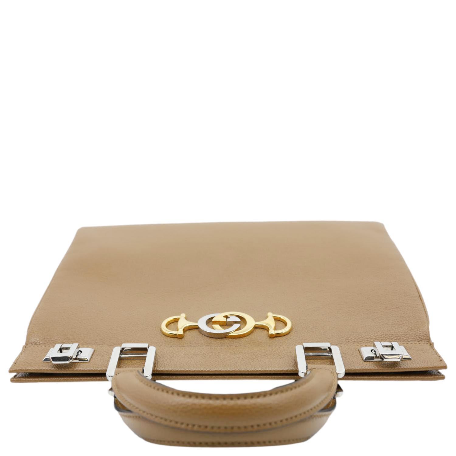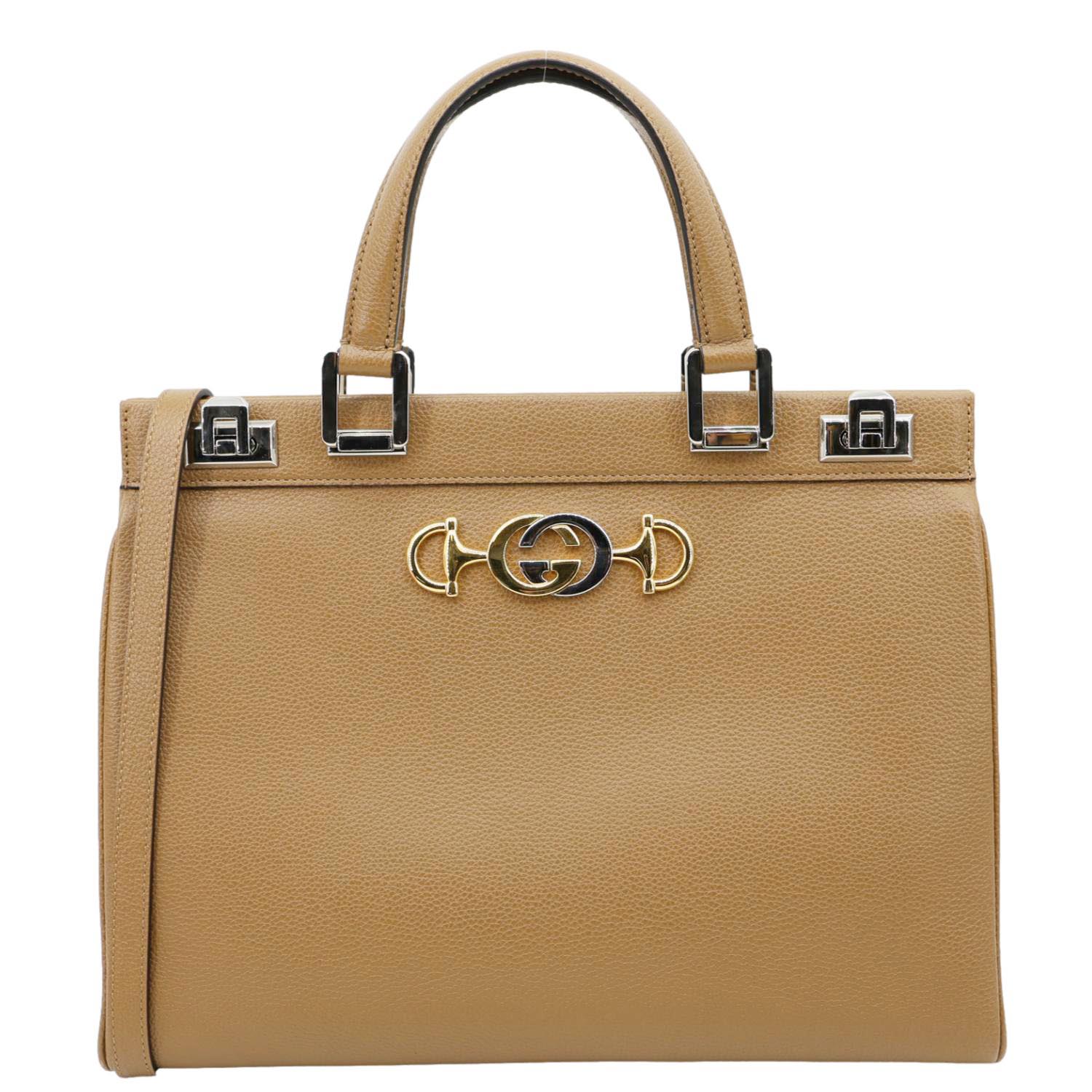 GUCCI Zumi Medium Leather Top Handle Bag Brown features smooth brown leather with signature interlocking G and horsebit hardware for a classic, elegant look. Its structured shape and versatile shoulder strap make it perfect for polished everyday wear.
