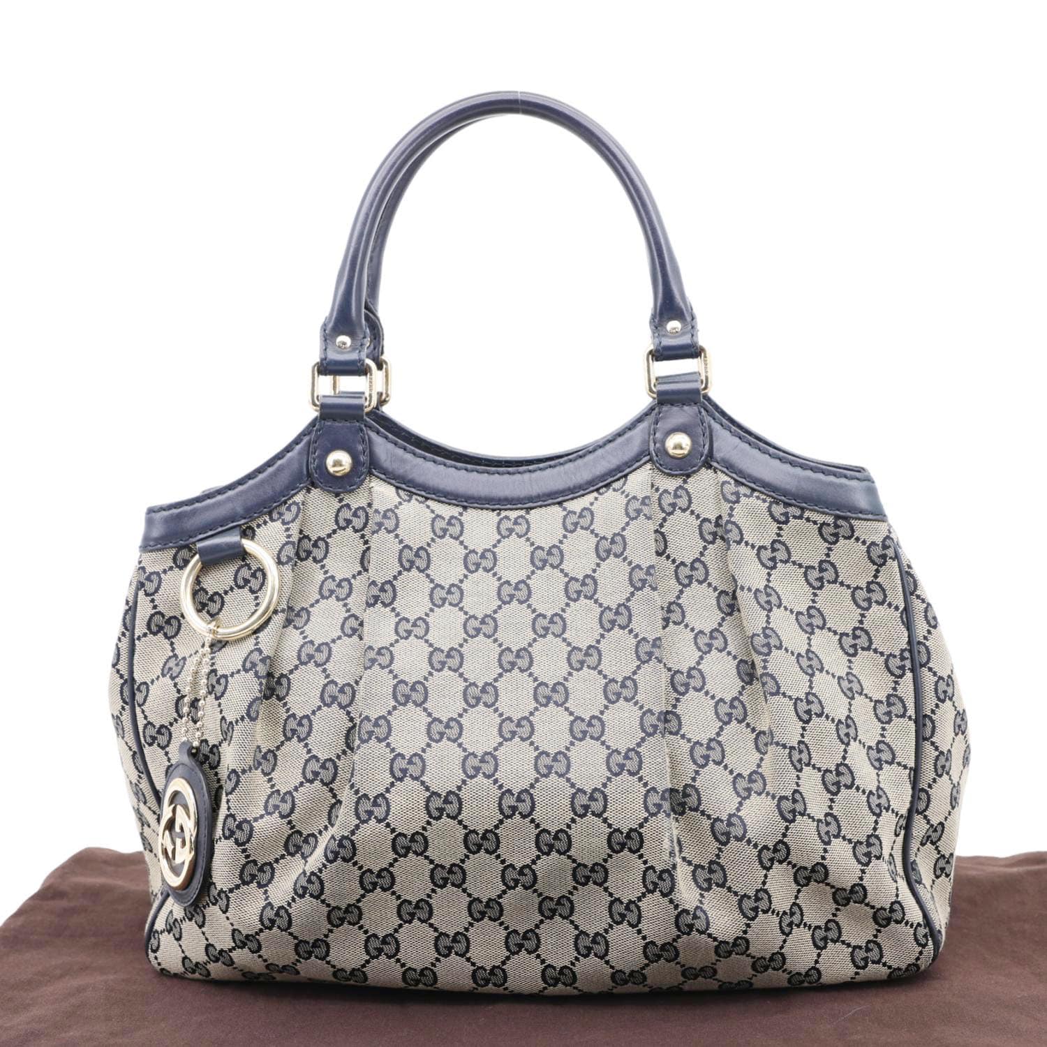 The Gucci Sukey Medium GG Canvas Tote Bag in beige and navy blue features the iconic GG canvas with leather trim. Spacious and stylish, it’s perfect for everyday elegance and functionality.