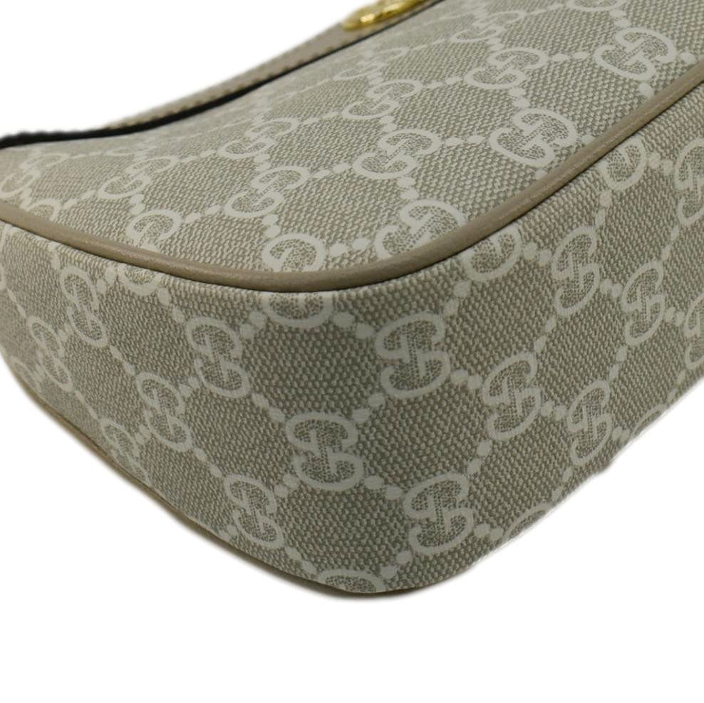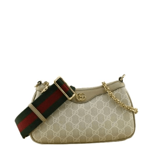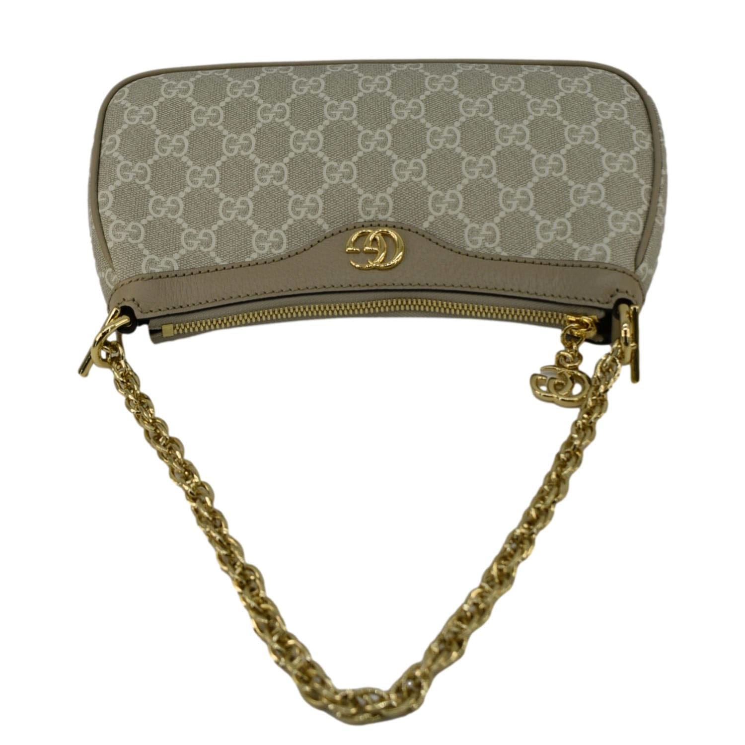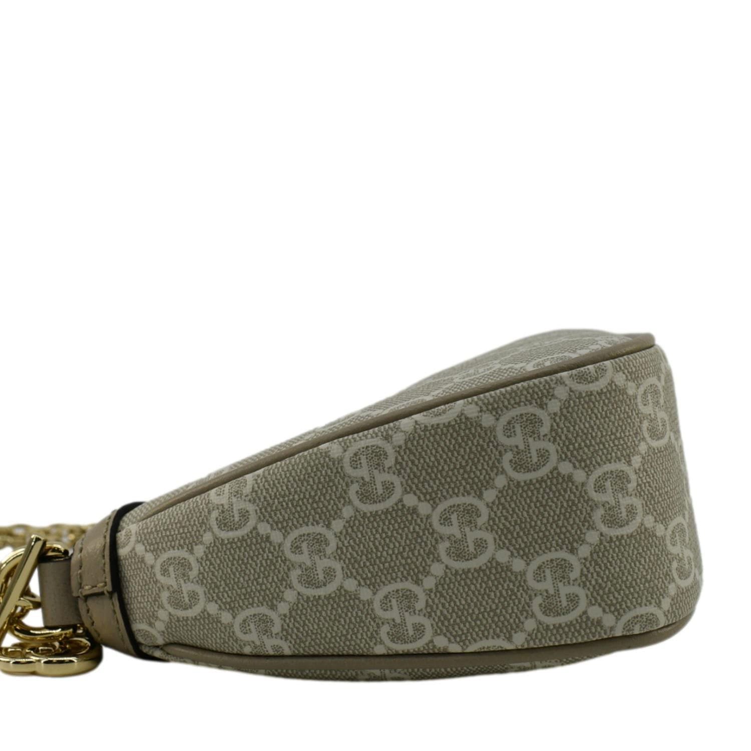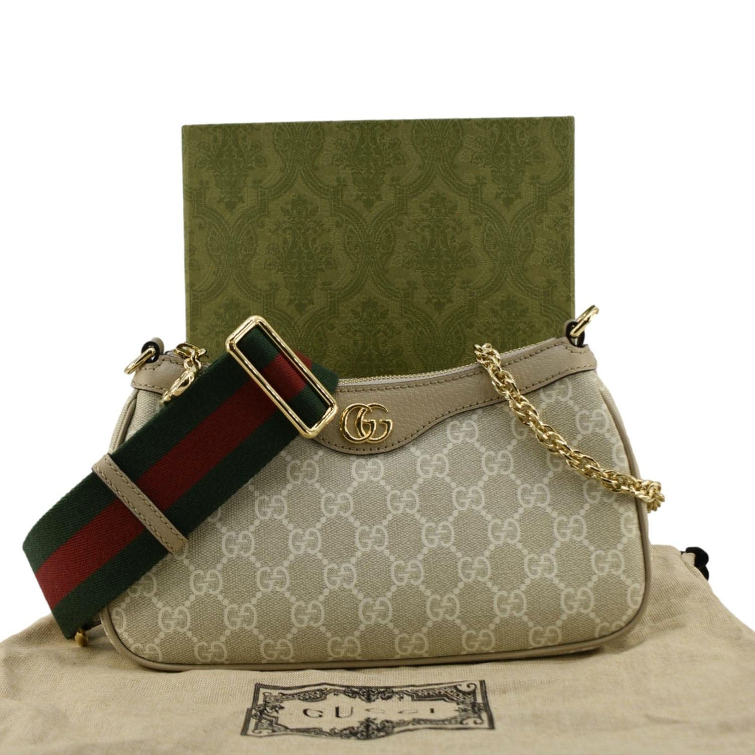 The GUCCI Ophidia Small GG Supreme Canvas Hobo Bag in Beige features the brand's signature GG Supreme canvas with brown leather trim and iconic green-red-green Web stripe. With its sleek, rounded shape and gold-tone hardware, this bag blends vintage charm with modern luxury.