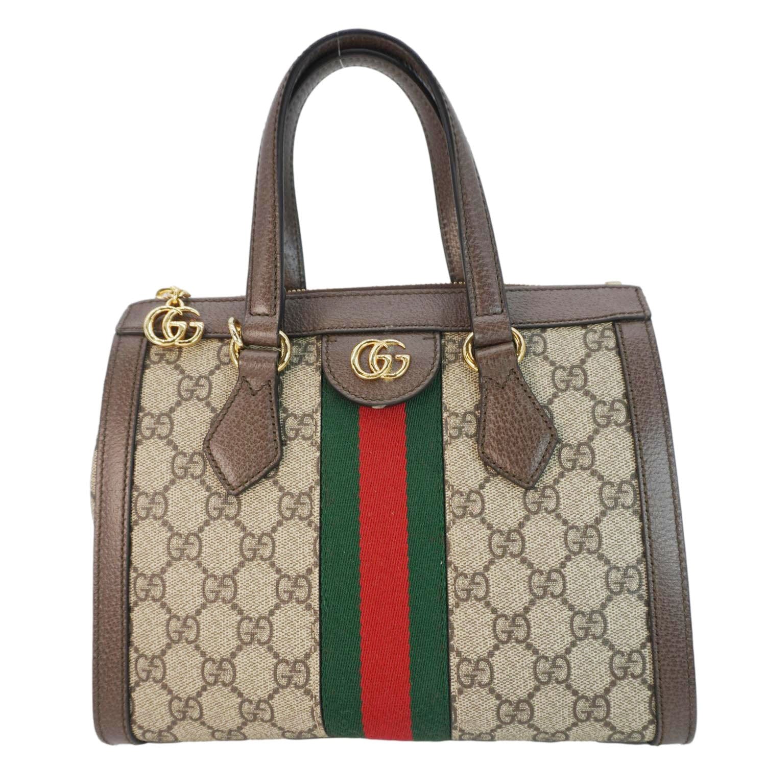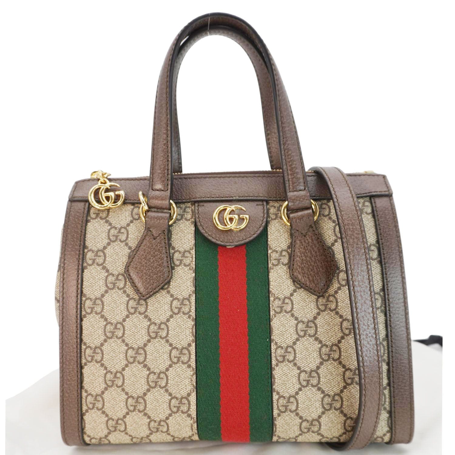 The Gucci Ophidia small GG Supreme canvas tote bag in beige features GG Supreme canvas, signature web detailing, and dual handles for versatile carrying. A compact and elegant design for everyday use.