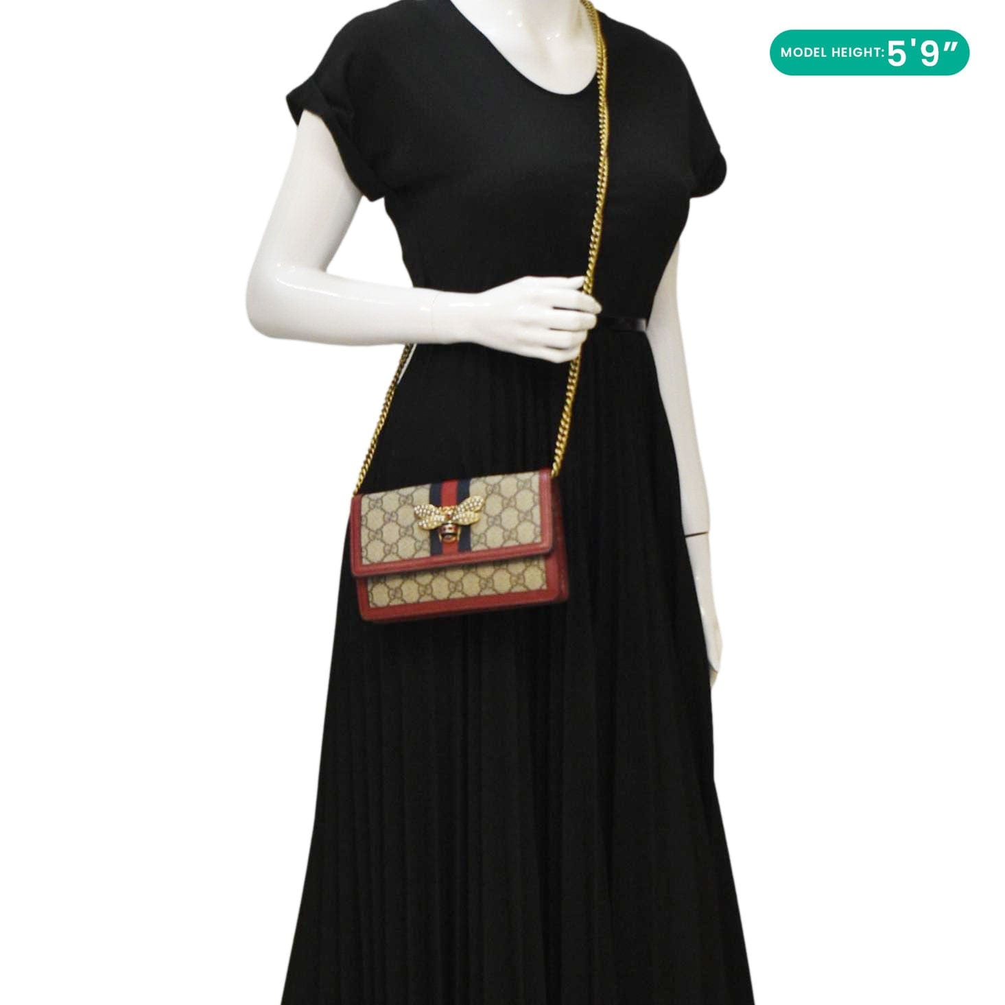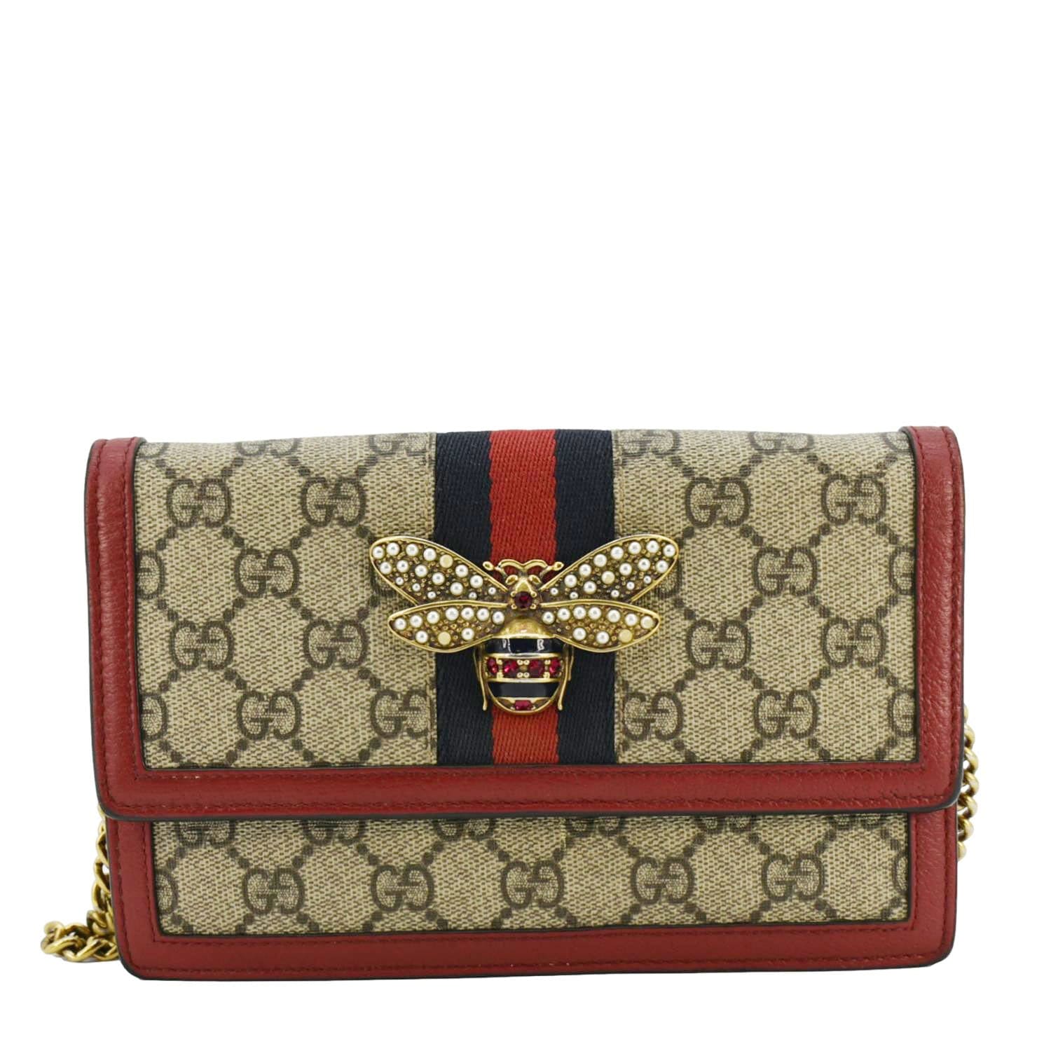 The GUCCI Web Queen Margaret Mini GG Supreme Canvas Chain Wallet in Beige combines the classic GG canvas with a blue-red web stripe and jeweled bee detail. Compact and chic, it’s ideal for a stylish, hands-free look.