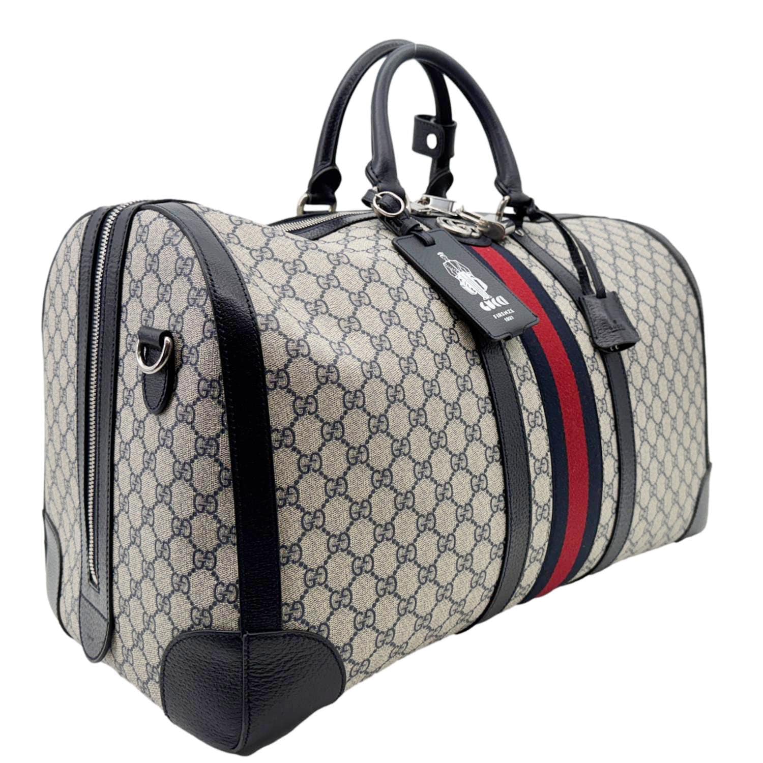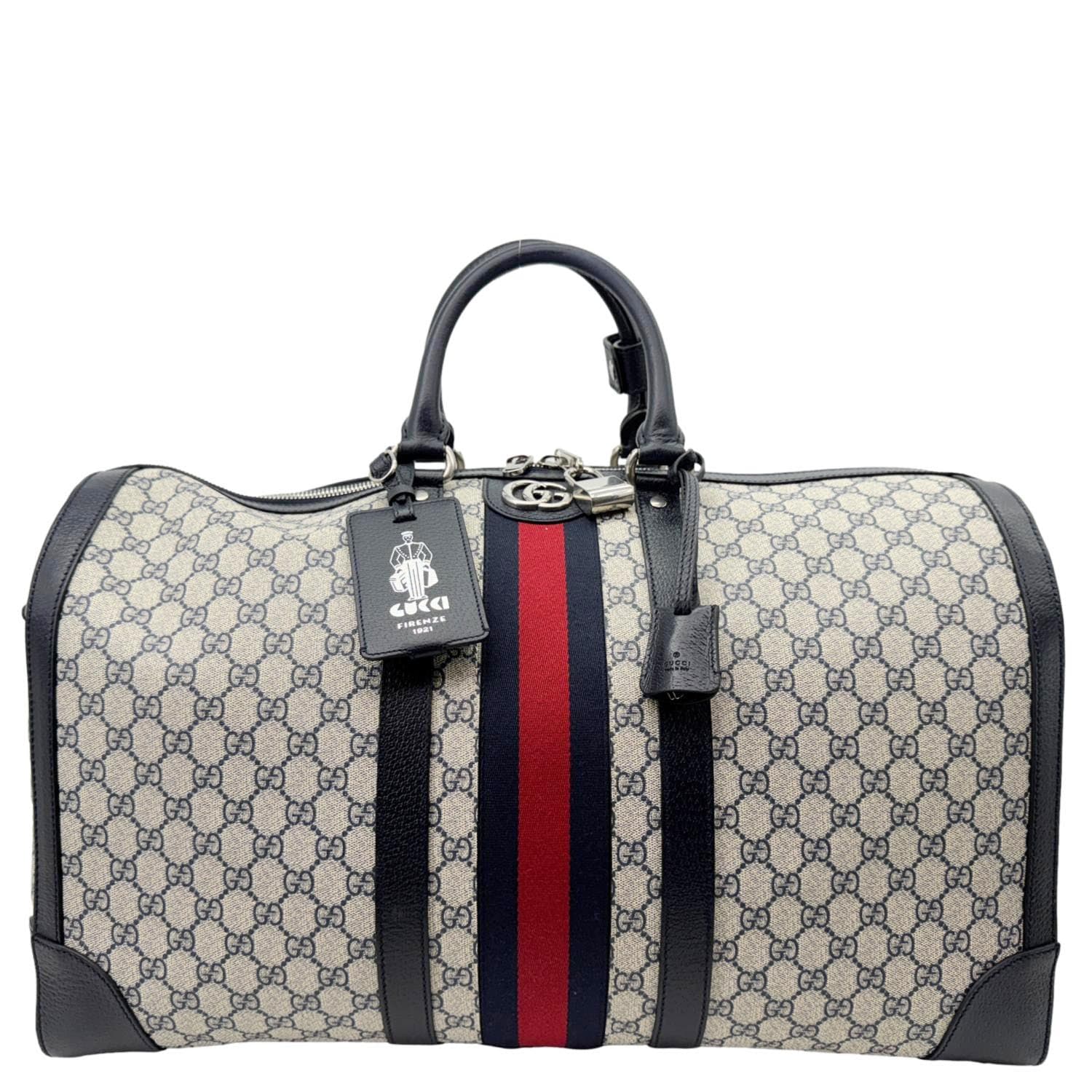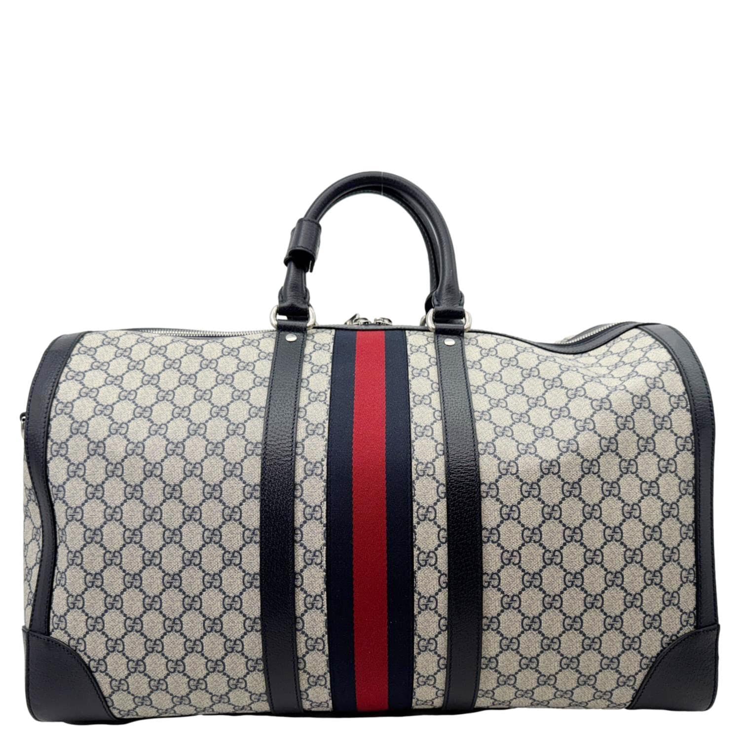 The GUCCI Savoy Large Duffle Bag is crafted in beige and navy blue GG Supreme canvas with a signature Web stripe and leather trim for a timeless, sporty look. Spacious and stylish, it’s perfect for travel or weekend getaways.