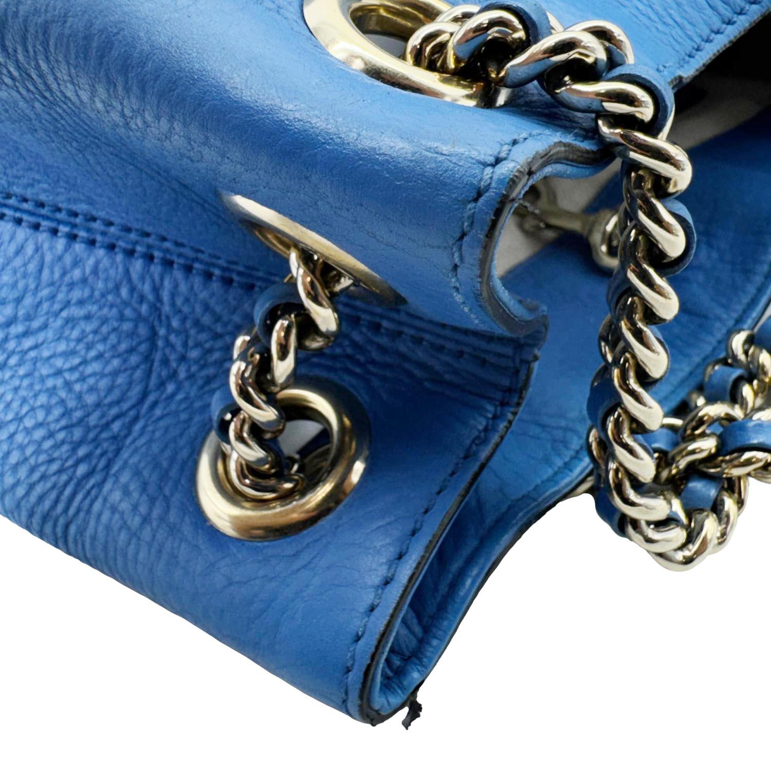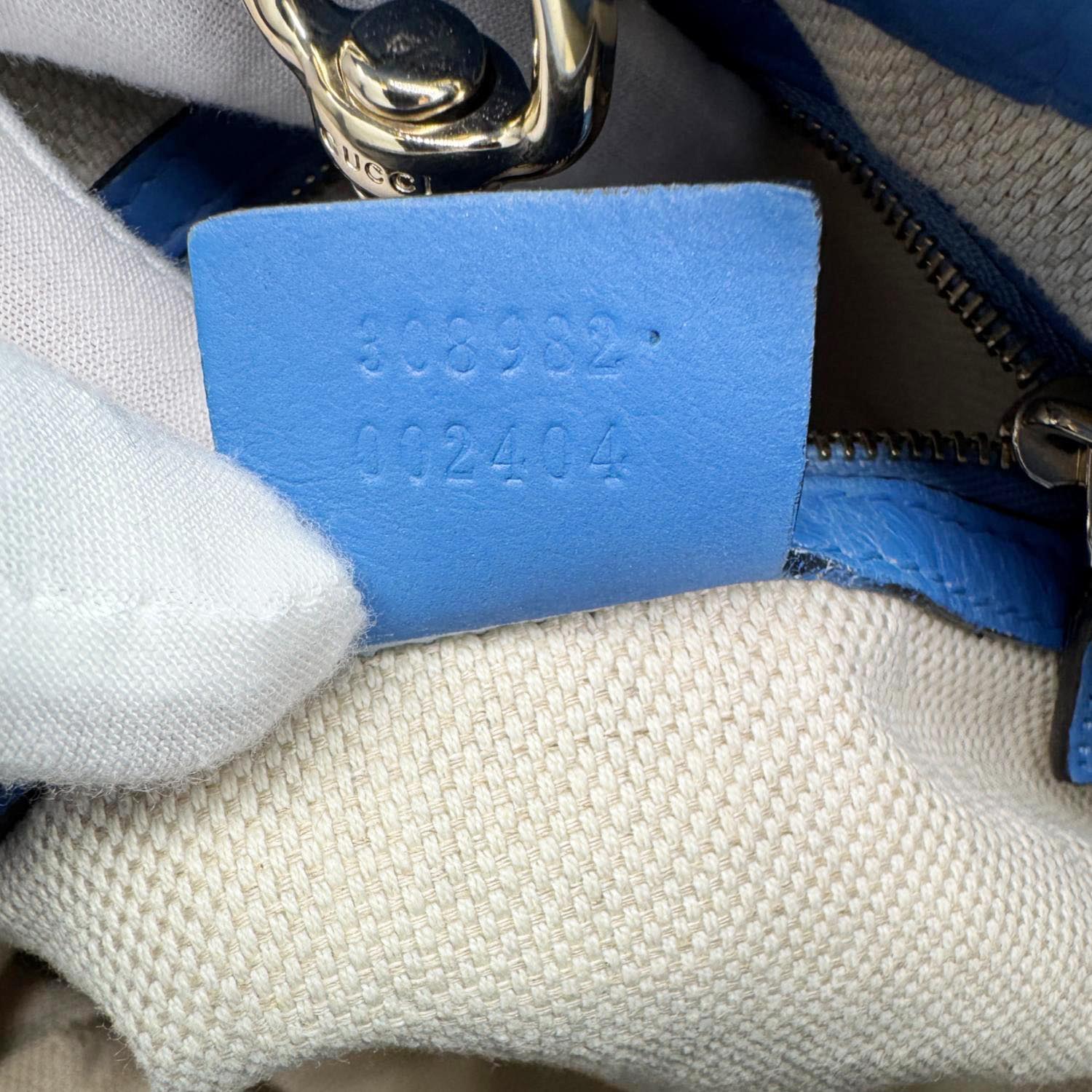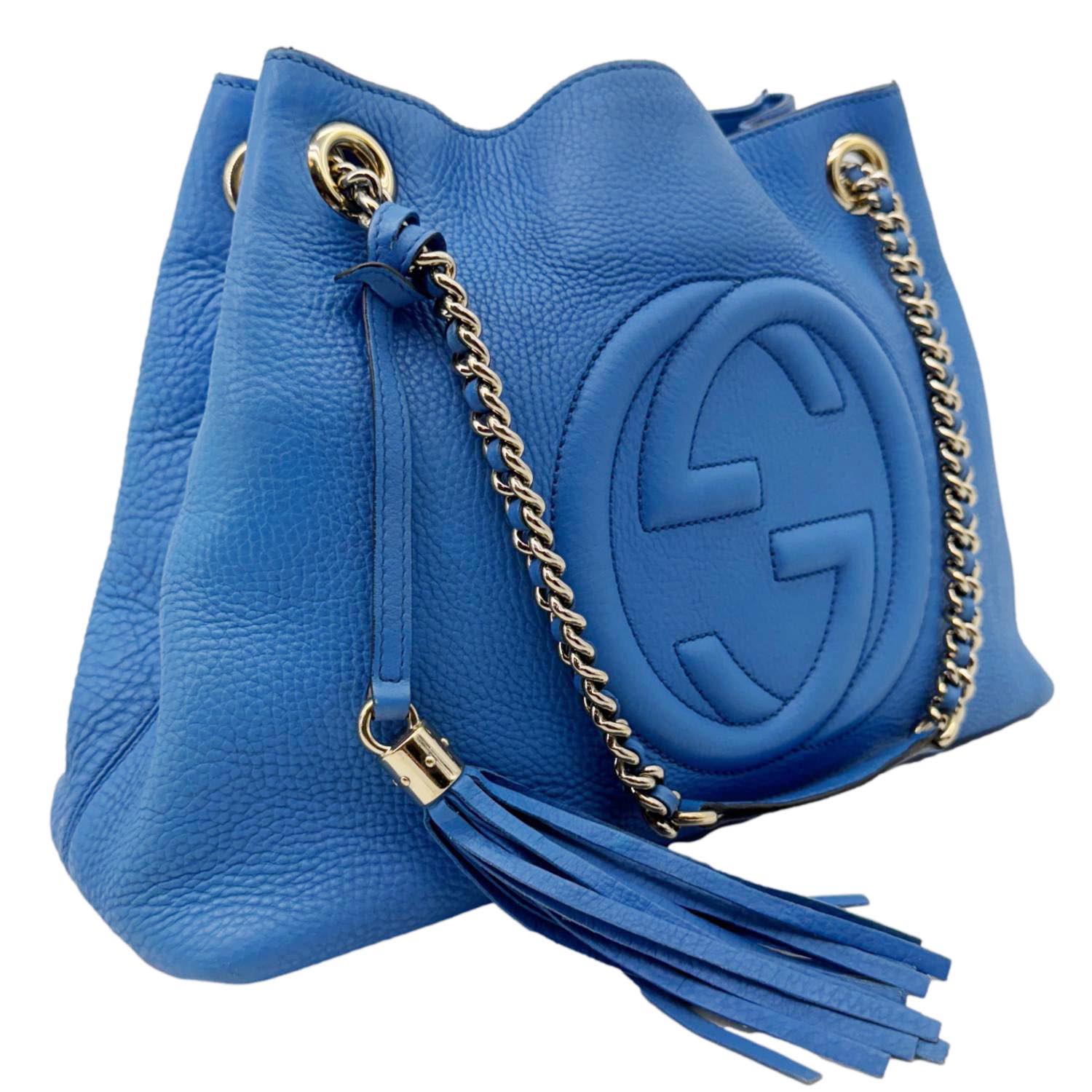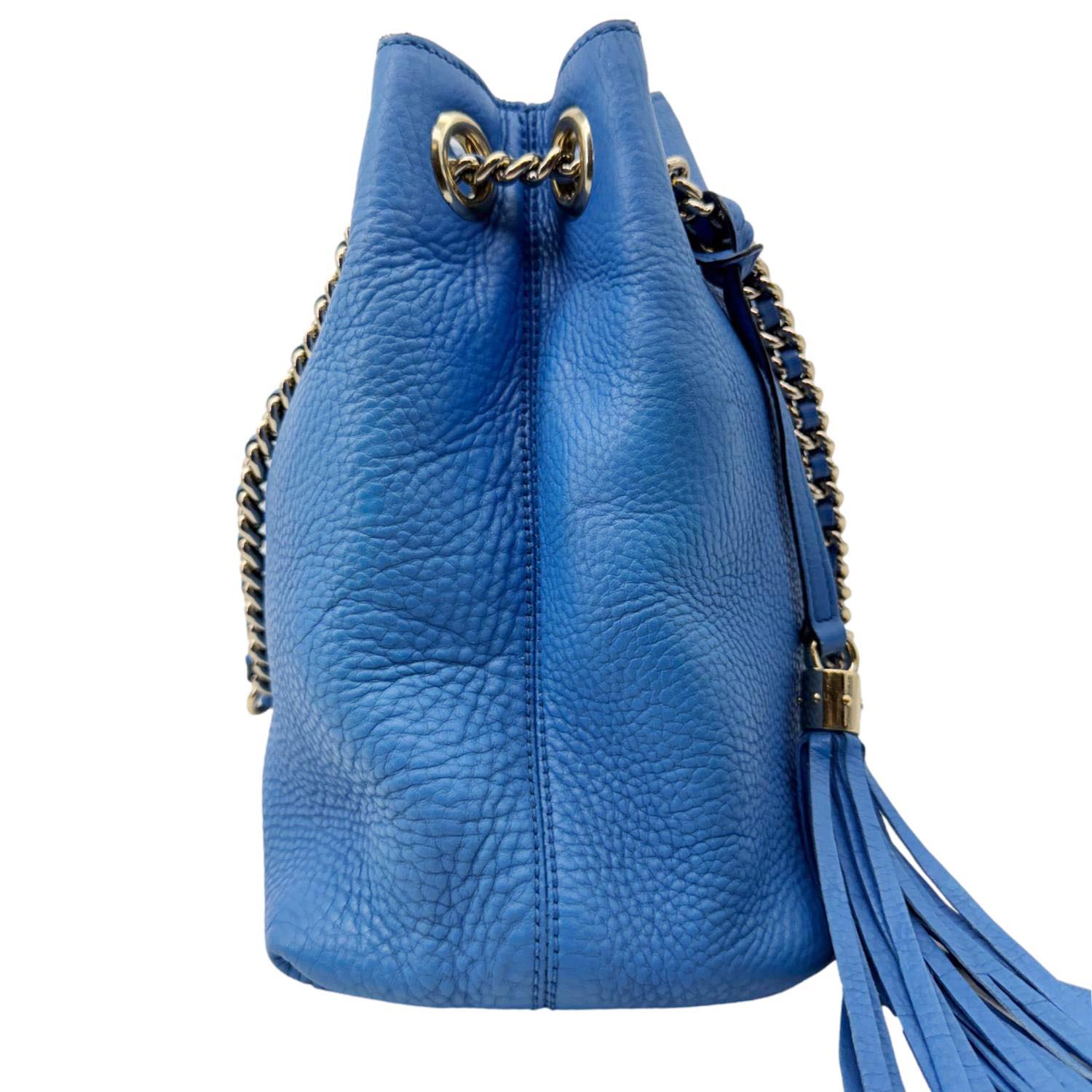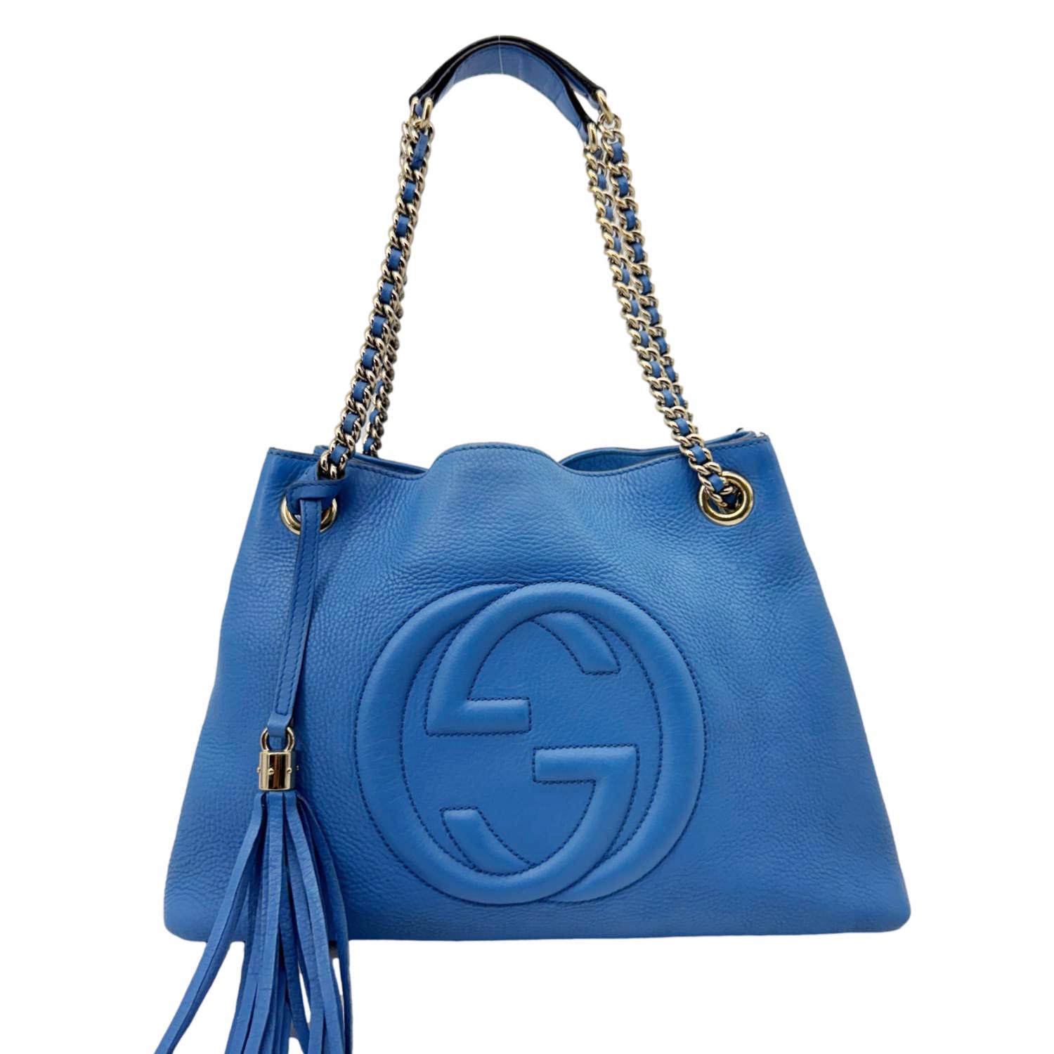 The GUCCI Soho Medium Shoulder Bag in Blue Pebbled Leather features the iconic interlocking GG logo and a playful leather tassel. Spacious and stylish, it offers a relaxed silhouette perfect for everyday sophistication.